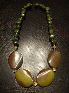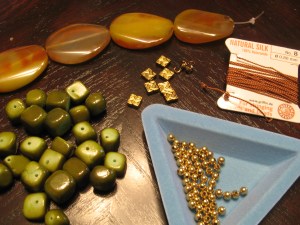 After making the Teal Multi-Strand Necklace that took a few mishaps before getting right I decided my next necklace should be something a bit simpler. So I opted for a basic stringing technique to string semi-precious dyed agate oval beads and dark green dyed jade nuggets using natural silk bead cord in carnelian size 8 – even though you can’t see the thread I still like to use a color that’s complementary to the beads. I also used gold-tone beads as spacers between the jade nuggets and some left-over metal pieces from my Necklace Makeover as spacers between the agate beads.
