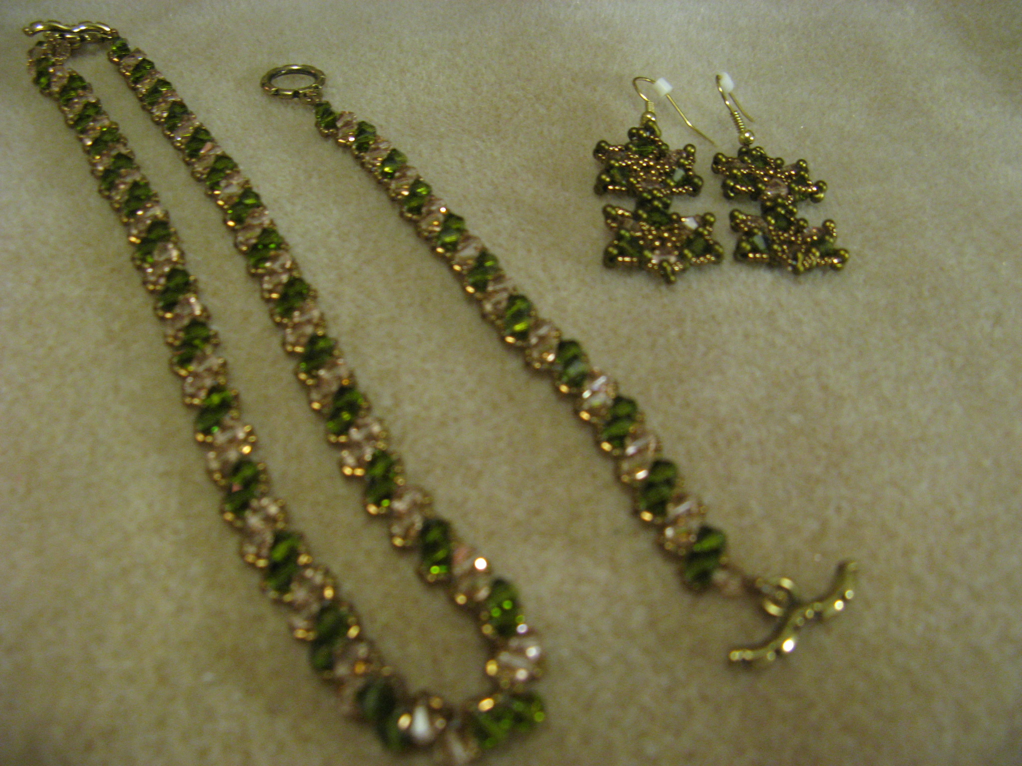 Recently I used different beading techniques to create jewelry sets with Swarovski crystals as the focal point. The set on the left was made with 4mm bicones in Olivine and Vintage Rose (O&VR) while the set on the right was made with 4mm bicones in Blue Zircon and Padparadscha (BZ&P).
