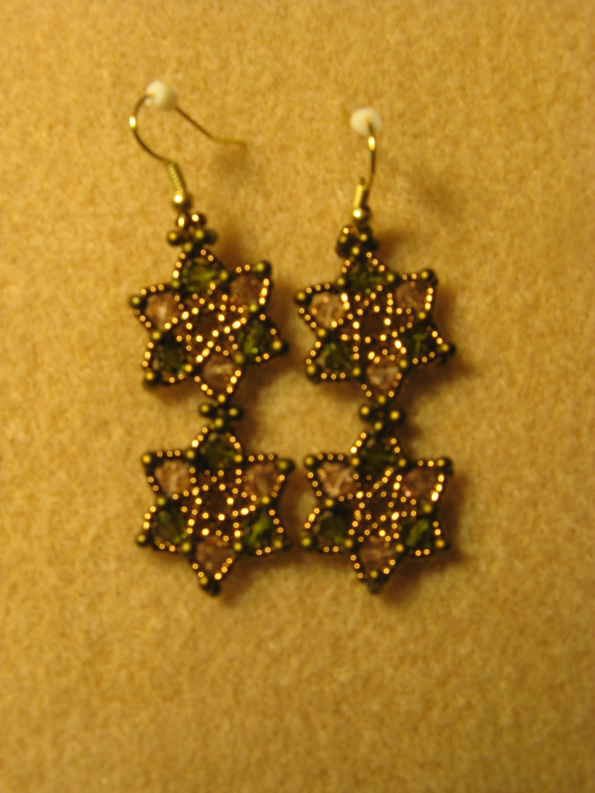 Star Power Earrings: Unfortunately Bead & Button doesn’t provide the pattern for free, but, it can be purchased here. I modified the pattern by only using two stars as opposed to three. As for supplies, along with the crystals I also used TOHO seed beads in size 11 and 15 in the color bronze and 2x4mm peanut seed beads in matte metallic light golden brown for the O&VR set. As for the BZ&P set, I used silver-lined crystal seed beads in size 11, TOHO seed beads in silver-lined gray in size 15 and 2x4mm peanut seed beads in matte hematite. FYI, the only place that I have been able to find peanut seed beads is on Fusion Beads. Fusion Beads also has a full list of supplies here for the earrings.