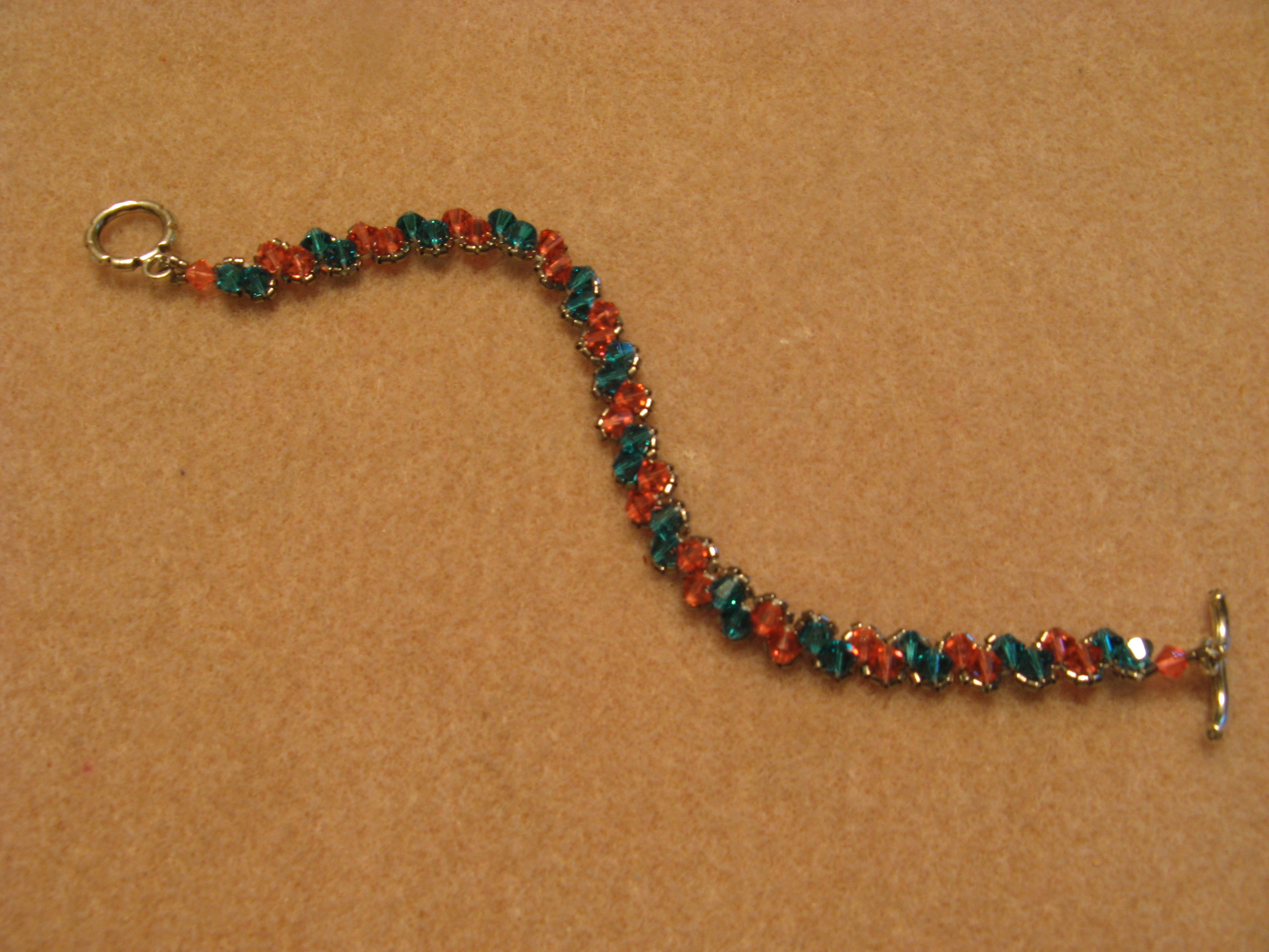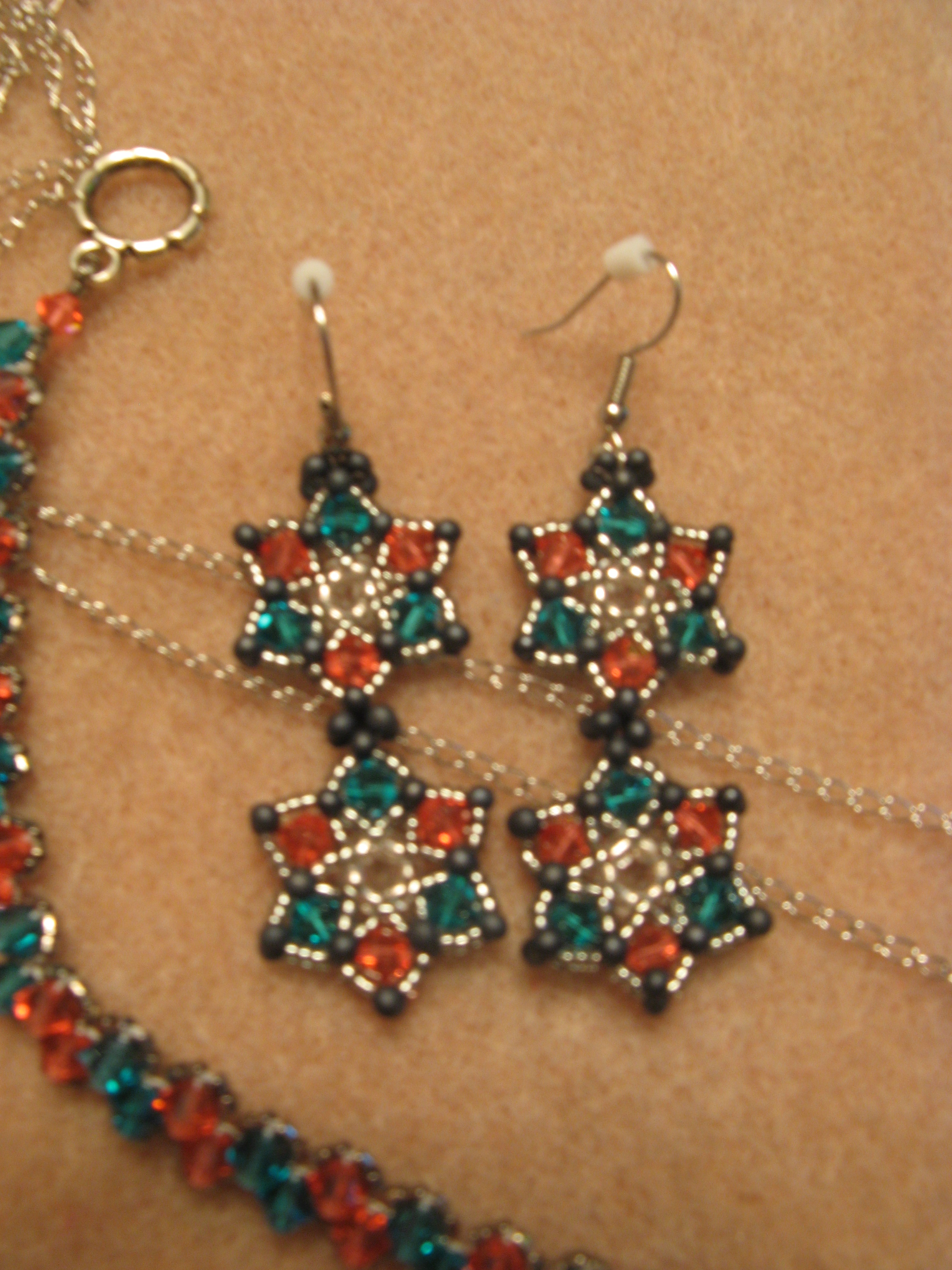 For the earrings I followed a pattern that I came across in the Bead & Button magazine from June 2011 called Star Power. The technique used is a basic Netting technique. While the link doesn’t provide exactly what I did, the concept is more or less the same.