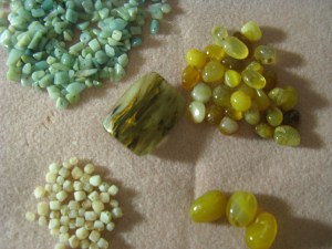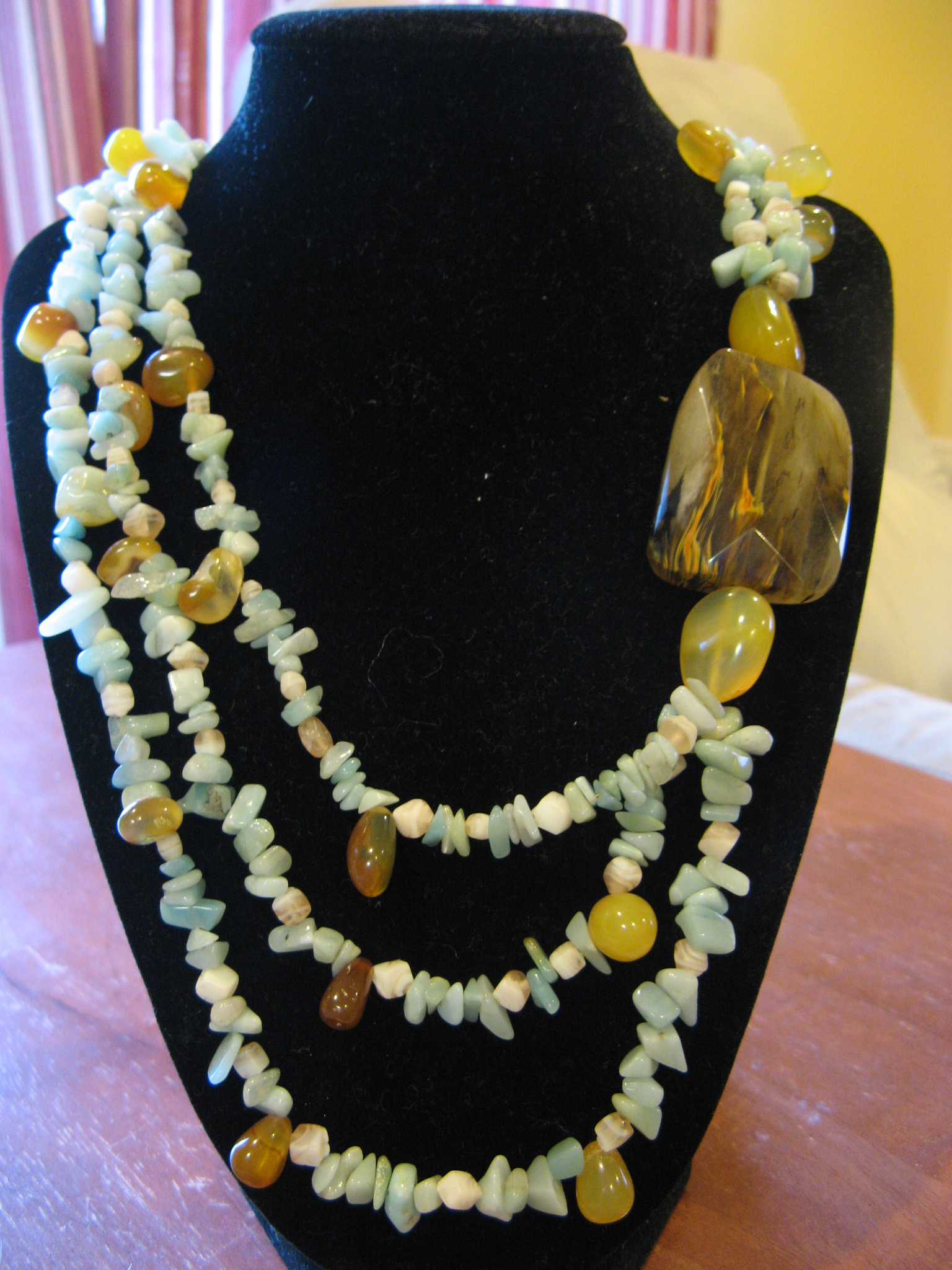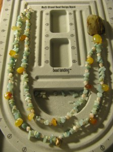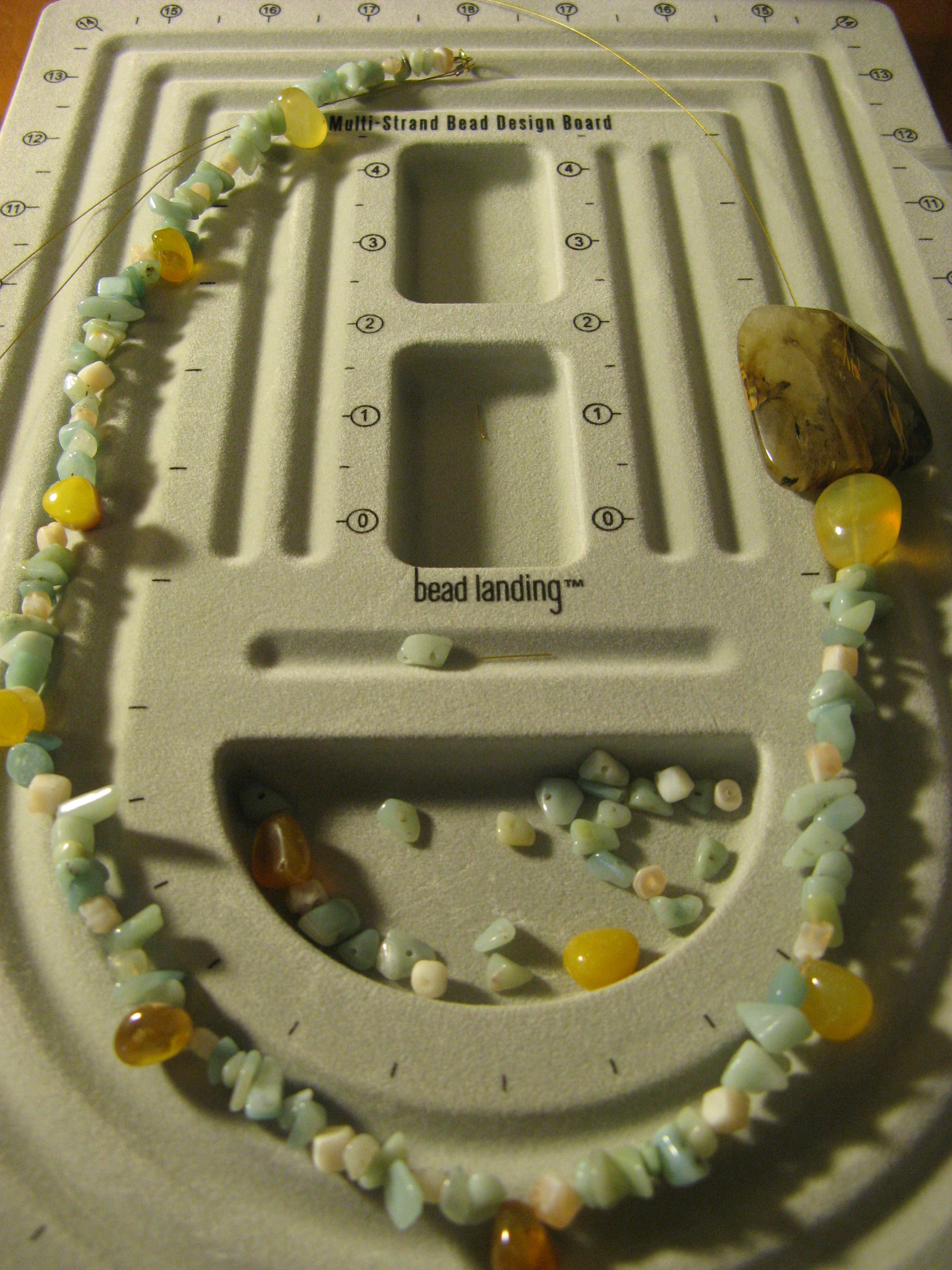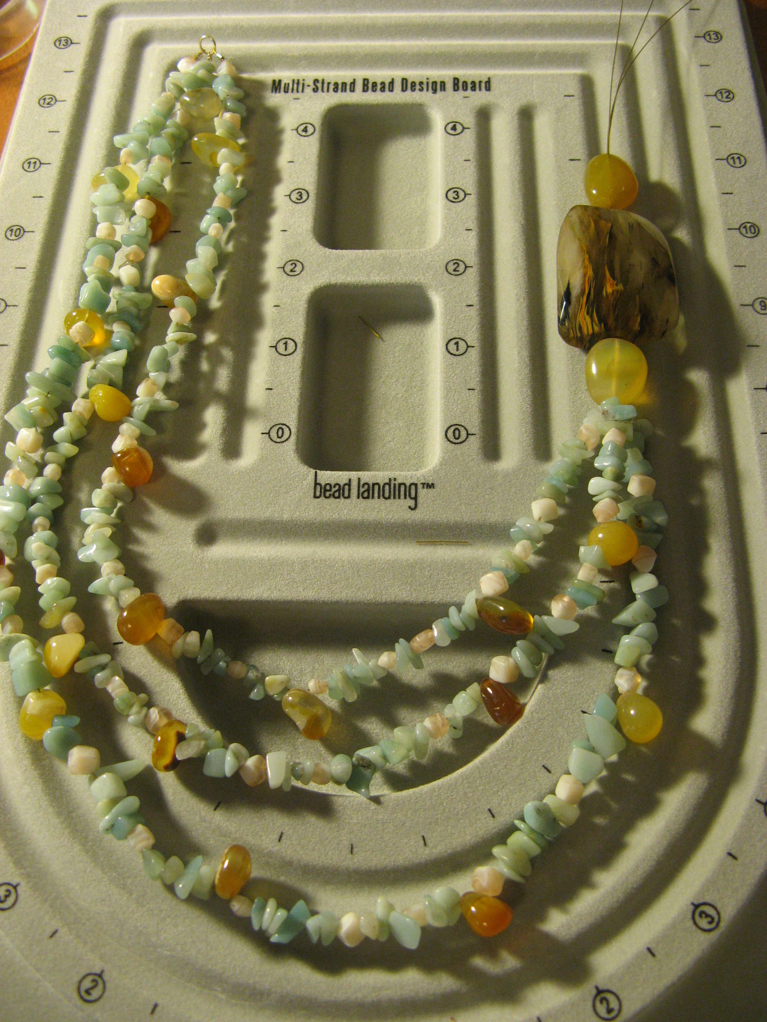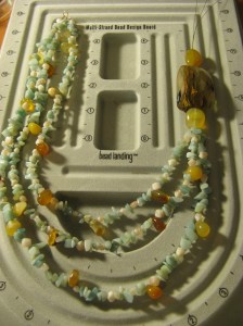 Without a definitive pattern I strung the Amazonite chips along with the bicones and stone nuggets on three separate strands of gold beading wire. The only thing I did make sure of was that the stone nuggets were placed along the three strands so that they wouldn’t be next to each other. I then had the three strands go through one of the larger yellow stone nuggets, the Tigerskin glass bead and another larger yellow stone nugget and then continued in my haphazard pattern of stringing the chips, bicones and smaller nuggets.