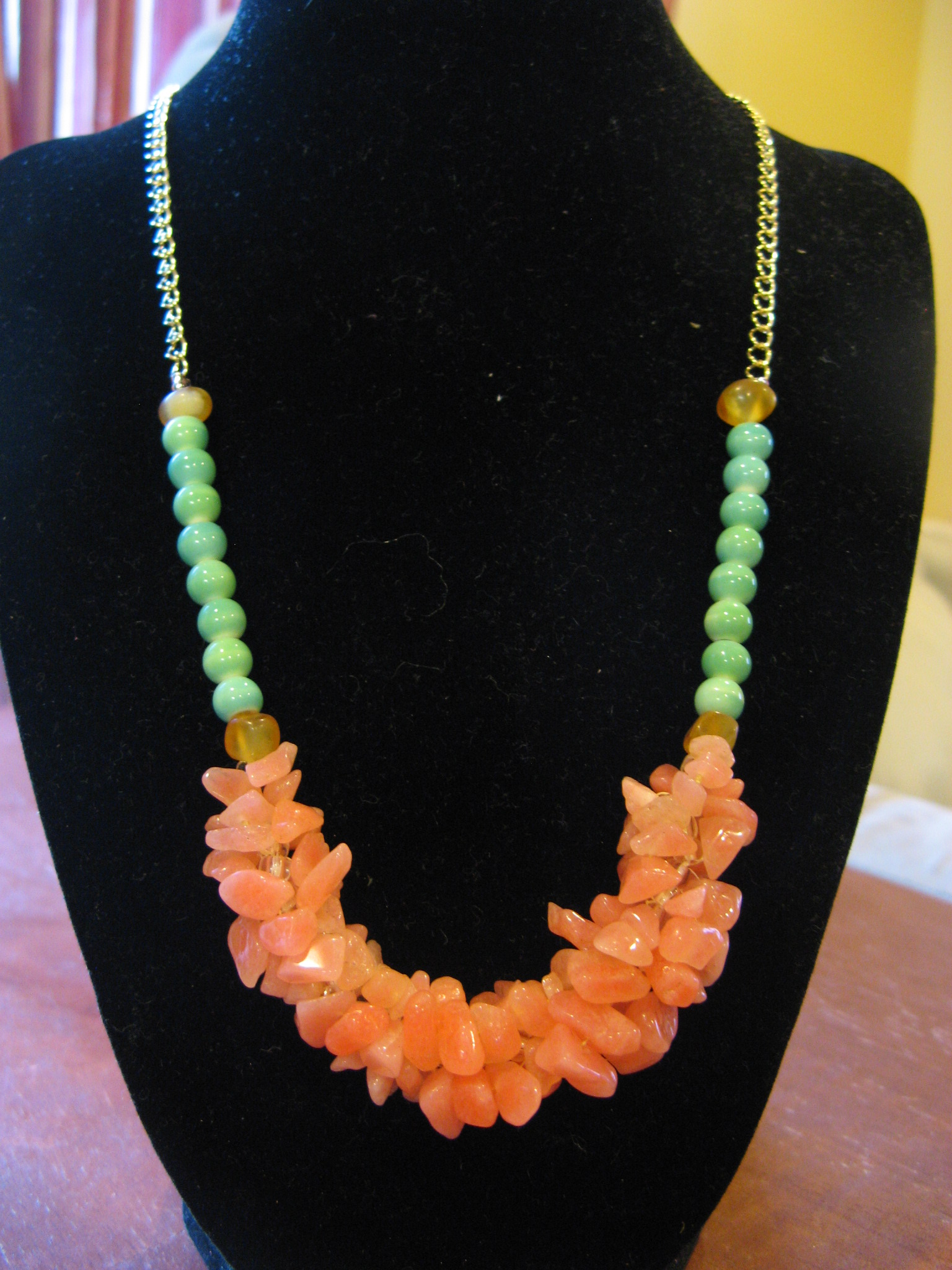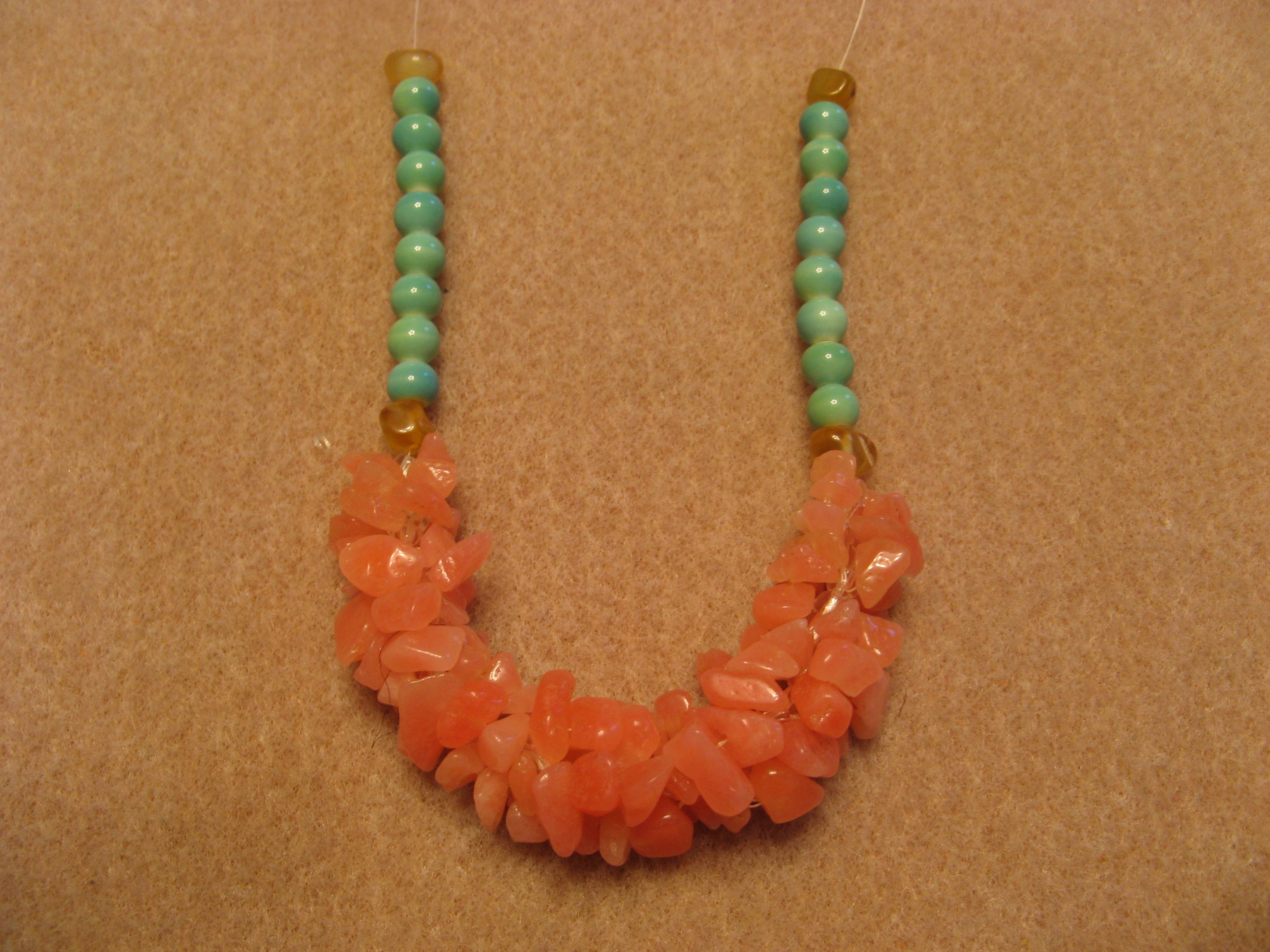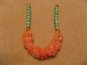 Using a basic spiral rope chain technique I strung the coral chips along with clear glass beads in a size 6. I then decided to use small yellow-brown stones I had along the ceramic beads to create the focal piece.