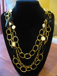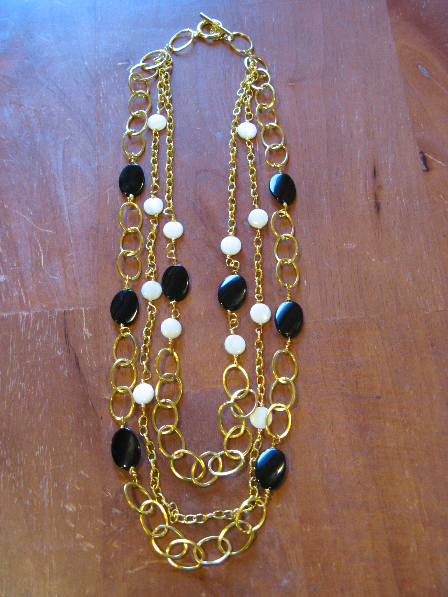 Using black glass beads, white shell beads, two different size gold link chains and wire I created this multi-strand necklace.
