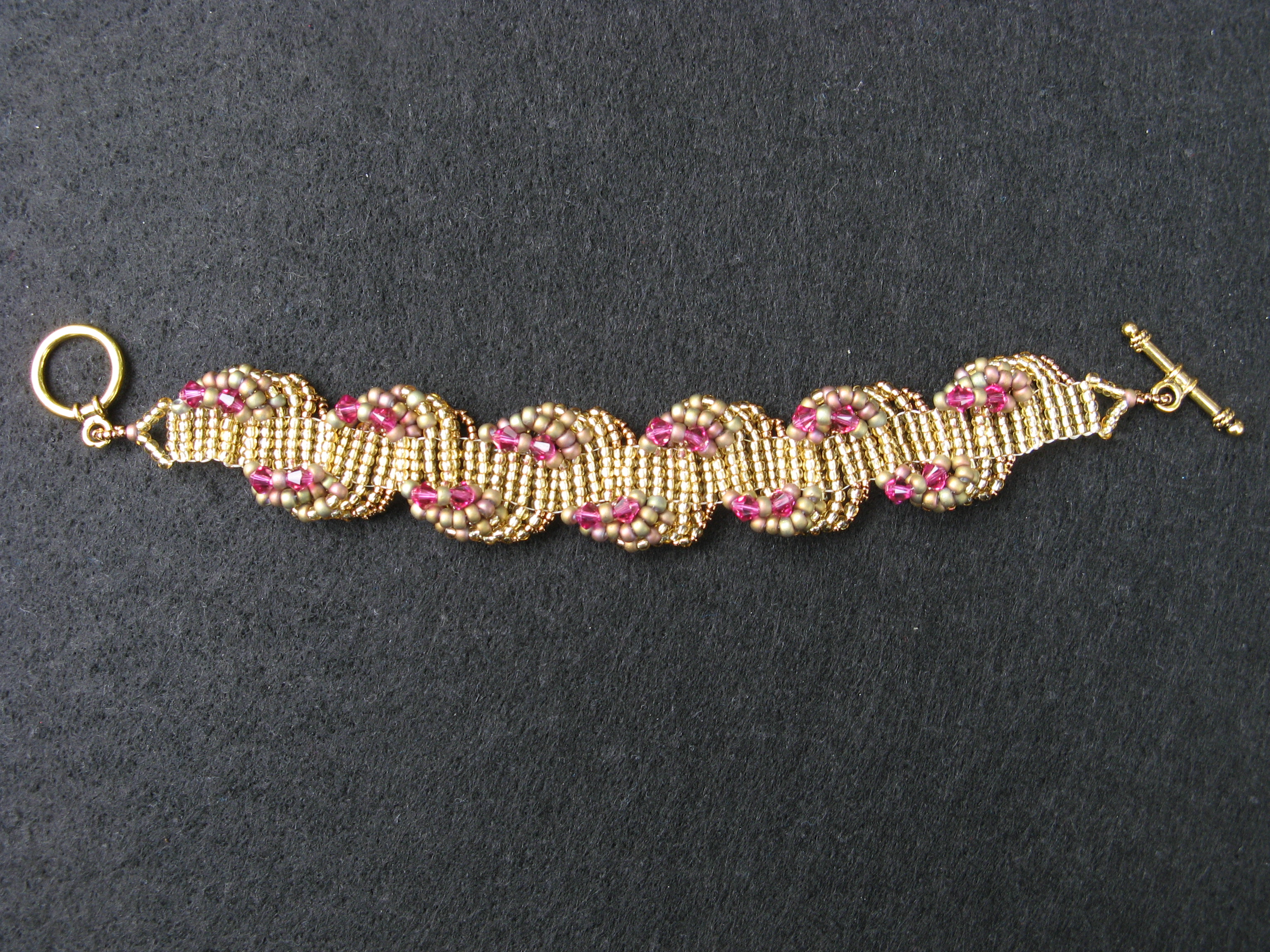 Crystal and Seed Bead Wave Bracelet – Made with fuchsia crystals and yellow-tones seed beads.