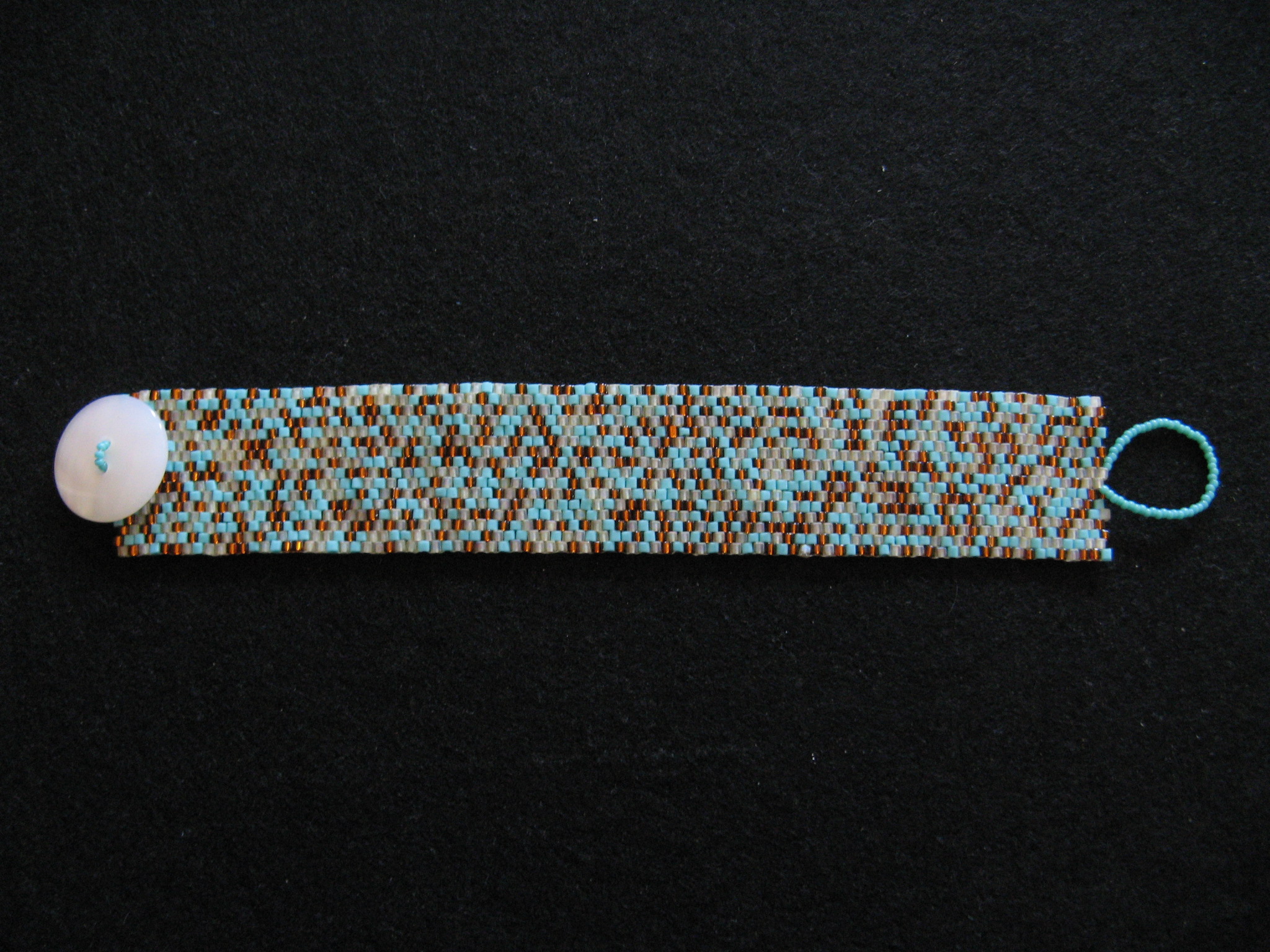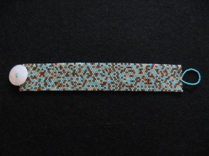Flat Even-Count Peyote Bracelet – Made with transparent ivory, turquoise and topaz 1.5mm cube beads stitched in a haphazard pattern. I used an actual button for the clasp.