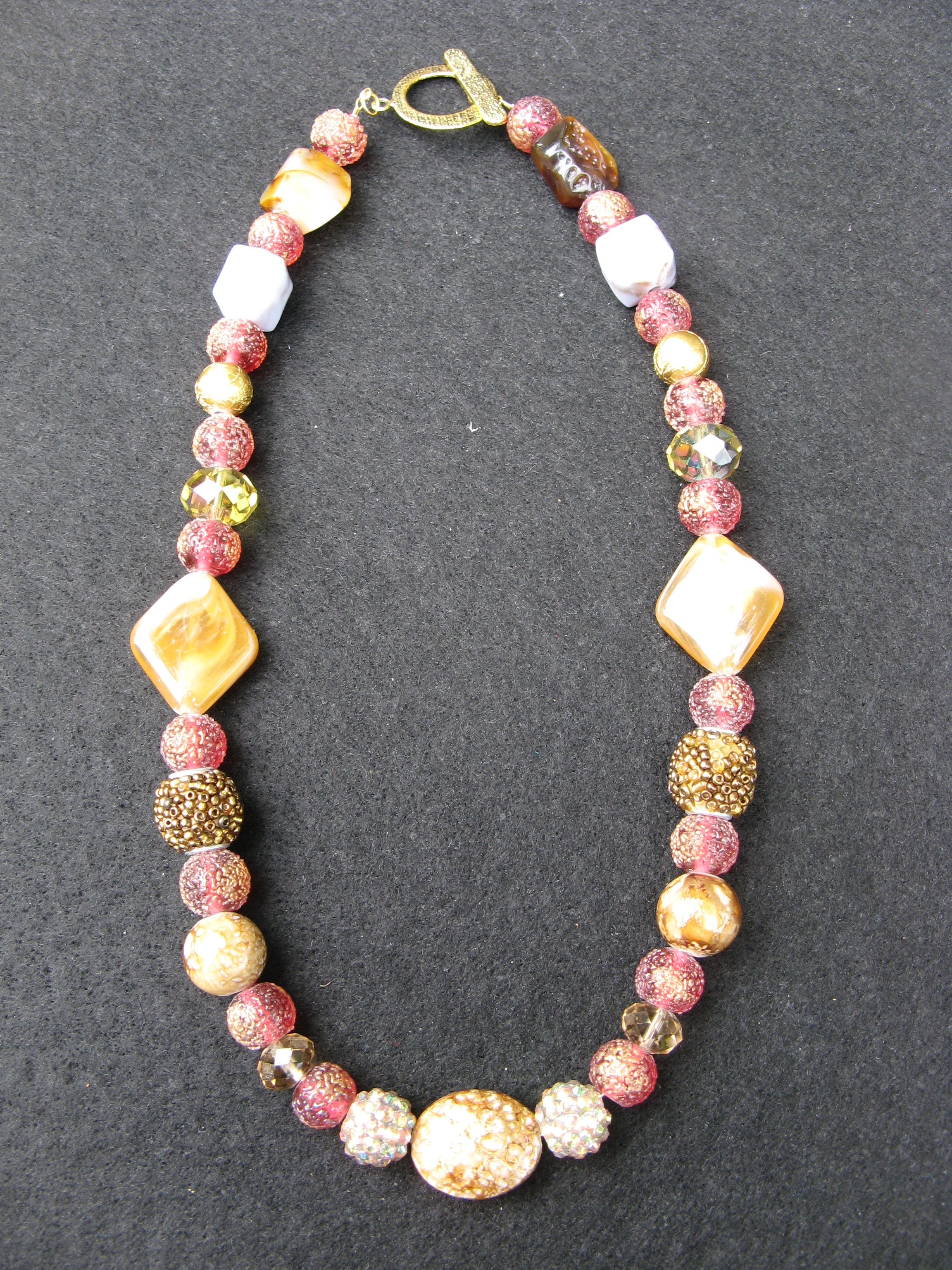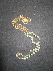 Freshwater Pearl Necklace with Crystal accents – I actually saw a similar necklace in a recent issue of Stringing magazine but it was strung from silk cord. I initially did use silk cord but didn’t like the way the necklace fell so I opted to use gold chain instead.
