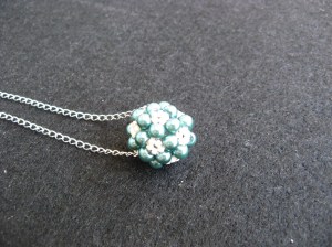 Glass Pearl Beaded Ball – This was an experiment gone right. I normally make beaded balls using crystals but saw it one day made with glass pearls so I decided to give it a try and was very happy with the outcome. Up close the ball almost looks like it’s comprised of small flowers.