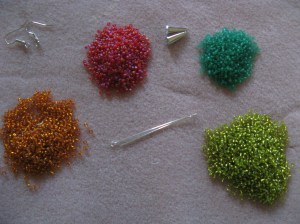 First things first I picked out the four colors I wanted to use. Being that I only had silver bead cones in my beading supplies I was limited to colors that would look good with silver. Since its summer time I opted for bright colors.