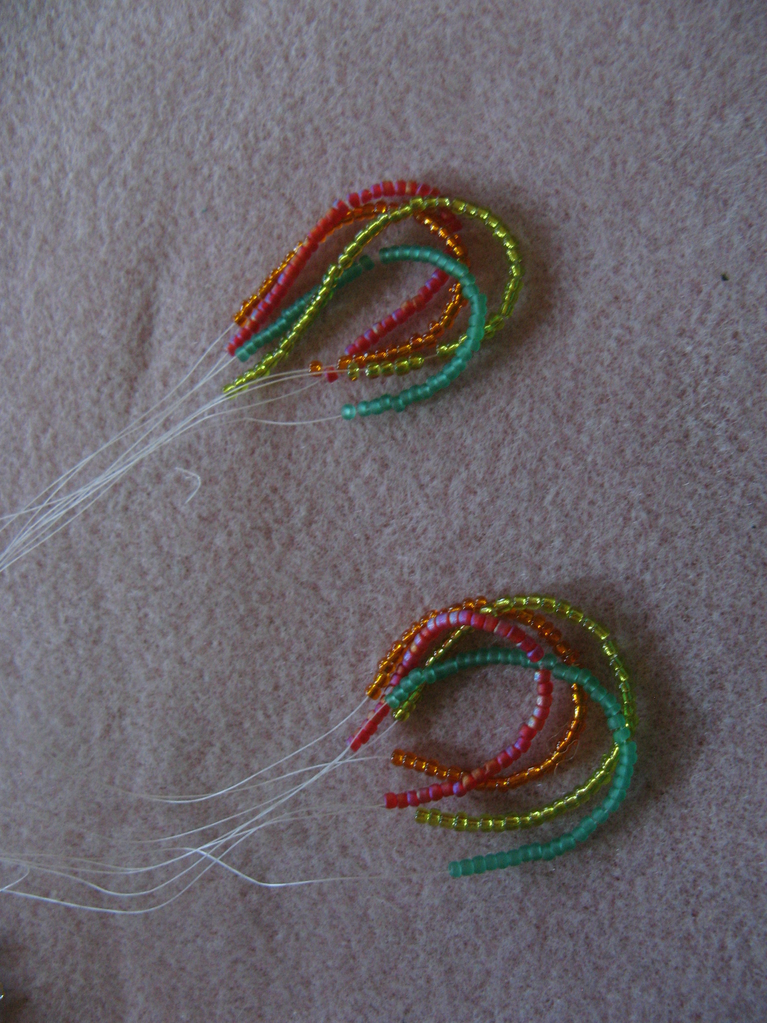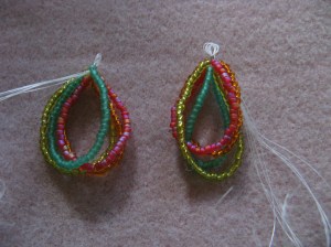 Next, I strung the beads on my thread. Since I wanted the earrings to have a little dimension to them I opted to string a different amount of seed beads on each of the threads. Afterwards I looped the thread through a crimp bead and crimped it.