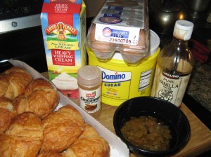 My ingredients were pretty simple: Croissants, Eggs, Heavy Whipping Cream, Sugar, Cinnamon, Vanilla Extract and Rum soaked Golden Raisins.