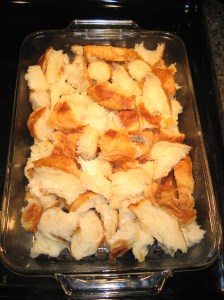 I started off by slicing nine croissants in half and tearing up the bottom halves and placing them in a greased glass baking dish – I usually just use Baking Cooking Spray. I then placed the top halves right on top.
