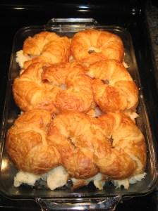Once that was all combined I poured the mixture over the croissants and pressed them down with a spatula to ensure that they would soak up all of the custard. I let this stand for about 15 minutes before placing it in a 350 degrees F preheated oven.
