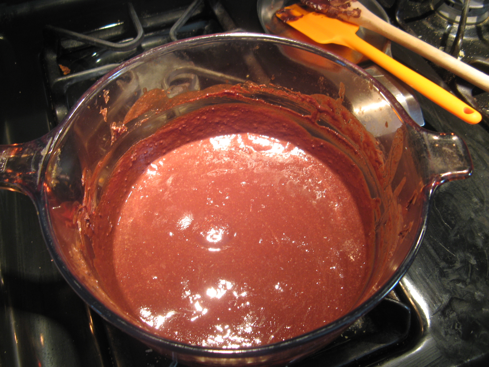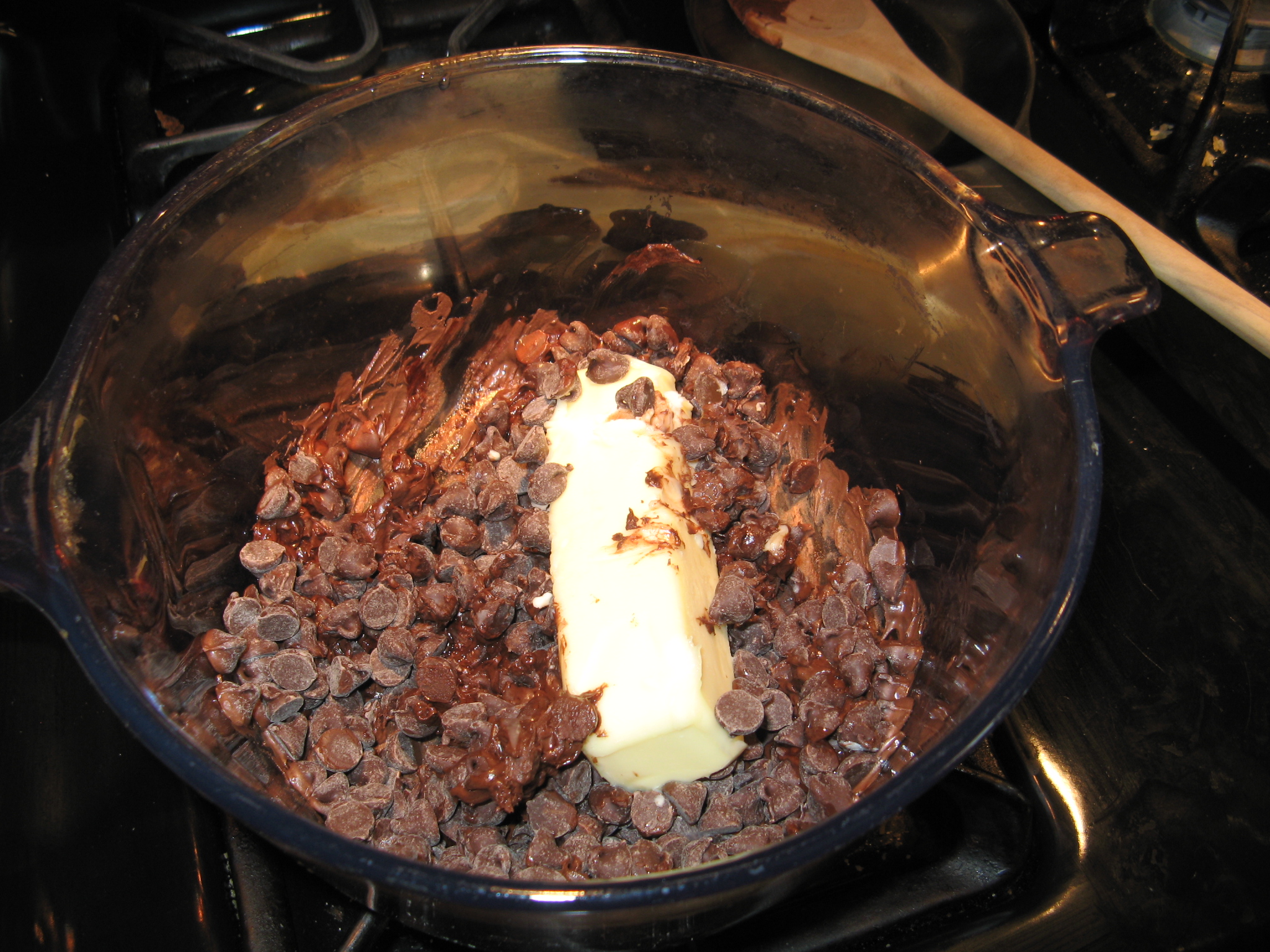 I started off by melting the chocolate chips and butter in a saucepan over low heat.