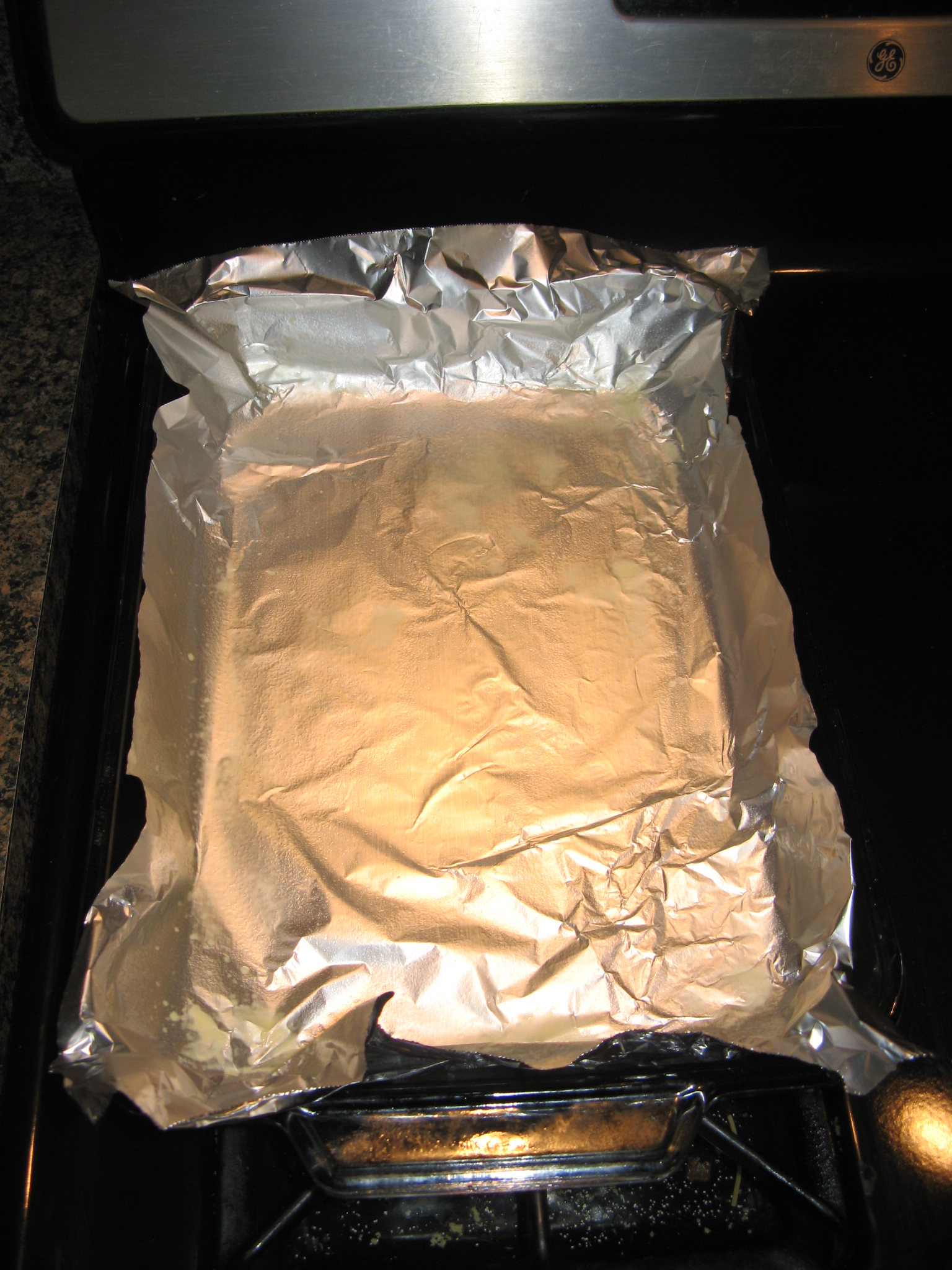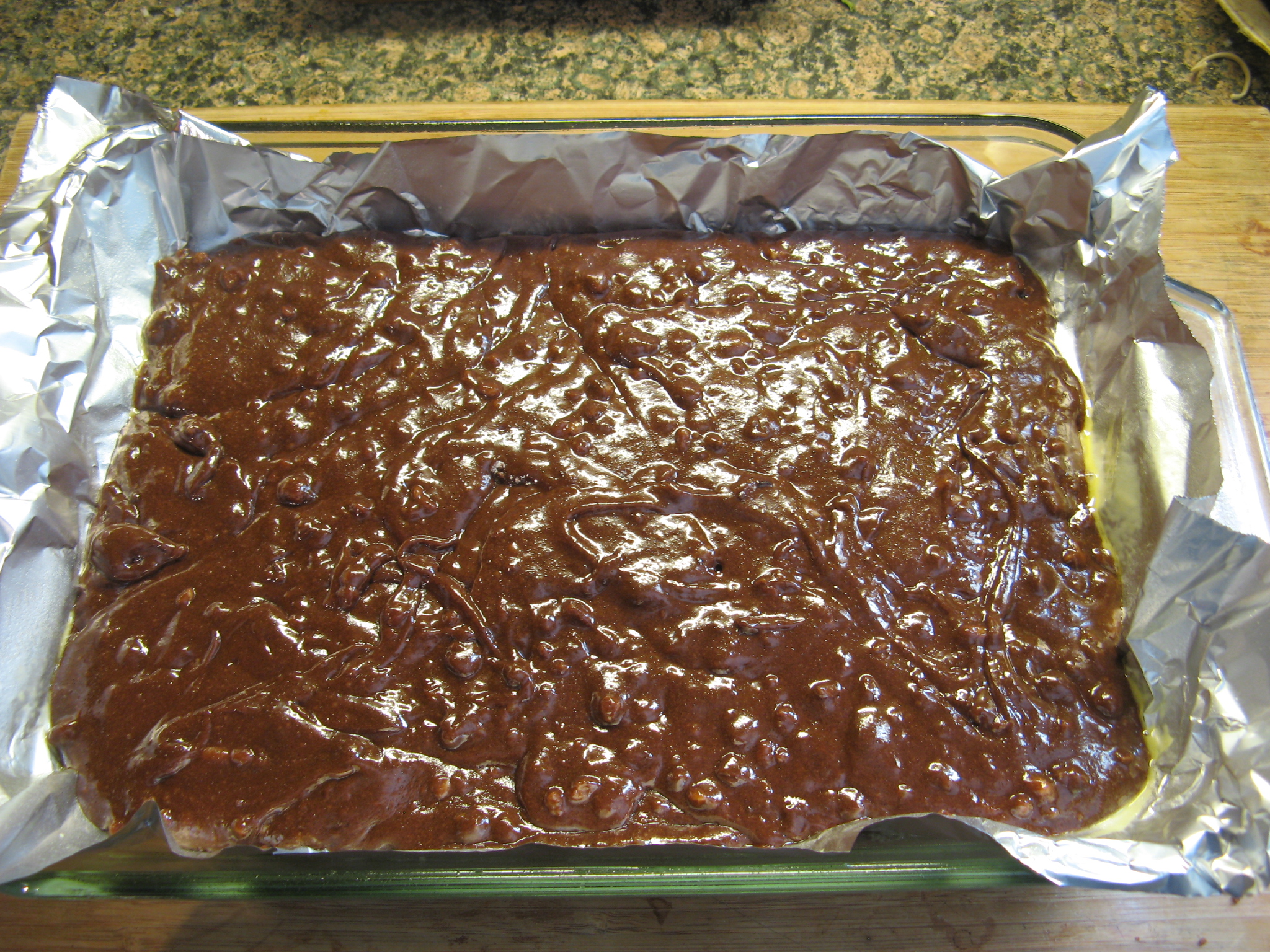 In prepping my baking dish I decided to go with the easy removal method and sprayed my dish with baking spray, lined it with aluminum foil ensuring that it was a large enough piece to overhang at the ends and then sprayed the aluminum foil with the baking spray. Once the batter was ready I spread into the prepared dish.