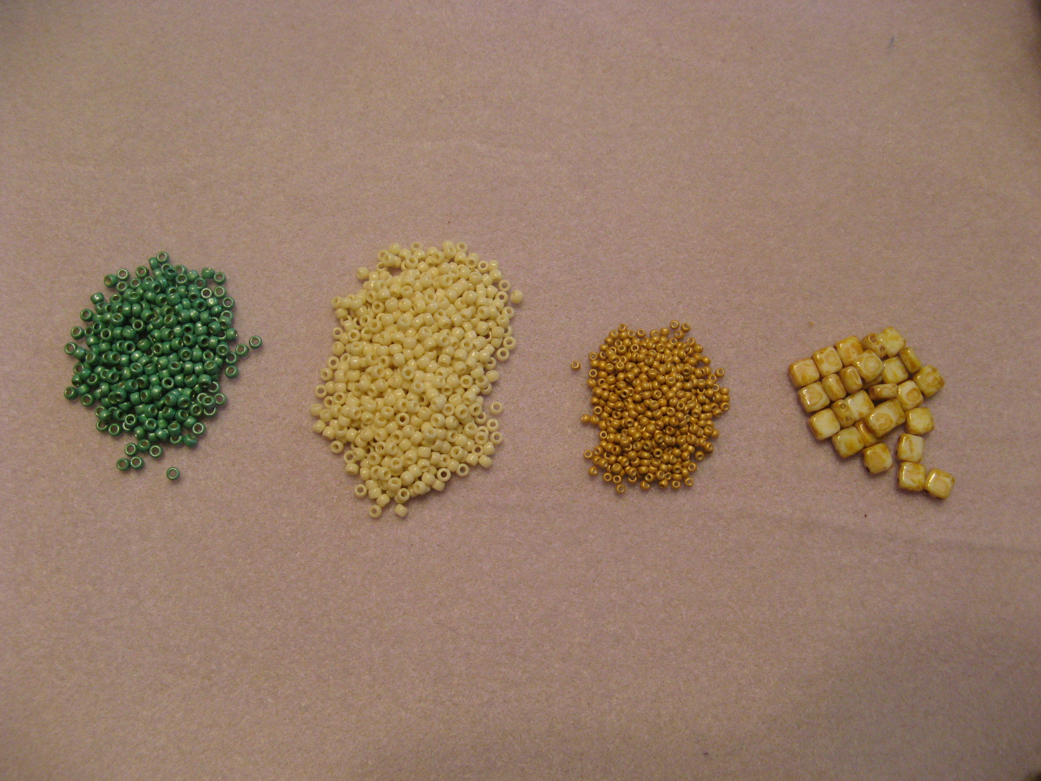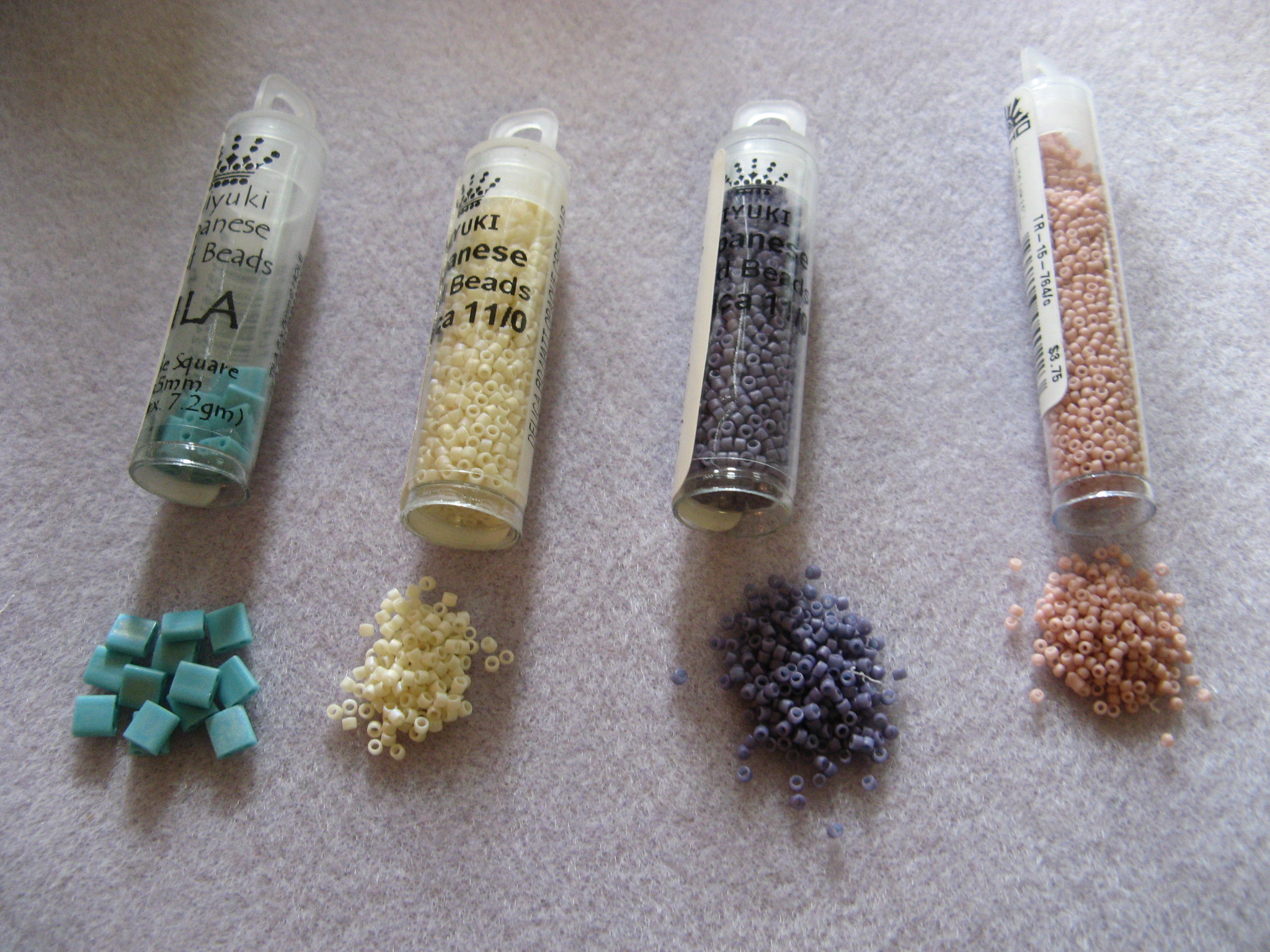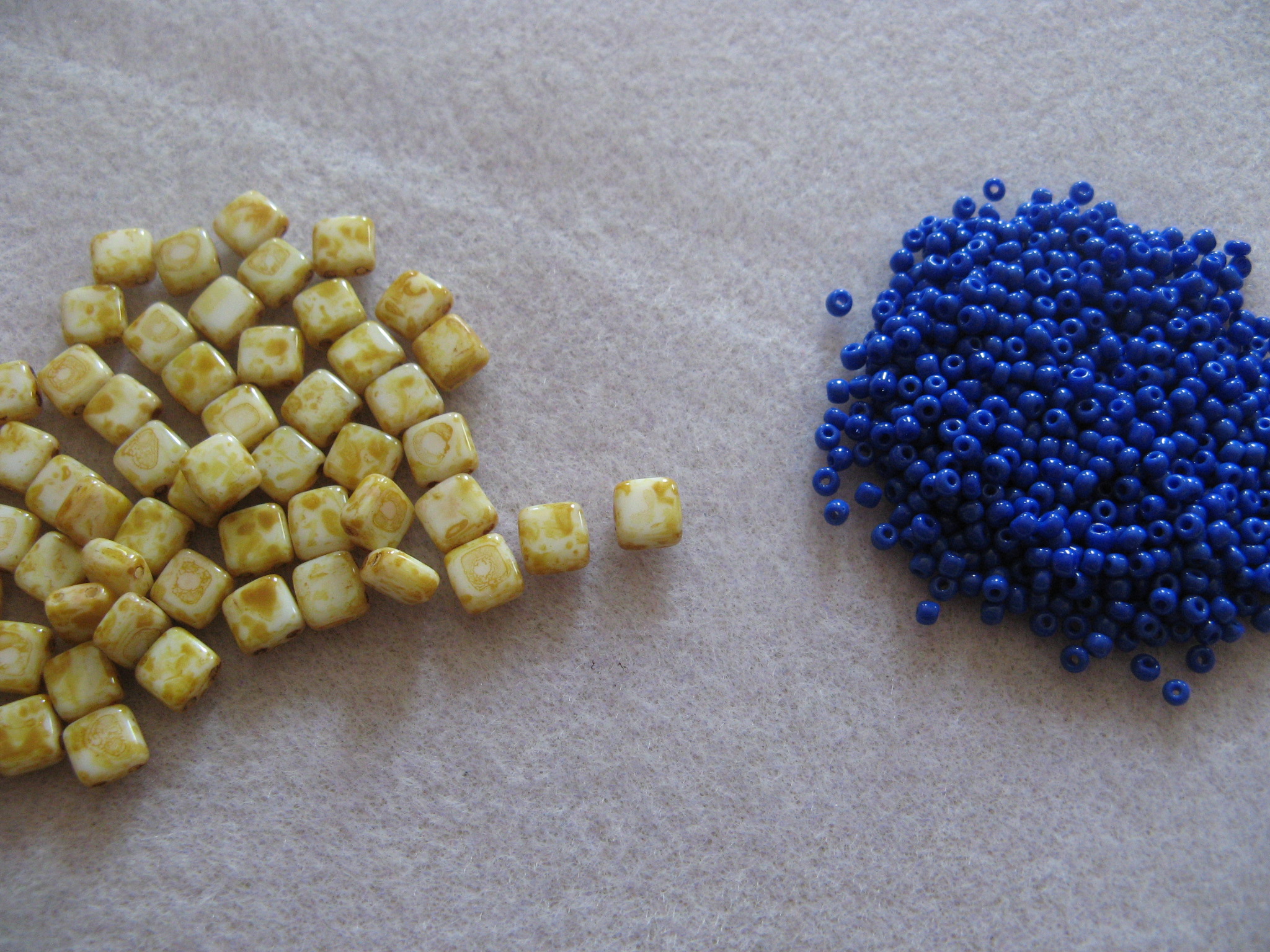 I opted to go with Czech Tile beads, Size 8 seed beads in 2 colors and Size 11 seed beads. Czech Tile and Miyuki Tila beads are similar in that they are square beads with two holes but they differ in that Tila beads are 5mm and Tile beads are slightly larger at 6mm and are more rounded around the edges and corners. Because of that roundness I prefer the look that Tile beads give a bracelet over Tila beads.