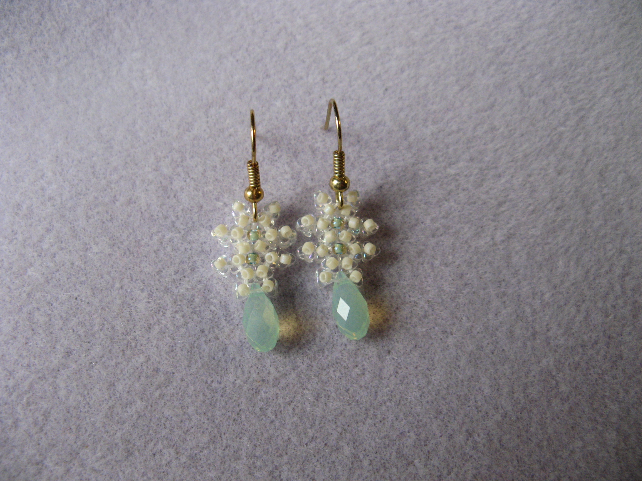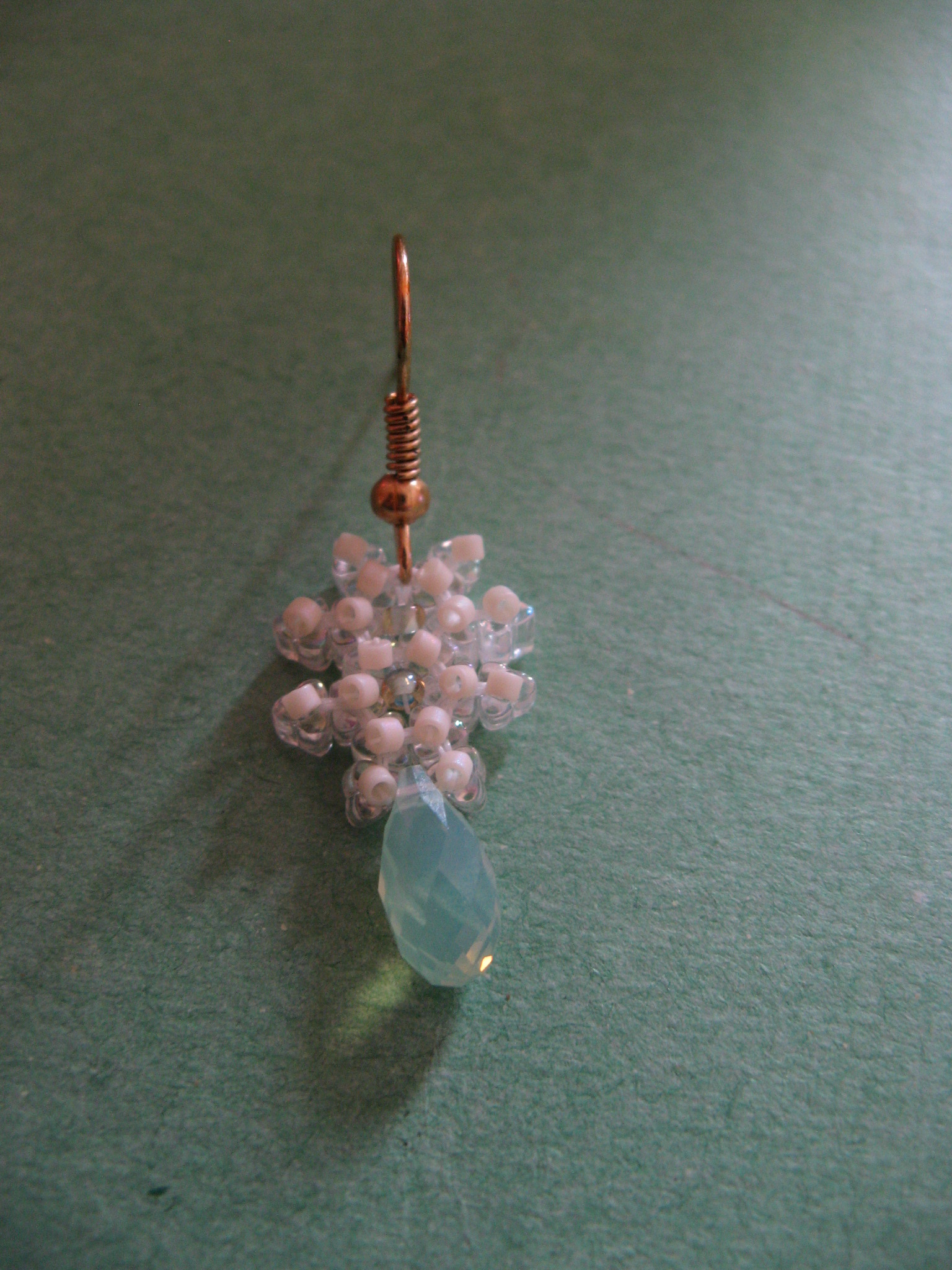 I then stitched a Delica bead to the front of each of the triangles and a Size 11 seed bead to the two centers of the base units. I attached an earring finding to the top and as simple as that the earrings were done.