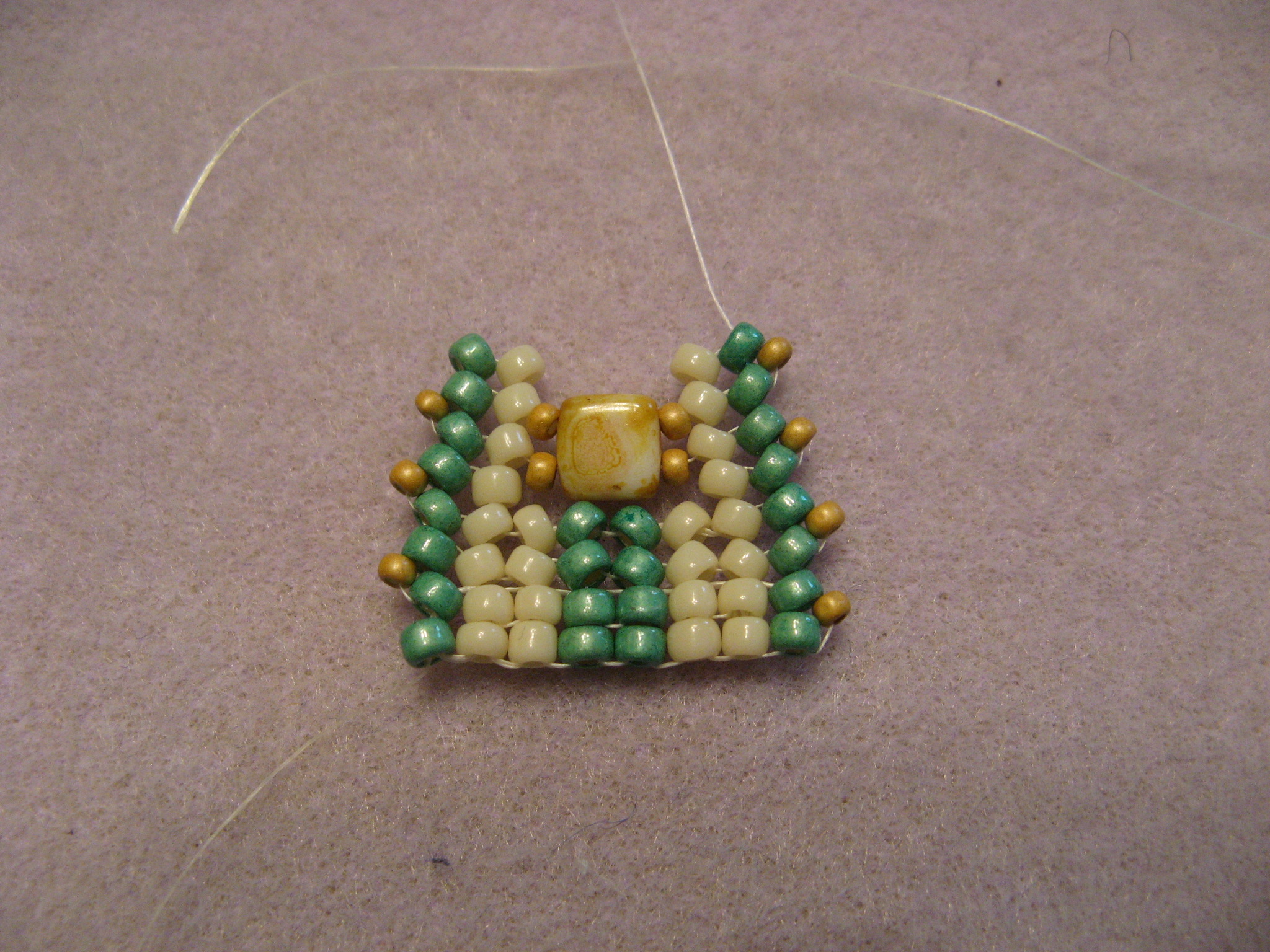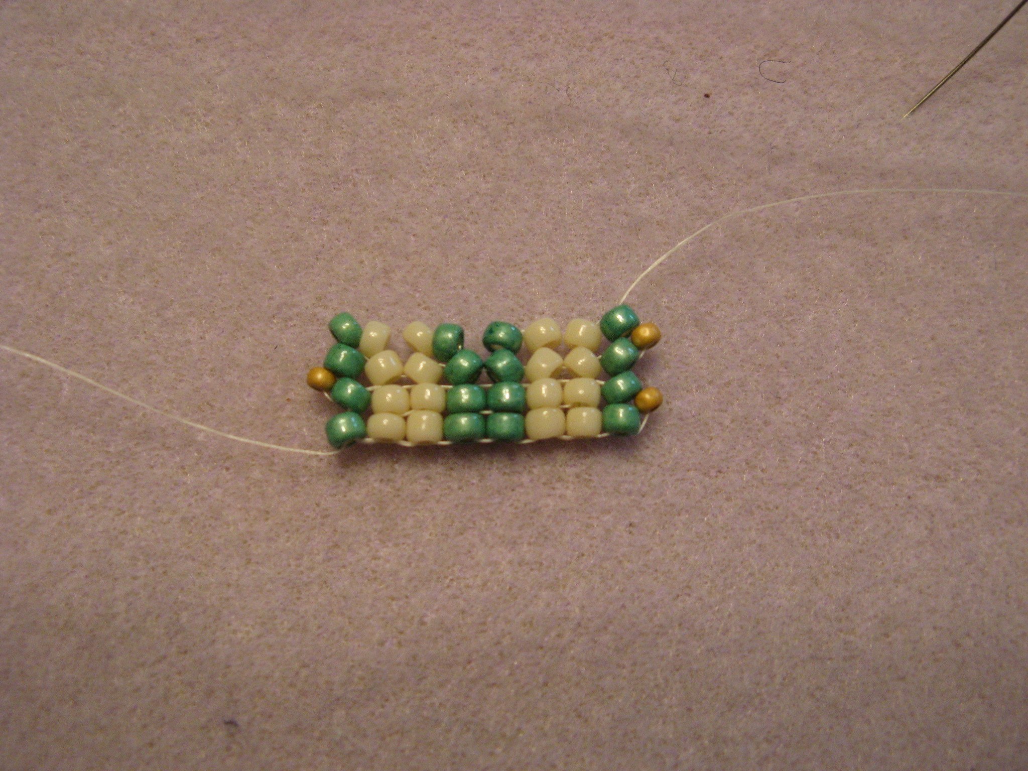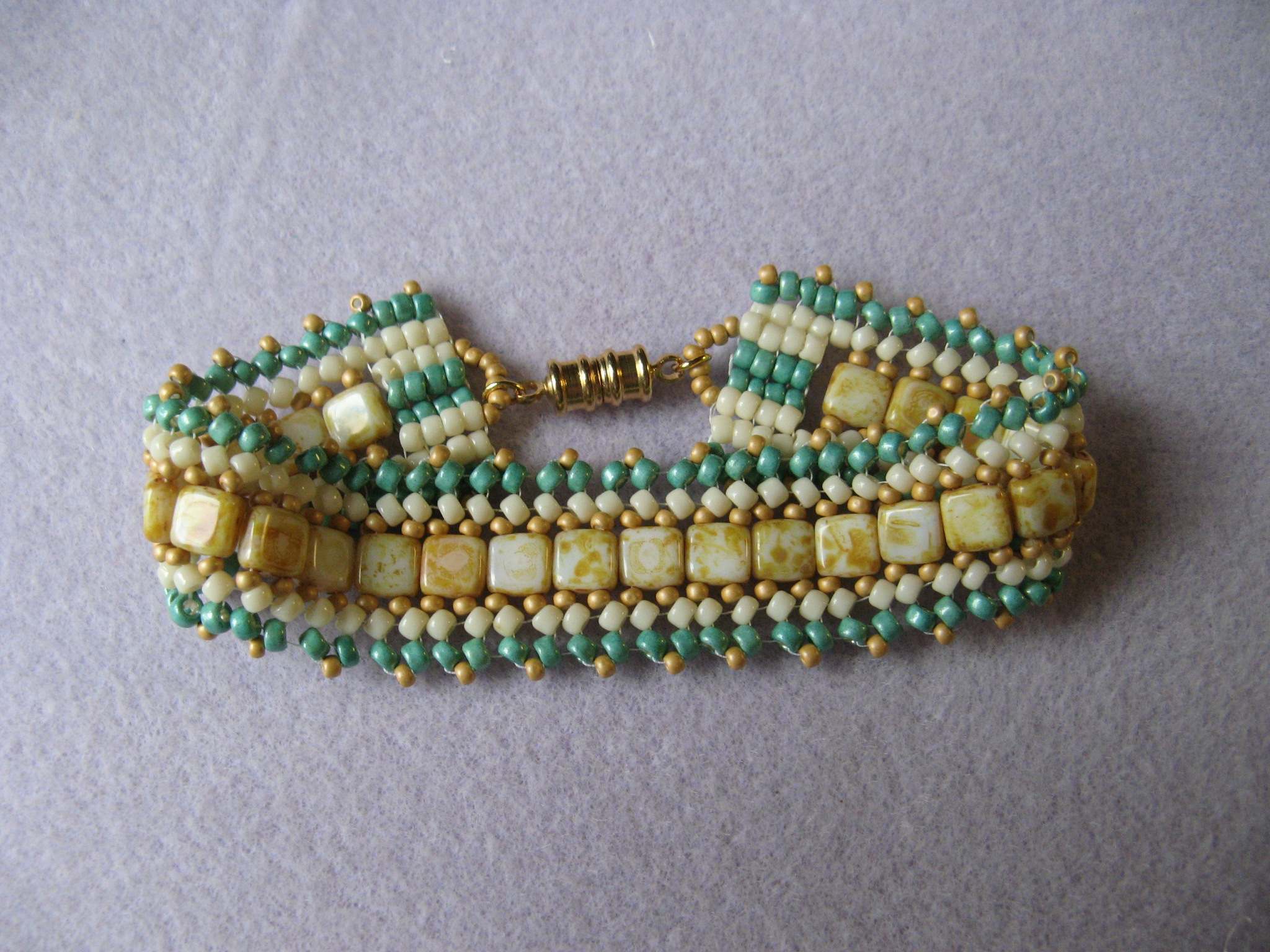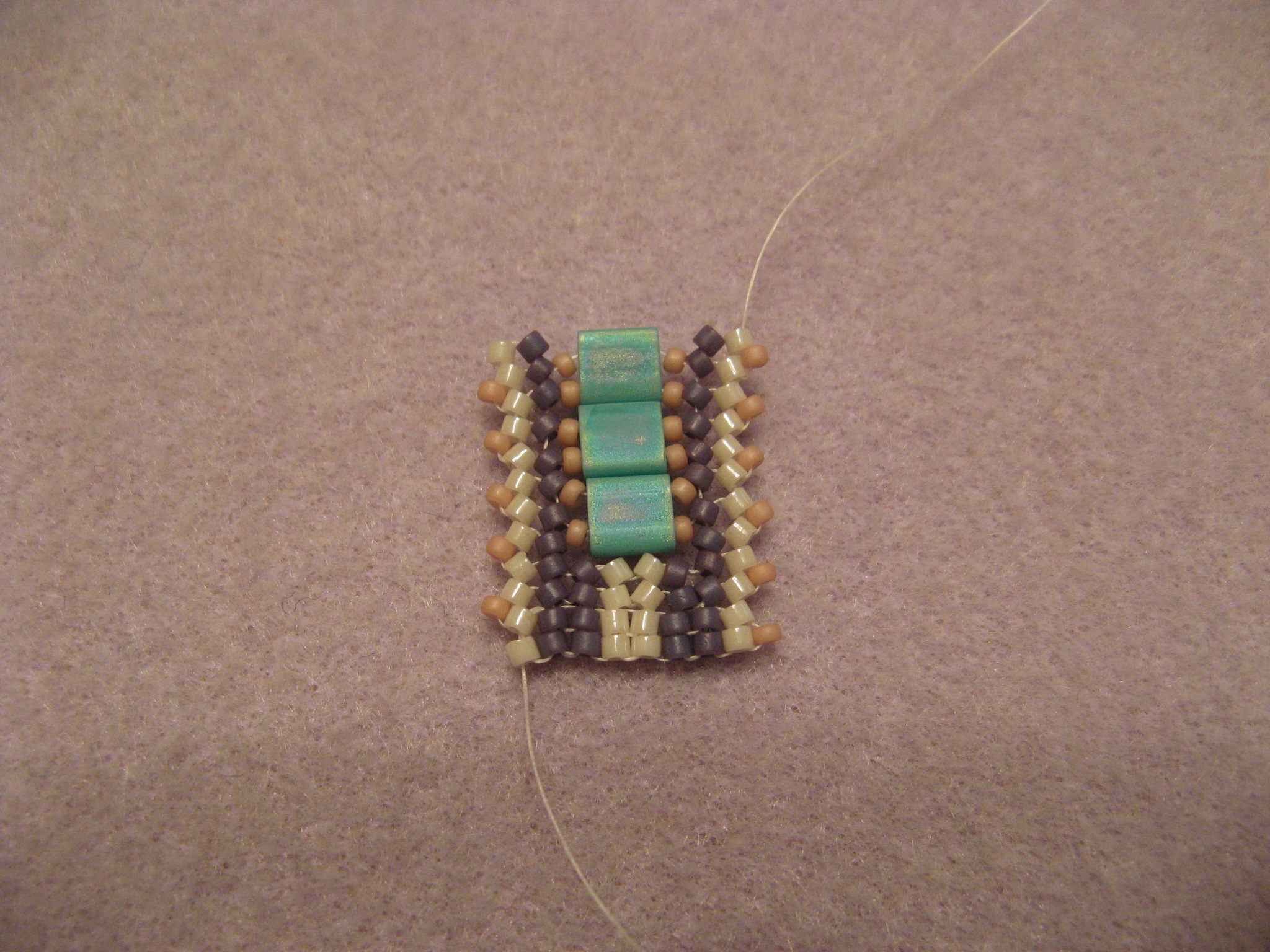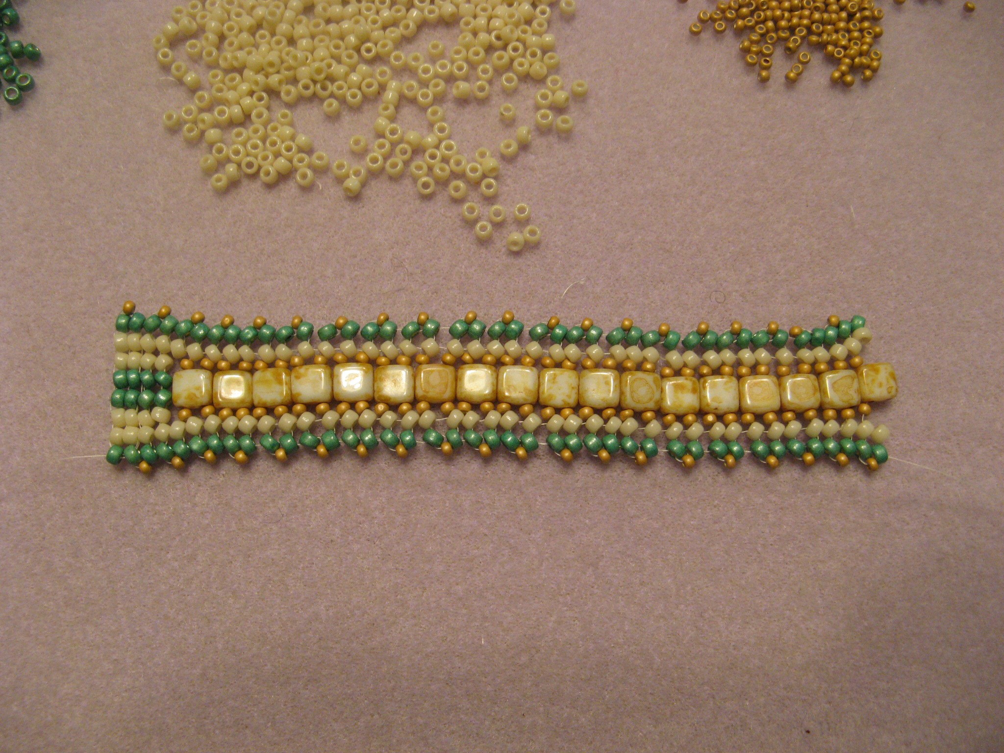 I then switched to flat herringbone stitch to create the next few rows and to add the Tile beads throughout the bracelet.