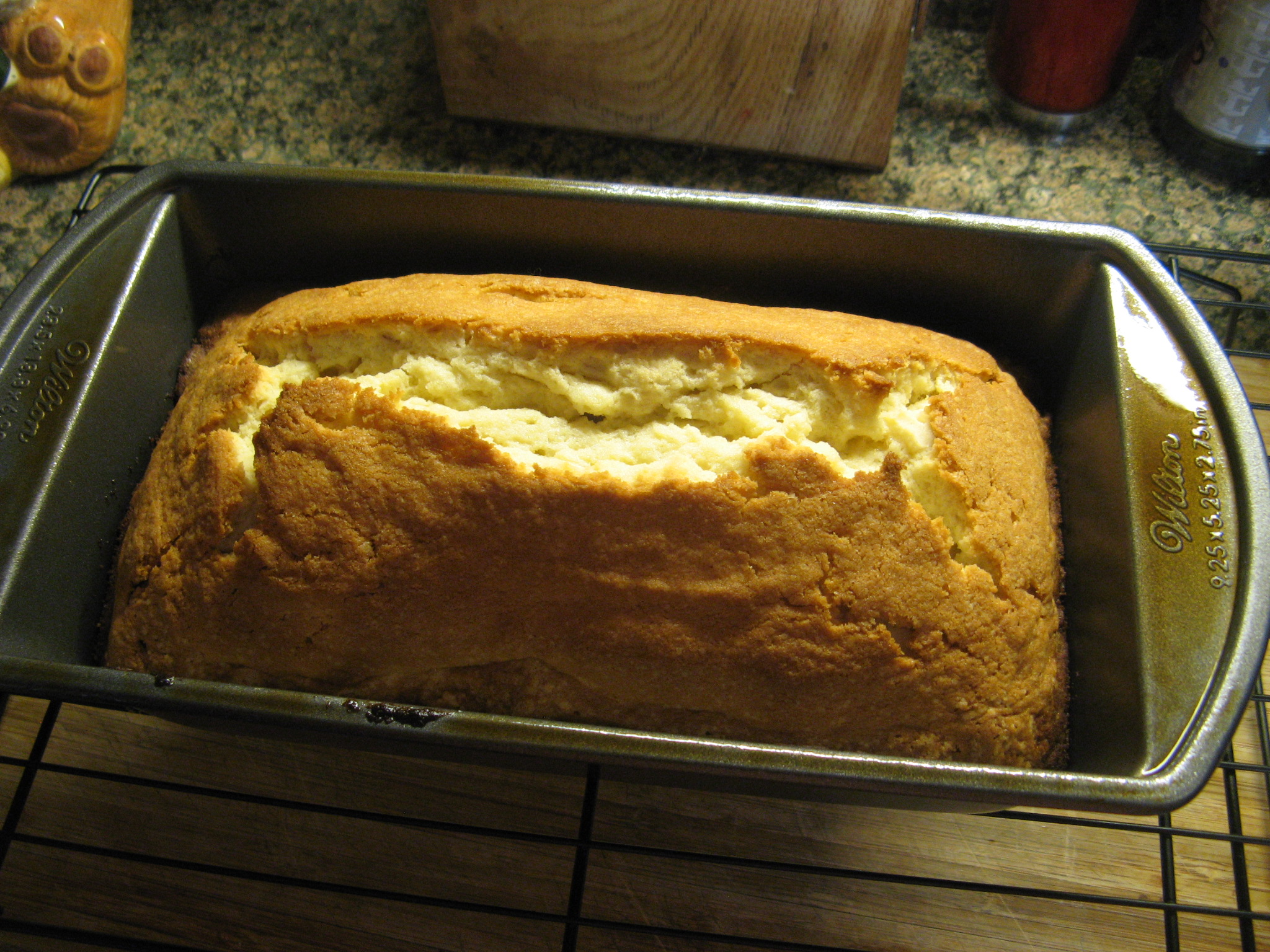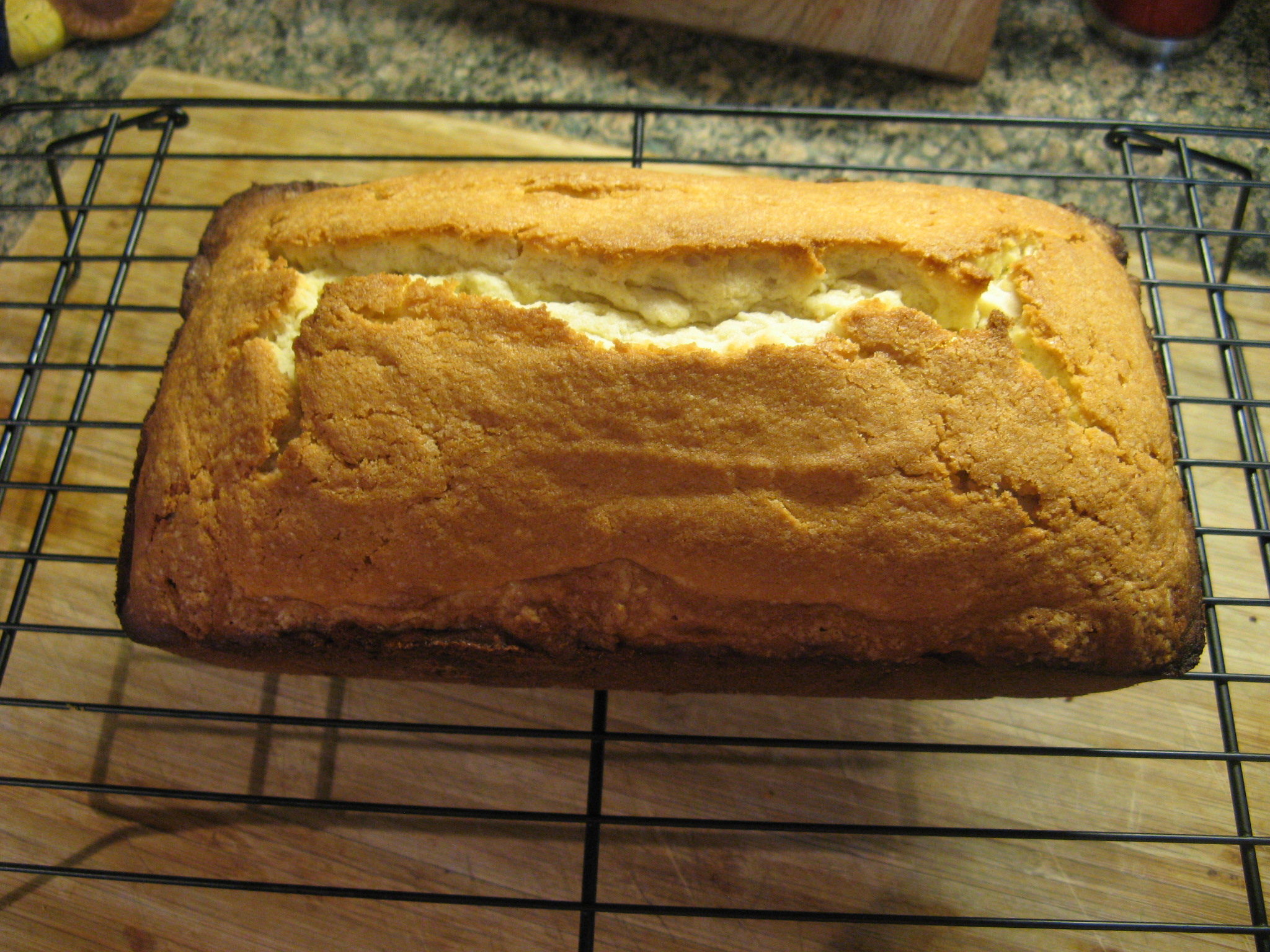 While the cake looked good I had a feeling that it was going to be on the dry side since the sides were a little dark and since dinner was rescheduled at the last minute I opted to bake another cake and make some tweaks to the directions. First off, the recipe called for a 6-cup loaf pan (8 1/2 inches x 4 1/2 inches) but since I didn’t have that size I just used what I had which was a 9 1/4 inches x 5 1/4 inches pan I had a feeling that this slight disparity in loaf pan size may have had something to do with the baking time and the oven temperature. So, for the second I decided to lower the temperature to 325 degrees and then baked the cake for approximately 50 minutes which was still a little long I found, but, produced a cake that was lighter in color and definitely moister. I definitely think you need the 6-cup loaf pan to make the most of this recipe. Next time I want to bake a simple pound cake I think I will go with Martha Stewart’s Classic Pound Cake recipe. The only reason I didn’t bake it this time was because it produced two cakes as opposed to one… In hindsight though I probably should have just gone with that one since I ended up baking two cakes anyway.