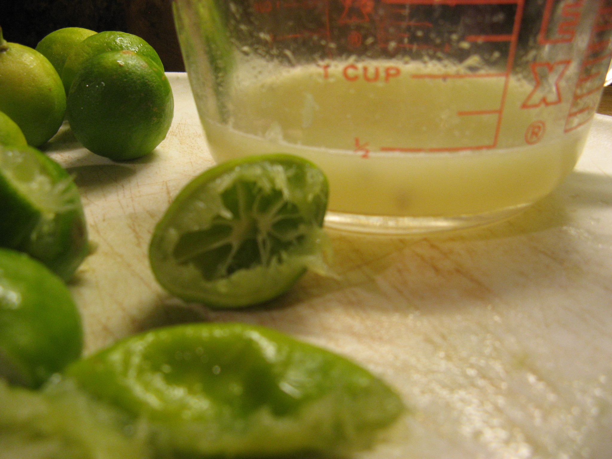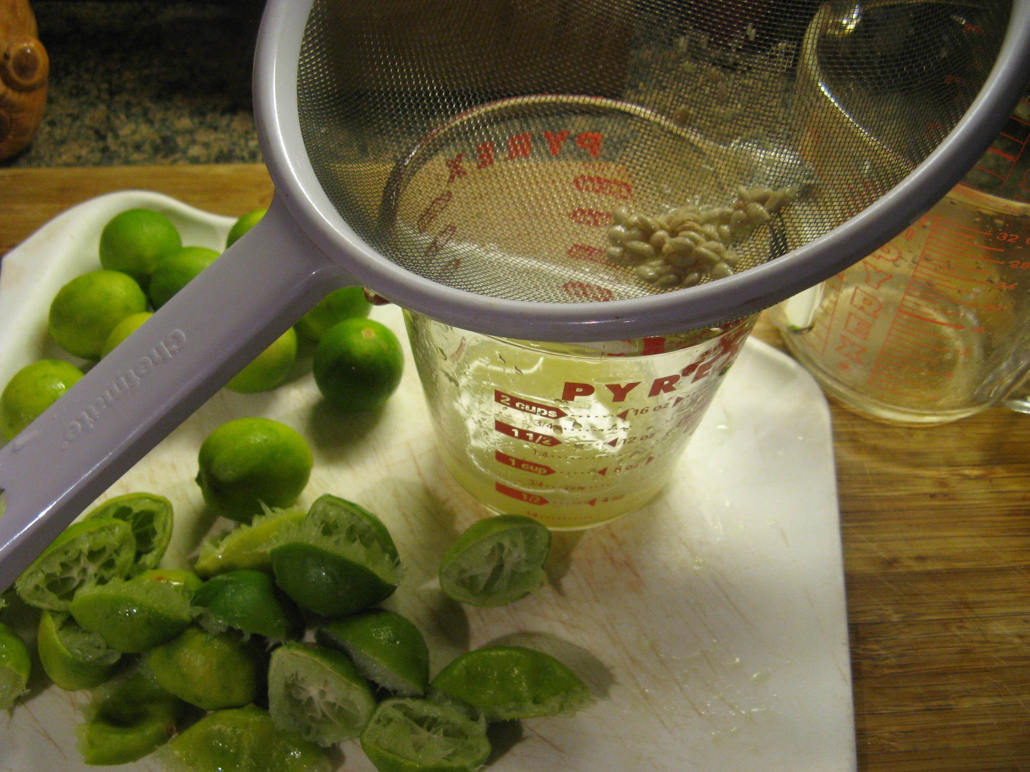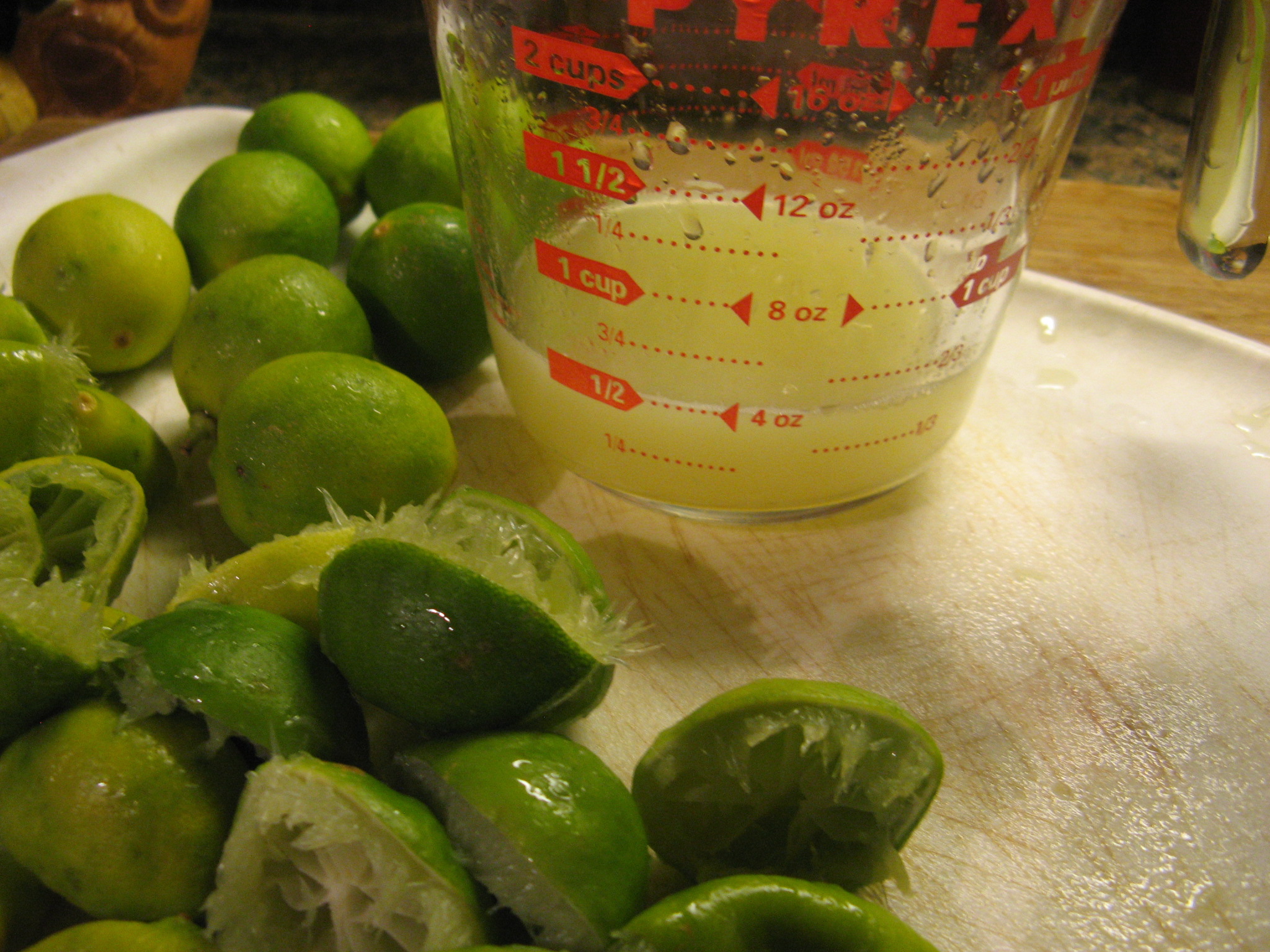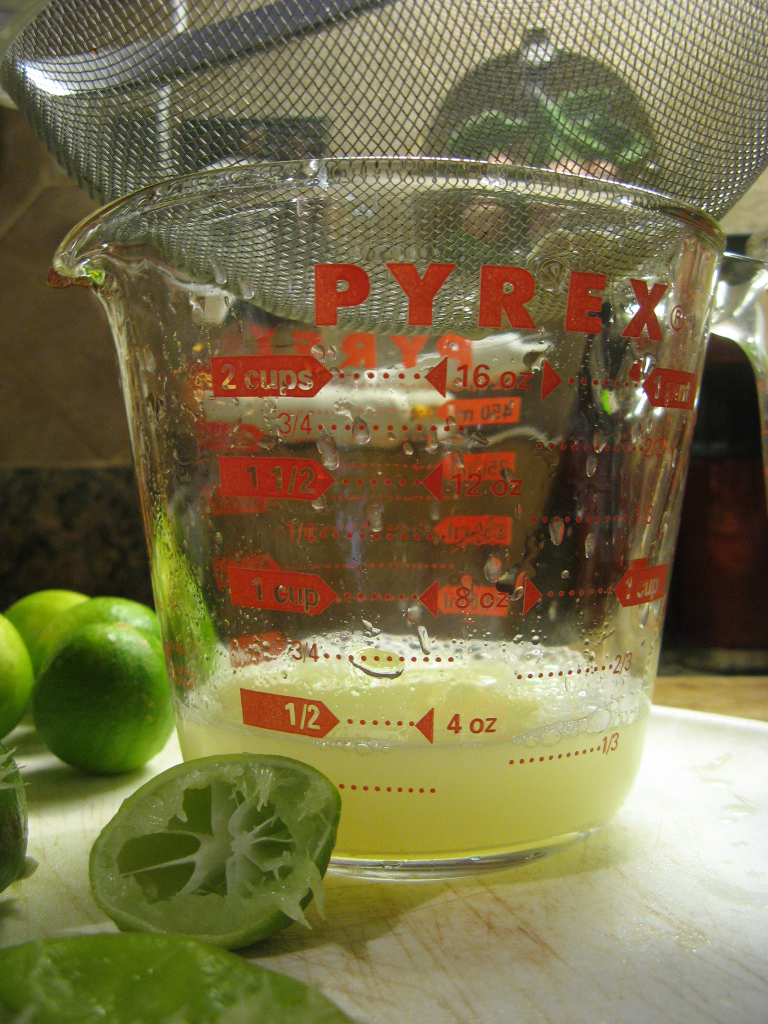 So, I rolled, sliced and squeezed 2 more limes which got me exactly to a 1/2 cup. I wised up this time and squeezed the limes over the sieve so I wouldn’t have to strain out any pulp or seeds.