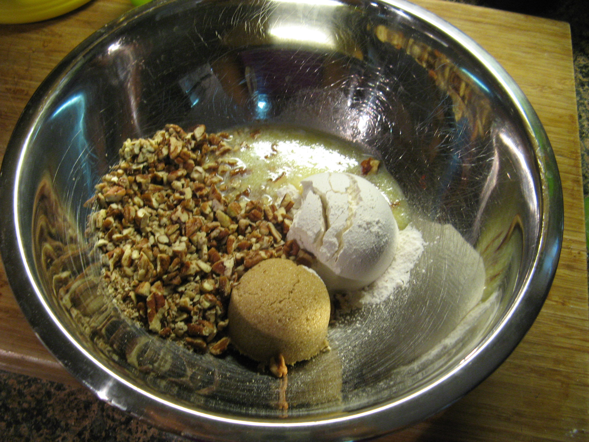 I started the cake by making the streusel. I combined flour, light brown sugar, salt, butter and pecans in a bowl…