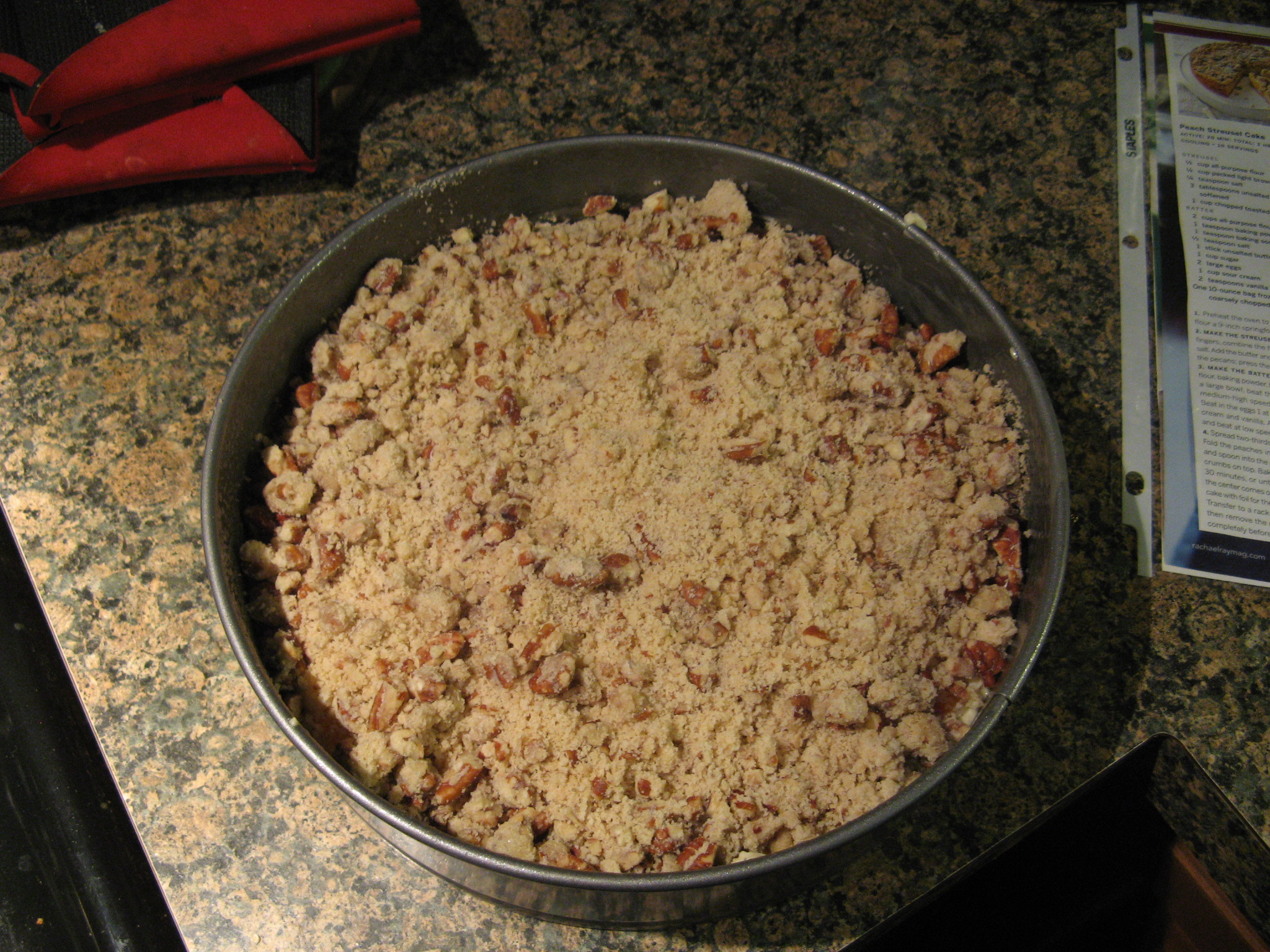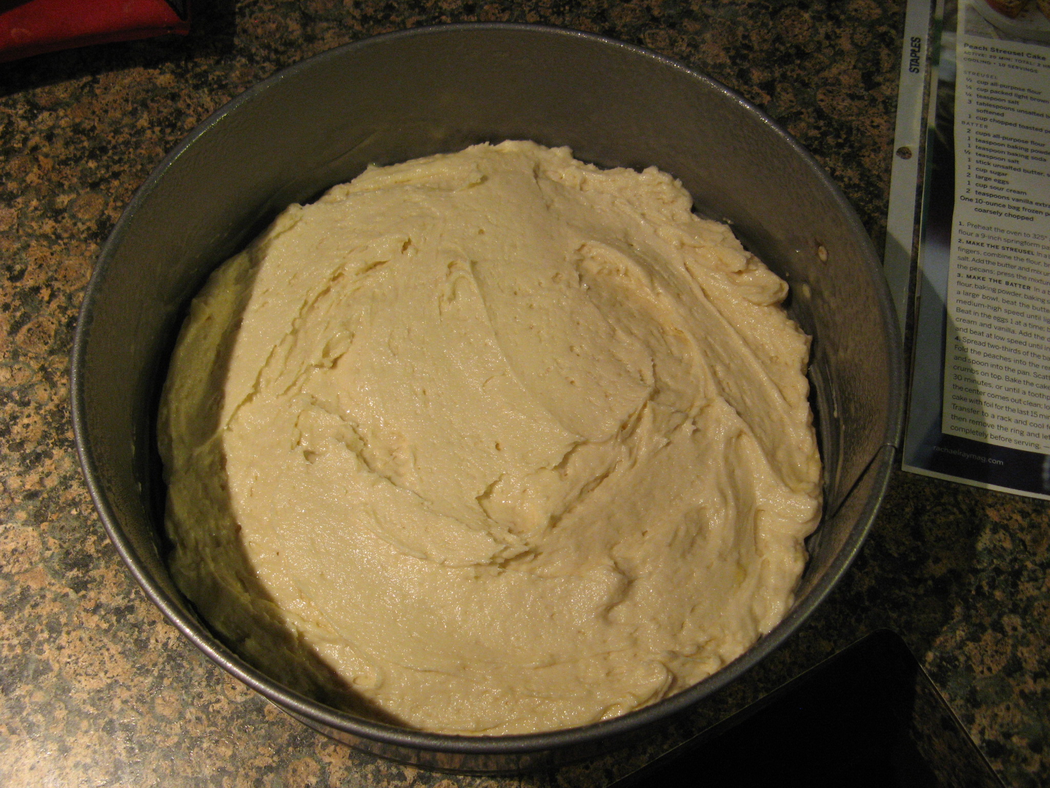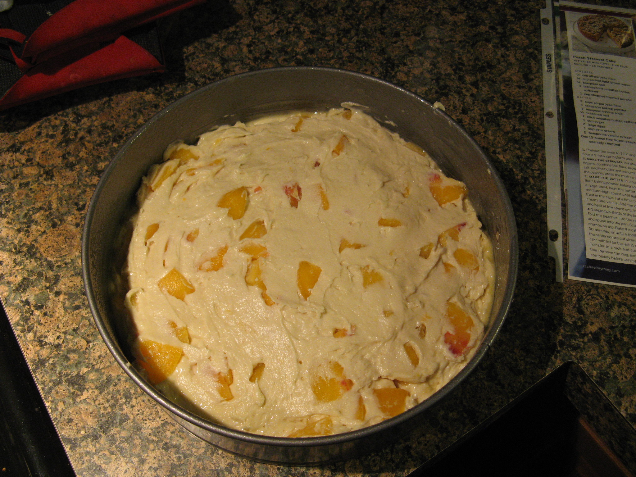 I tend to rip recipes out of magazines and file them away for quite some time before actually trying them. I recently made a turkey meatloaf following a recipe from a 2008 issue of a magazine. I wish I had made it sooner… It was quite good. So, when I was looking to make a cake to give as an anniversary treat for a friends’ parents I turned to a Peach Streusel Cake recipe that I had ripped out from a 2011 issue of Food & Wine magazine.
