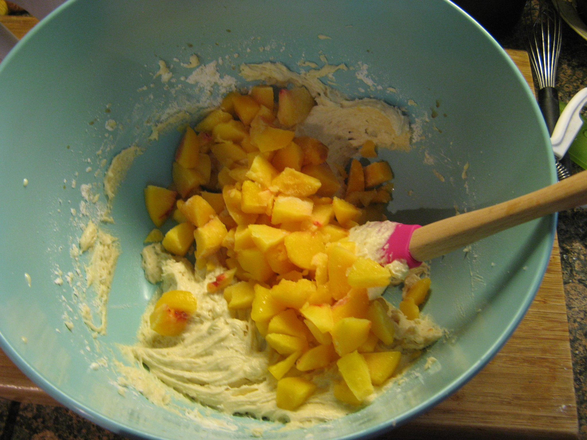 I then folded in chopped frozen peaches into the remaining batter. I had to go to about 4 different places to find frozen peaches. Each supermarket I went to had strawberries, blueberries and other frozen berries but no peaches. I ended up finding them at my local Target. It’s always the last place you check that has what you want.