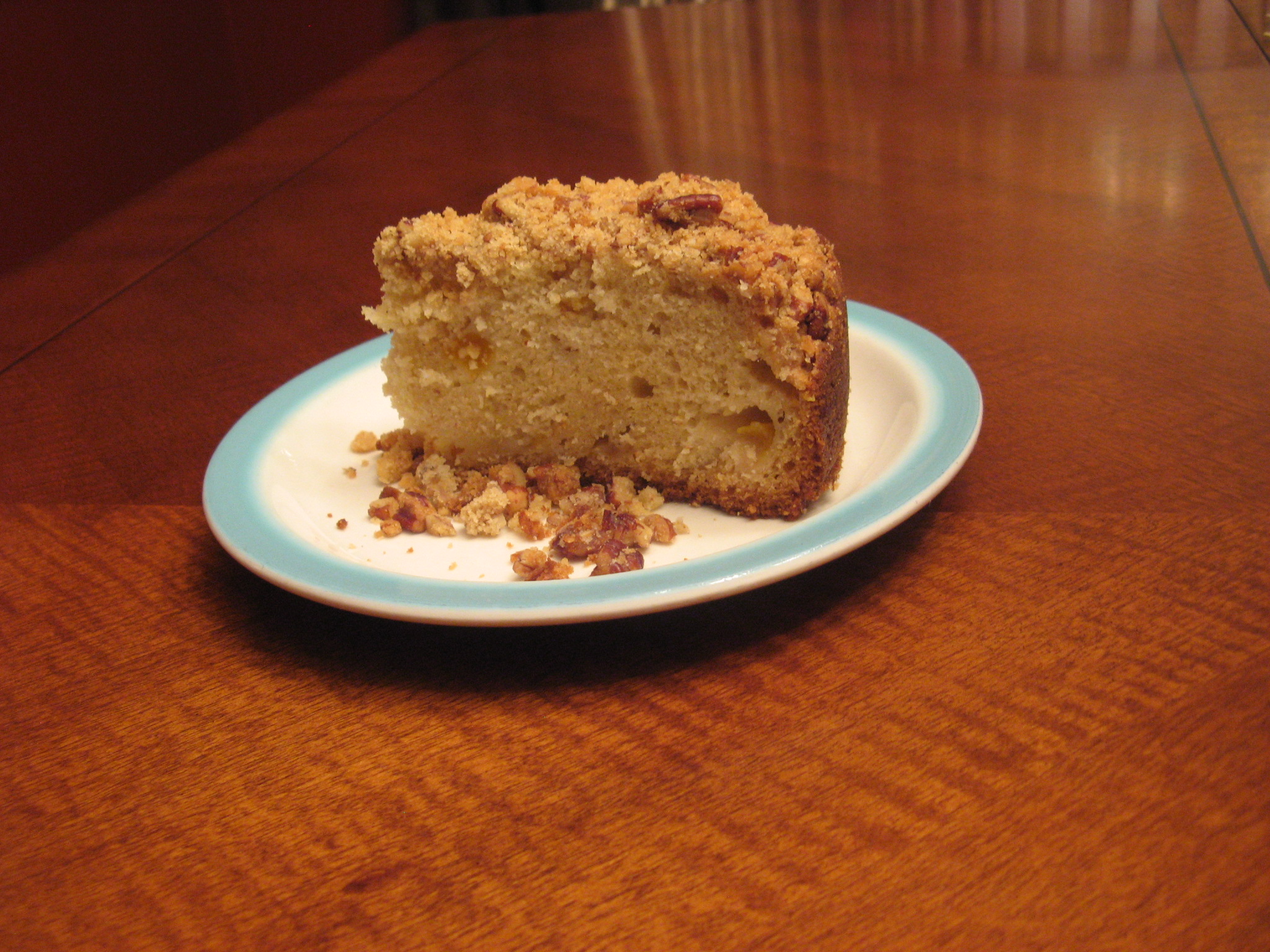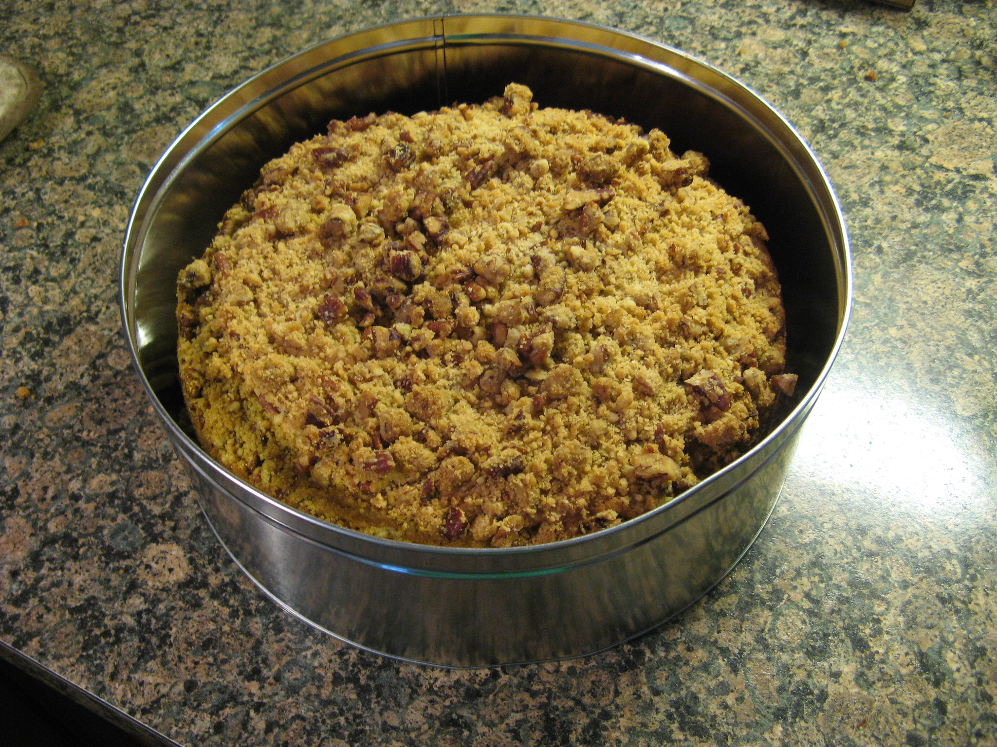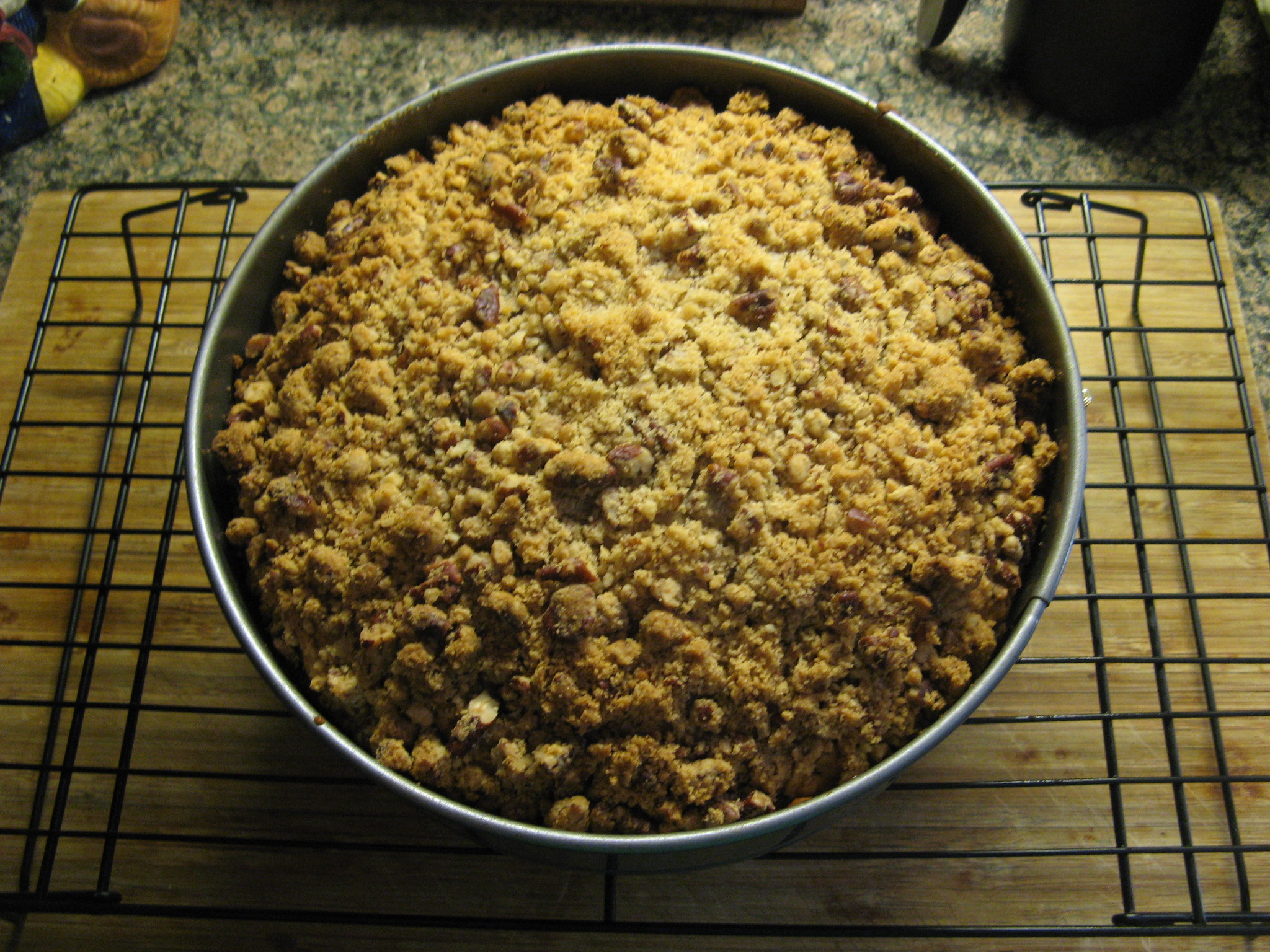 I baked the cake in a preheated 325F oven for 90 minutes, covering the cake with foil for the last 15 minutes so the streusel topping wouldn’t brown too much. It looked amazing when I took it out of the oven.