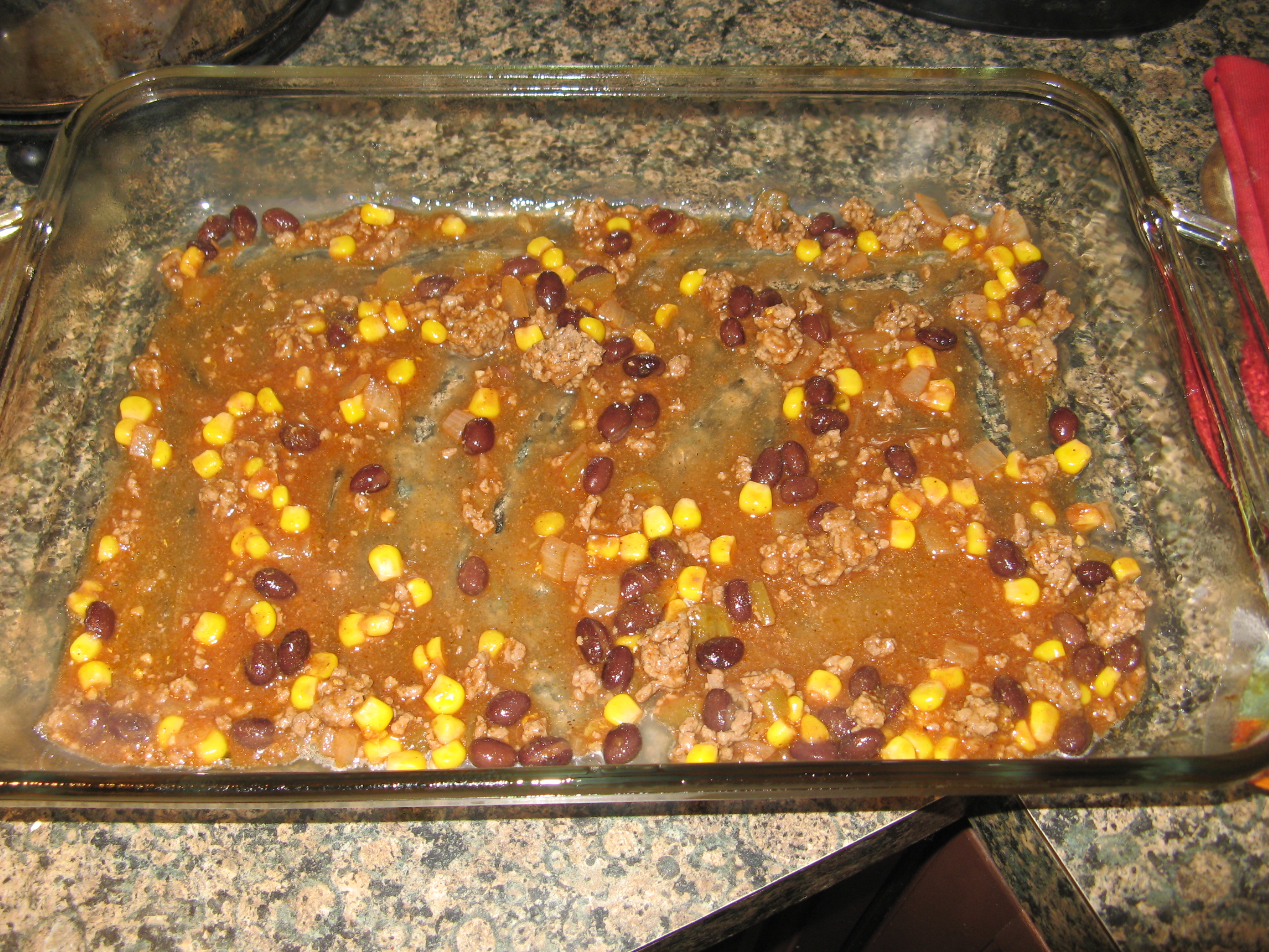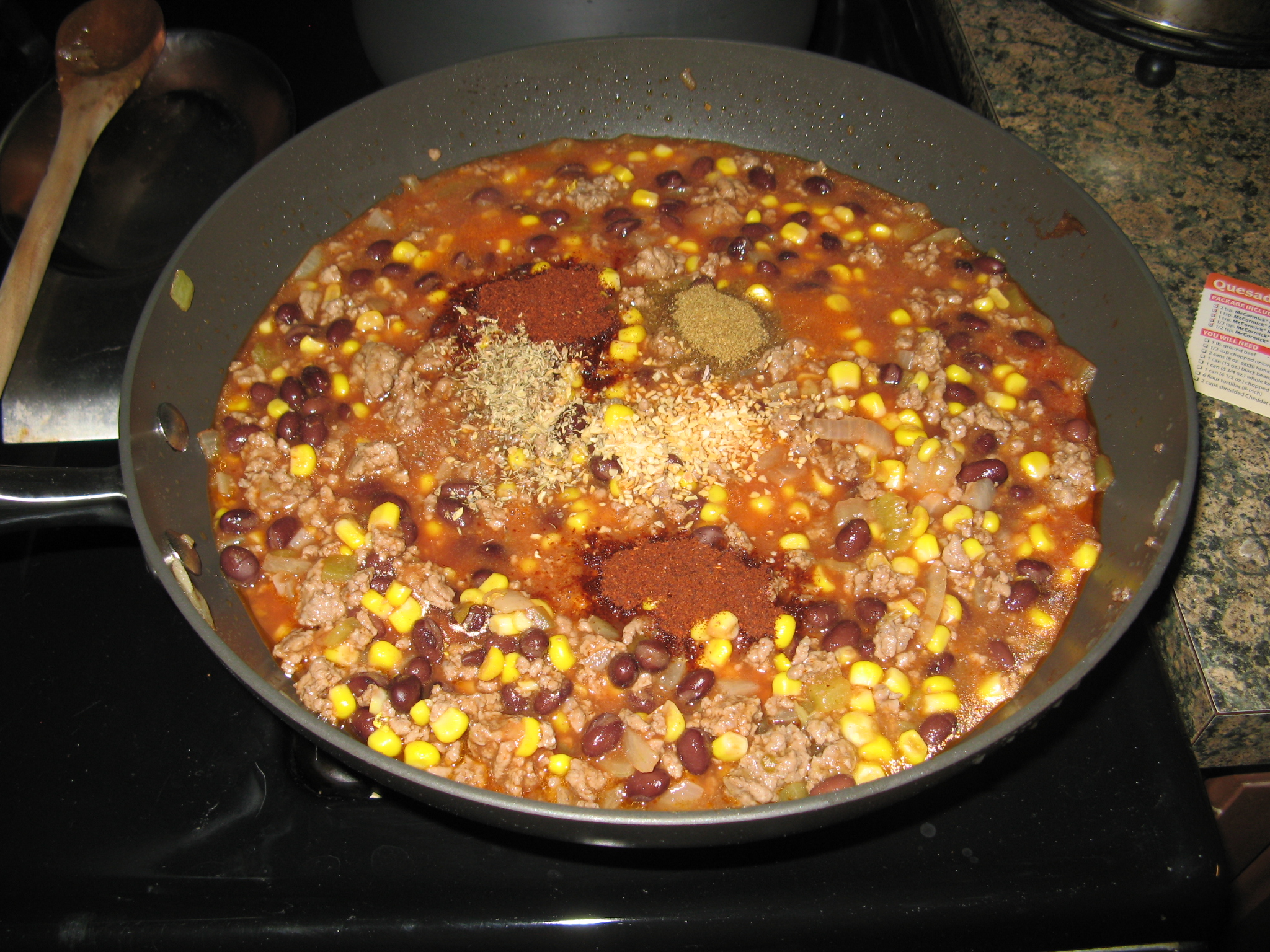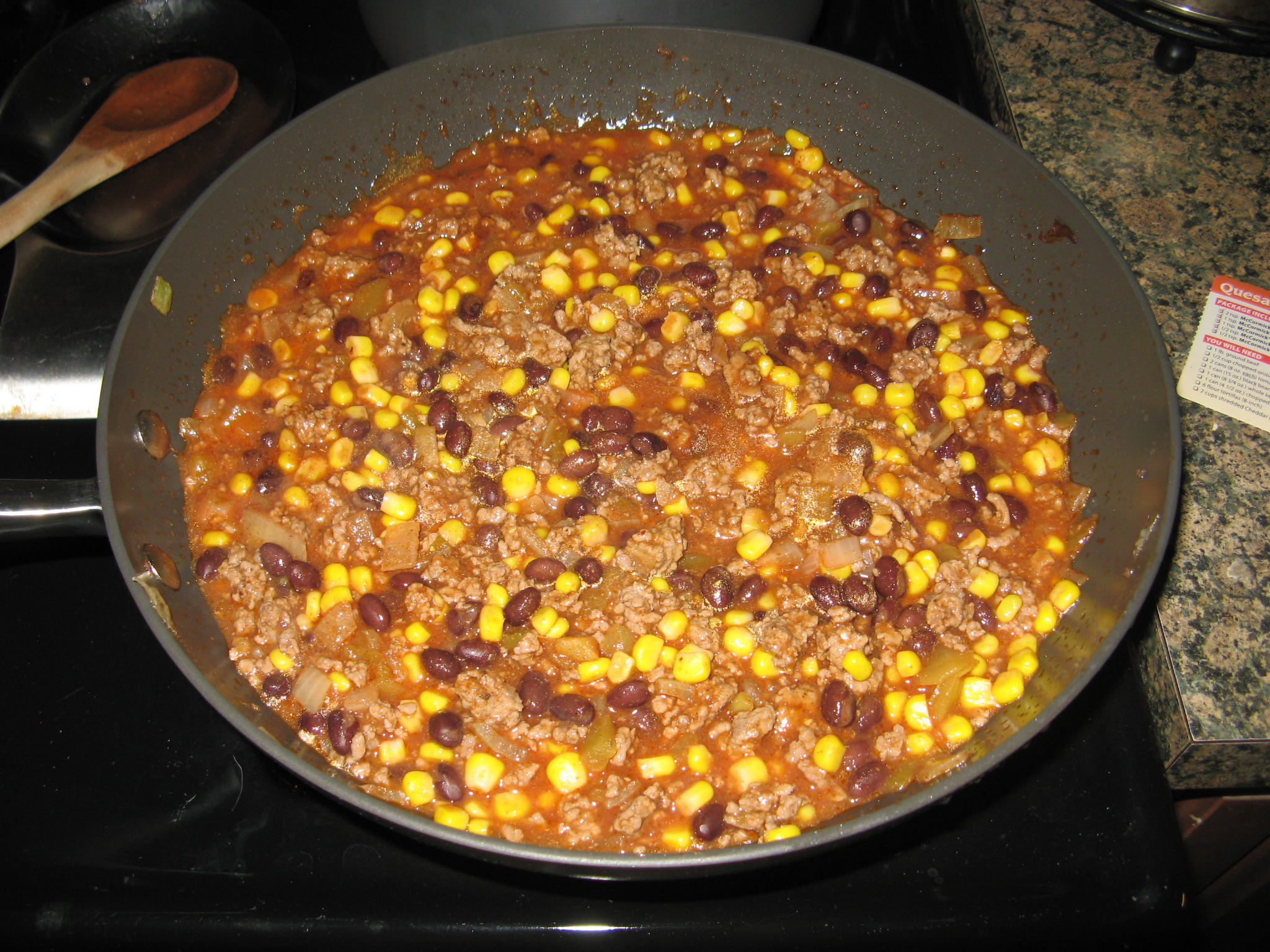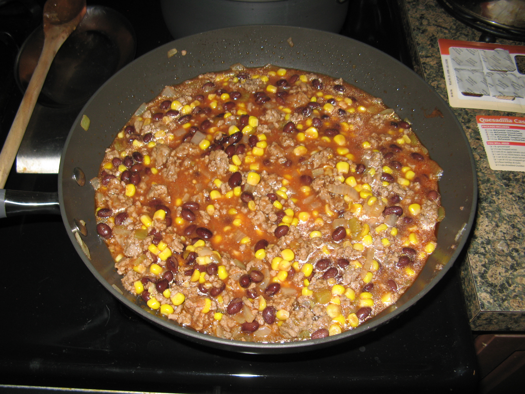 After draining the beef and onion mixture I added in two cans of tomato sauce, a can of black beans (drained and rinsed), a can of corn (undrained), and a can of chopped green chiles (undrained).