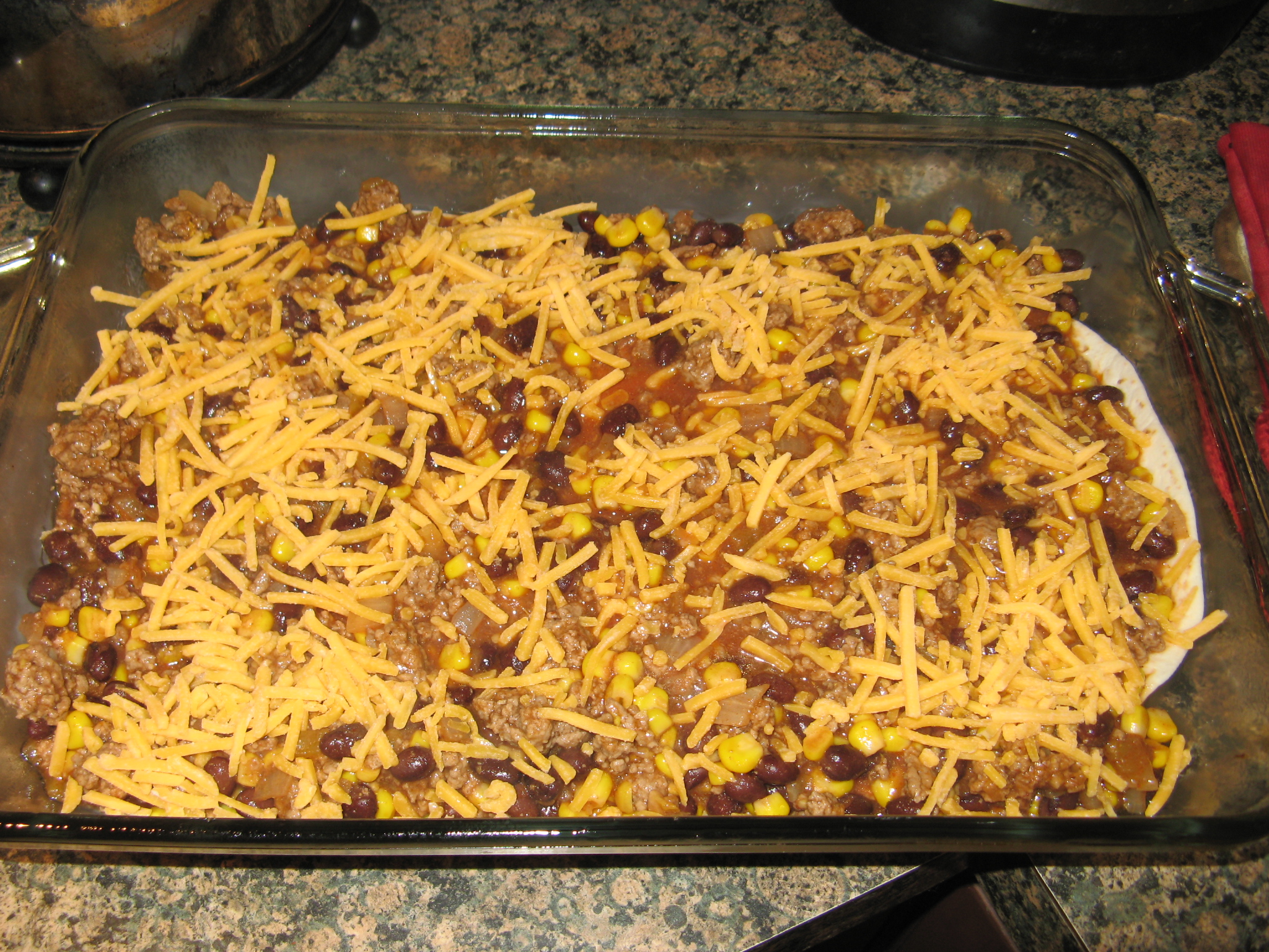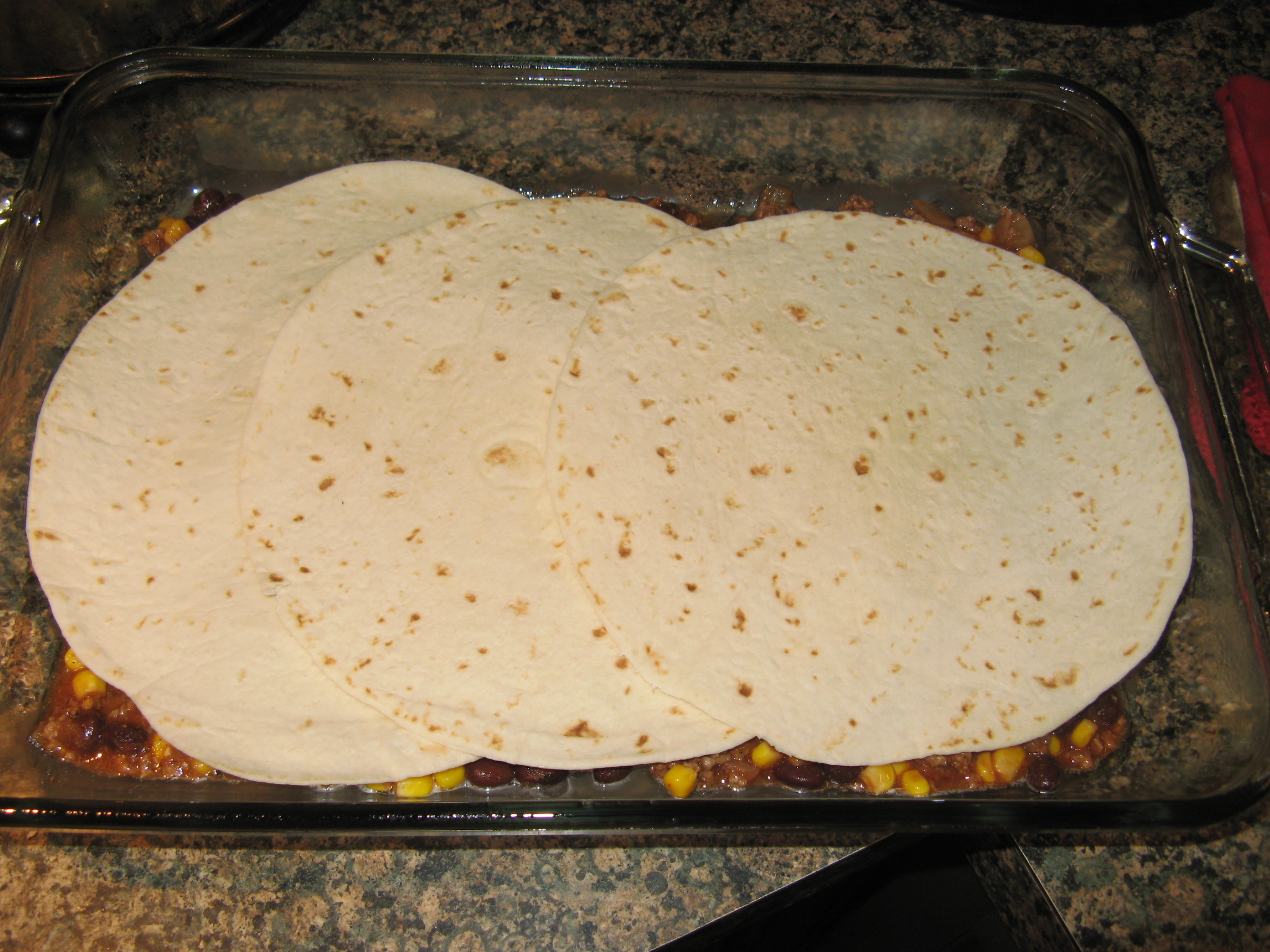 I made the second layer by repeating the tortilla, beef & cheese order.
