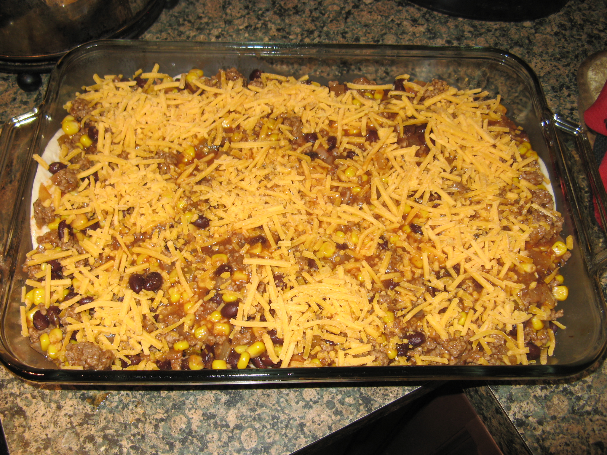 To complete the first layer of the casserole I topped the tortillas with half of the remaining beef mixture and then one cup of shredded cheddar cheese.