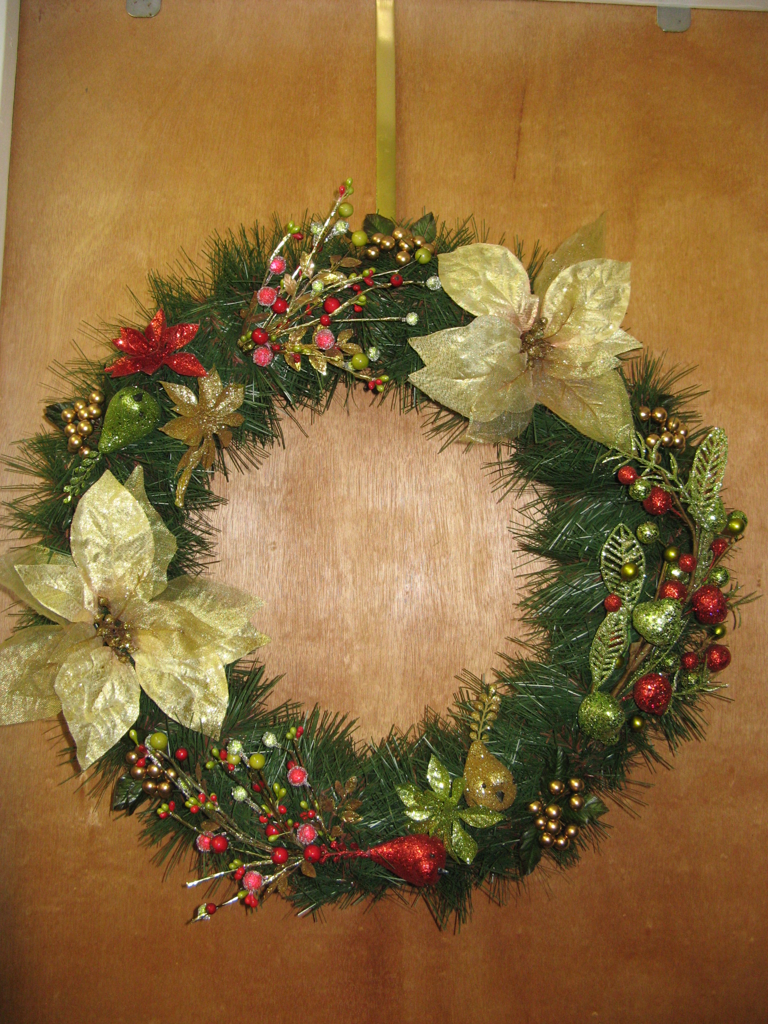 Up first… the Garland Wreath. While my local craft store did have those green wreaths I could have just bought and decorated I wasn’t too fond of the way they looked – that’s actually what my original wreath is made with and I never really liked it because of it – so I opted to wrap an 18″ grapevine wreath with garland. After that was done I then decorated it with various Christmas picks. I bought and returned quite a few of them before I was happy with the layout. This is actually the wreath that made it to my front door.