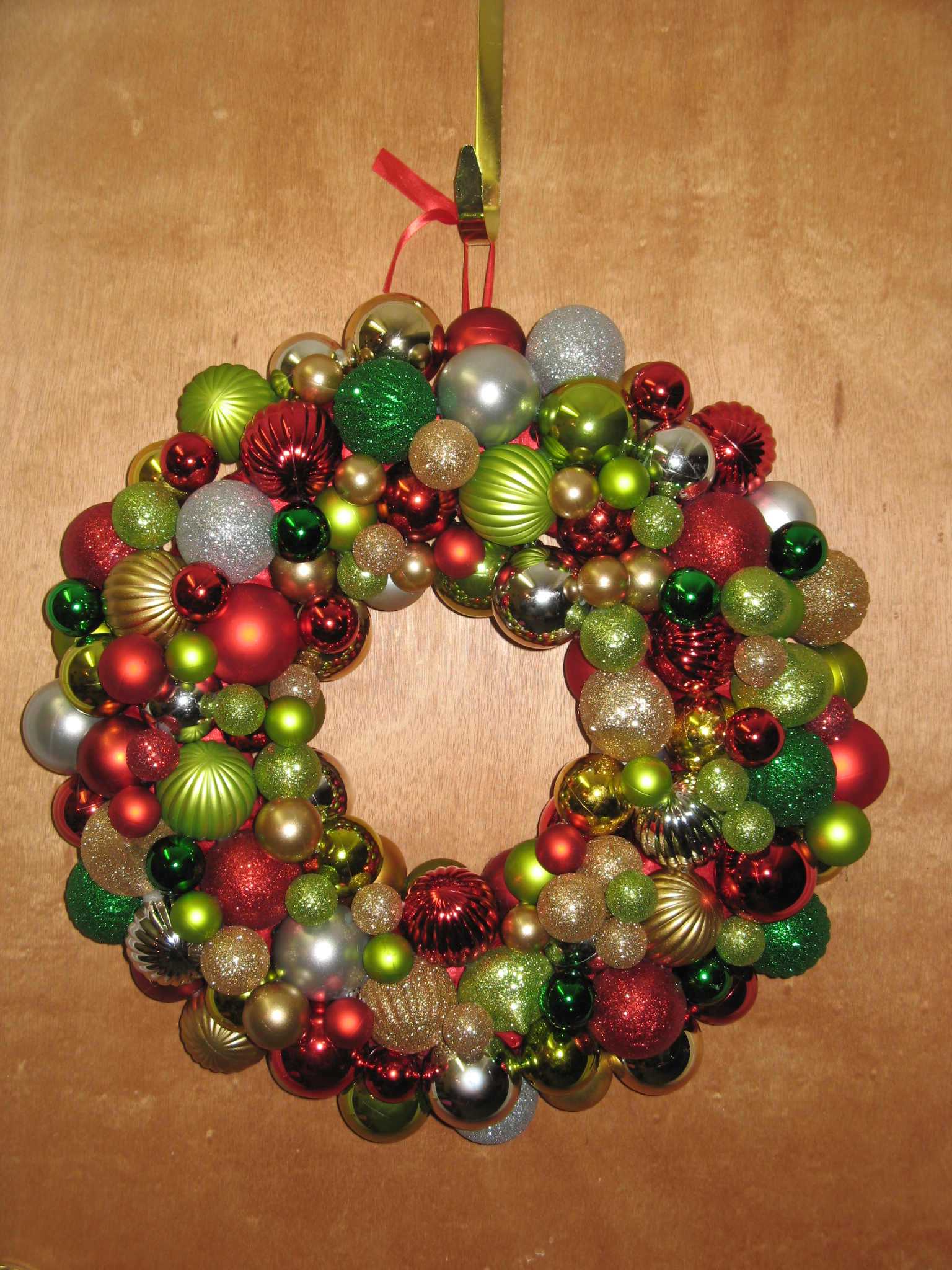 And finally, my favorite, the Ornament Ball Wreath. This was definitely the most time consuming, but, worth every minute. To begin I wrapped a Styrofoam ring with red ribbon tying a loop with the ribbon at one point so the wreath could be hung. I then lined the inside and outside of the ring with alternating sized shatterproof ornaments. I then filled in the flat part of the ring with various sized ornaments and finally – the part I couldn’t get too crazed with – I filled in the gaps with smaller sized ornaments. It’s very easy to go from beautiful to gaudy when adding the ornaments.