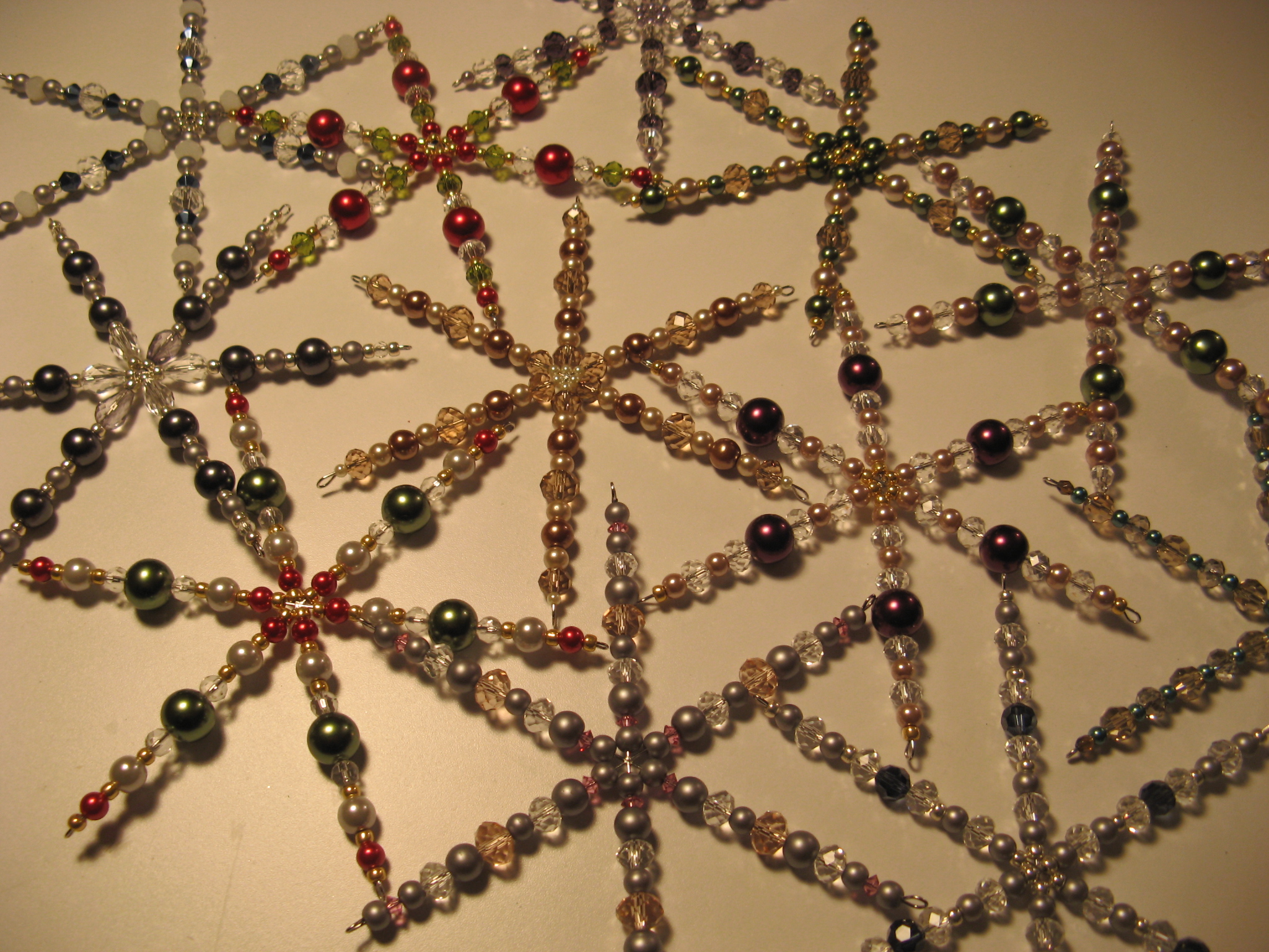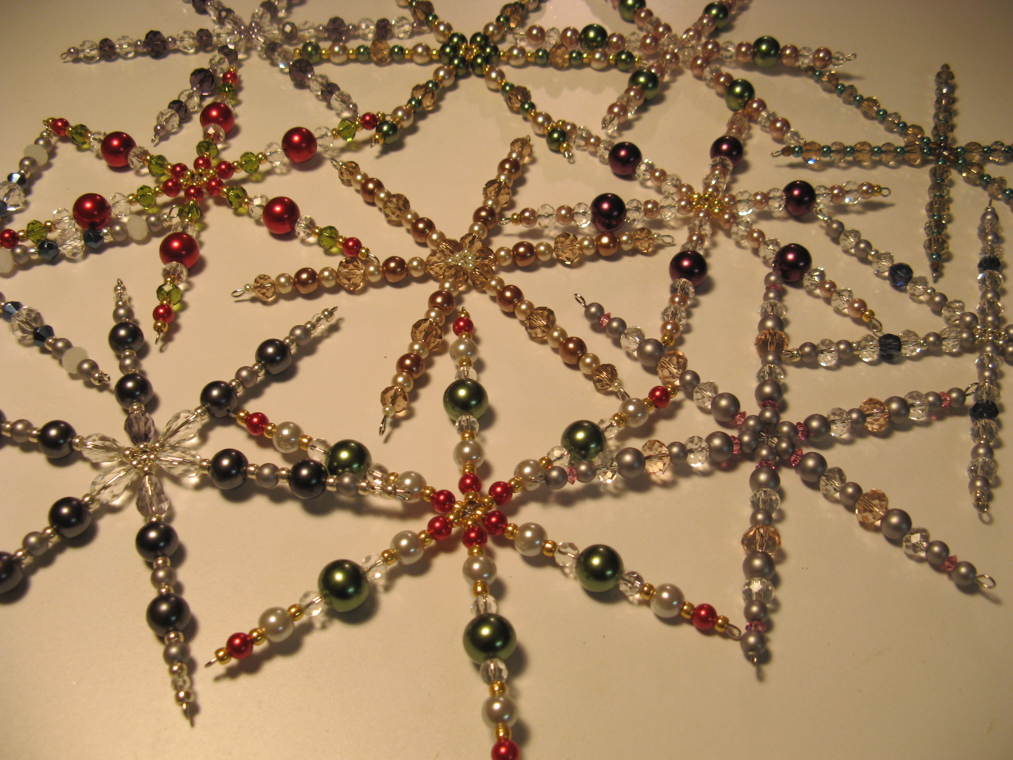 After a few wire mishaps (thankfully I bought extra wire forms) and a couple of wire gashes all of my snowflakes were done. After taking this picture I threaded all of them with coordinating ribbon so they could be hung from a Christmas tree, in a window, or wherever.