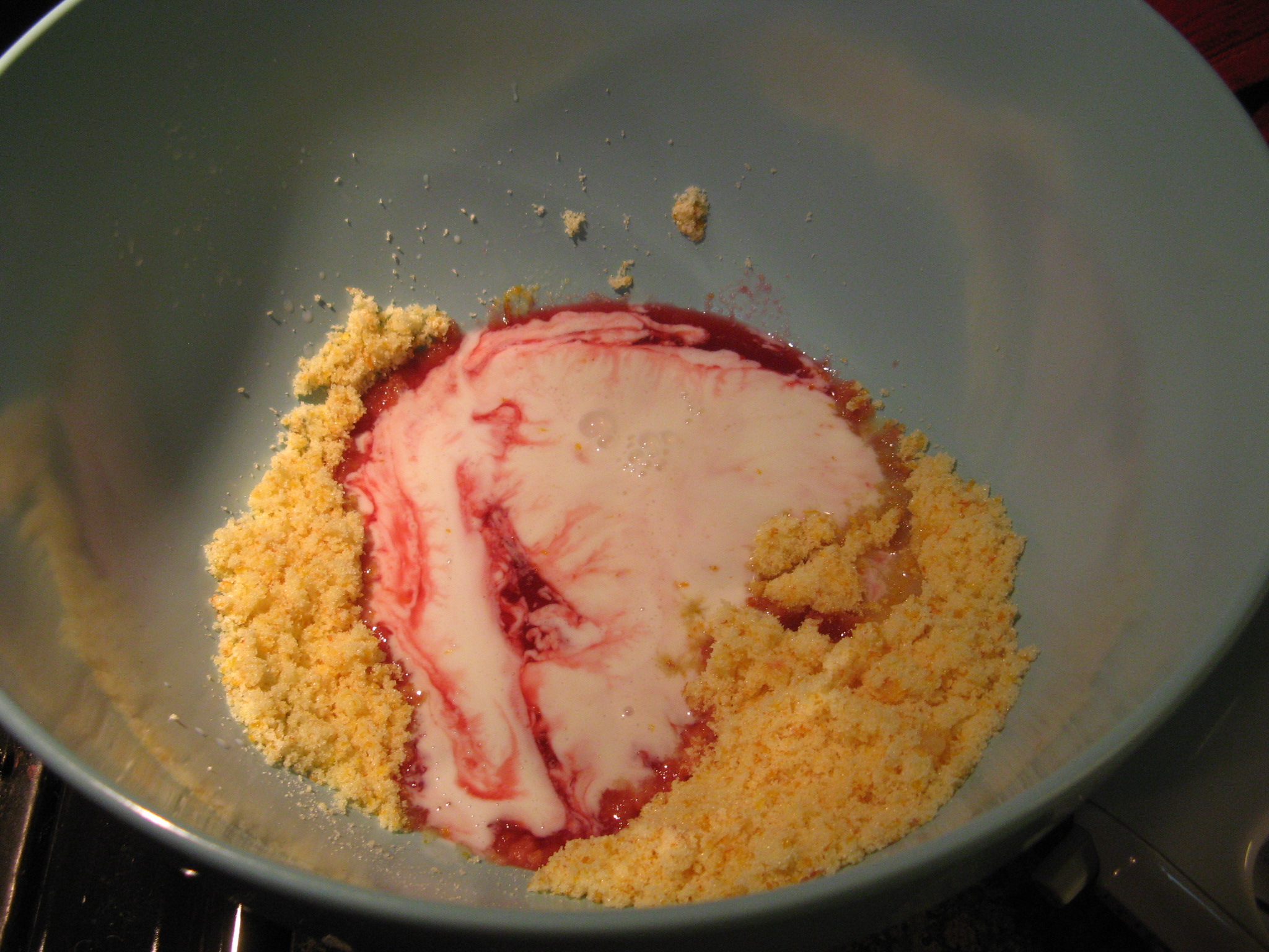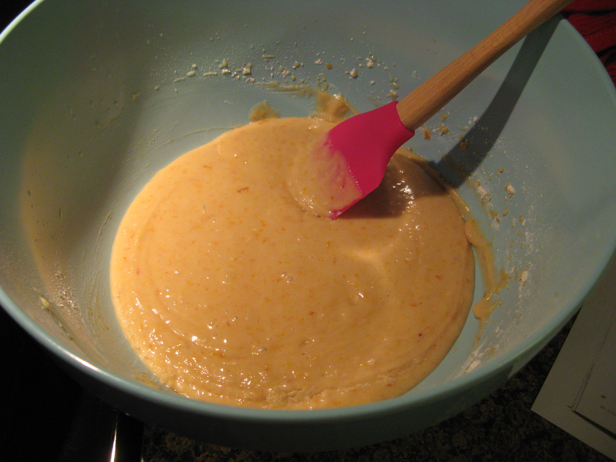 After mixing the orange zest and sugar together with my fingers (per the instructions) I then added in the juice and buttermilk and whisked it together with my hand mixer… not my fingers!