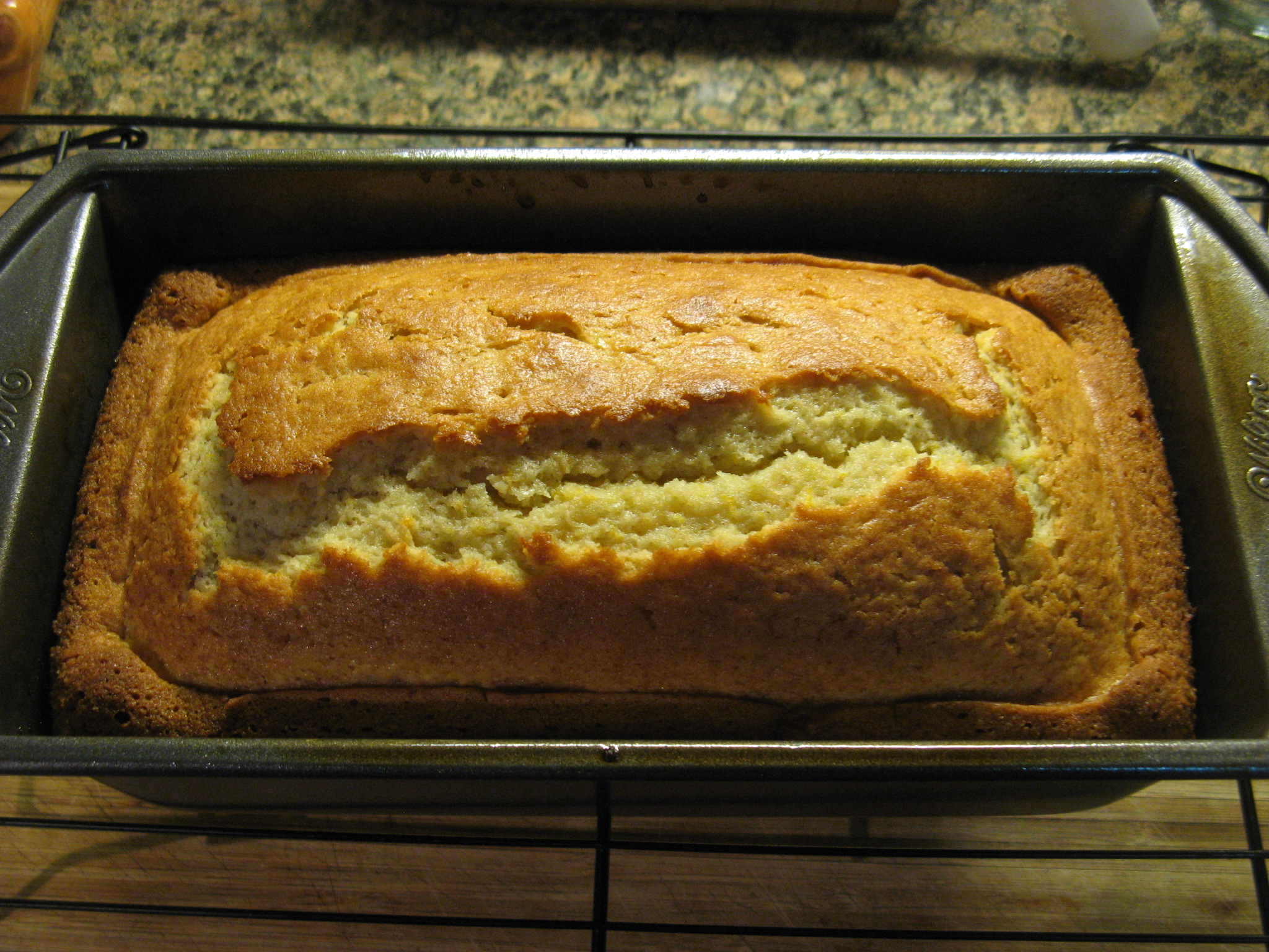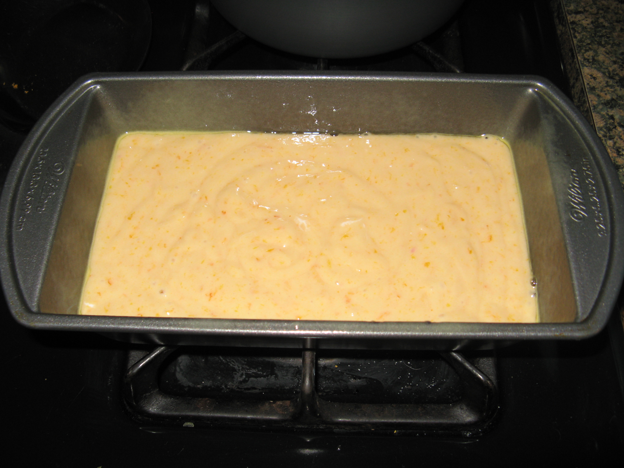 I then poured it into a prepared – I sprayed it with non-stick baking spray – 9 x 5 inch loaf pan and baked it in a 350 degrees preheated oven for about forty-five minutes.
