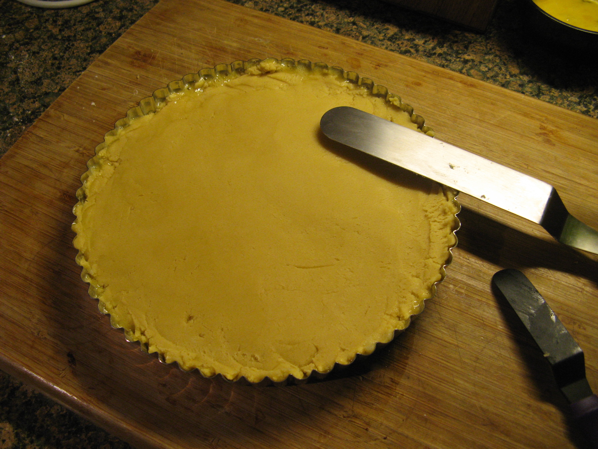 Now it was time to transfer the batter to my tart pan – most tart pans have a removable bottom (as this one does) which makes removing the tart a cinch. You just push the tart up from the bottom when it’s done cooling and the decorative rim slides right off. I also prepped the pan with baking spray.