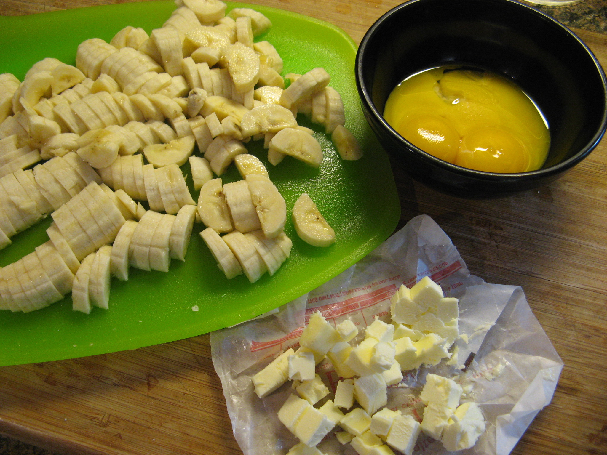 While the crust was cooling I began making the banana cream filling. To begin I prepped those ingredients that needed a bit of prepping: slicing three bananas, separating four eggs for the yolks and cutting up 2 tbsp. of butter.