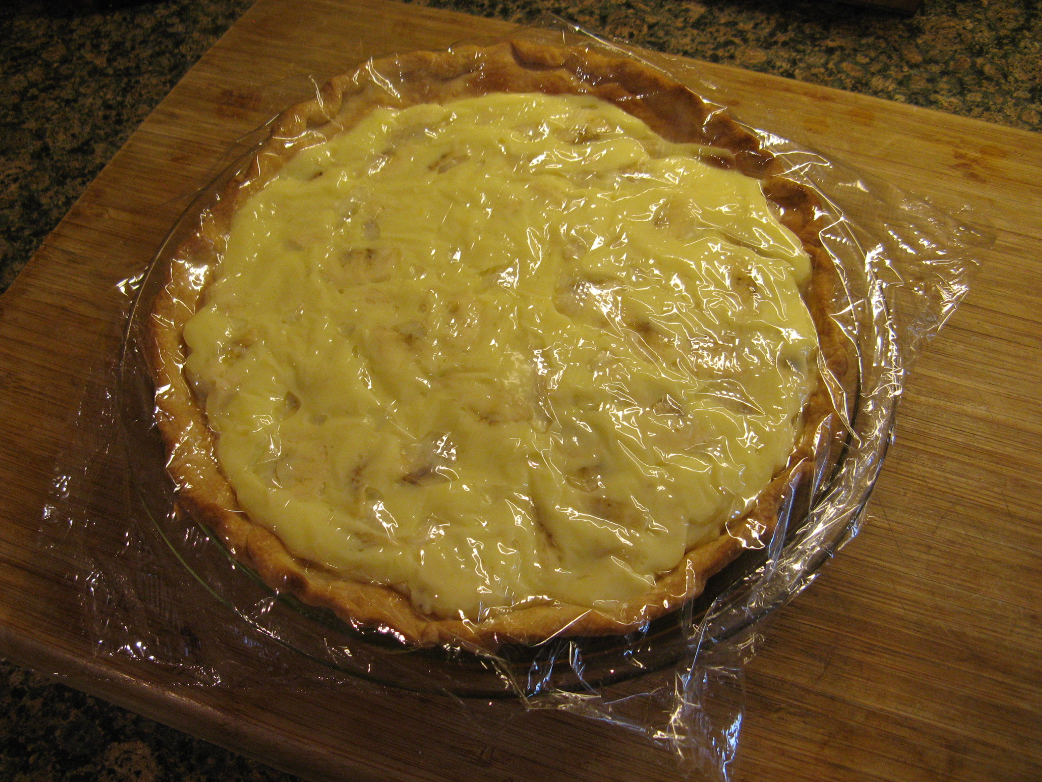 It was then time to pour the banana cream into the cooled pie crust and then cover it with plastic wrap and refrigerate it until the cream was set.