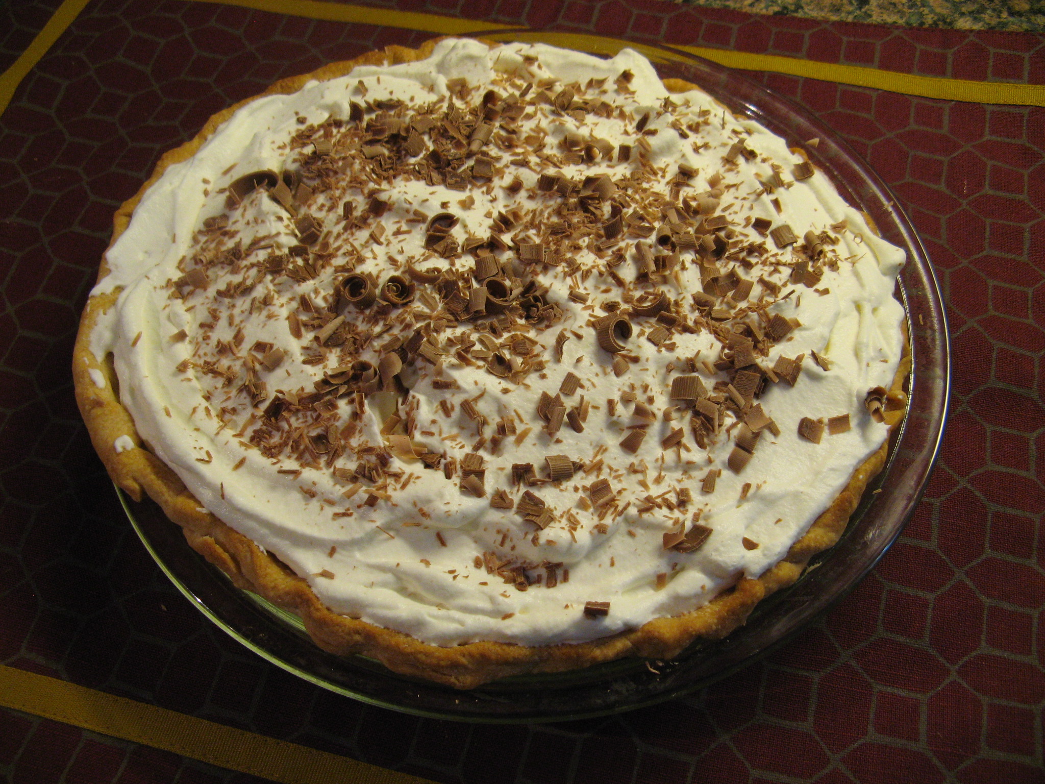Once the pie was set I made a whipped cream topping for it and sprinkled it with shaved chocolate curls.