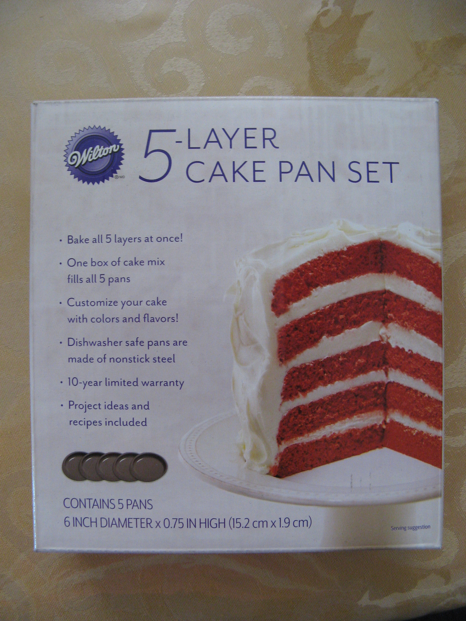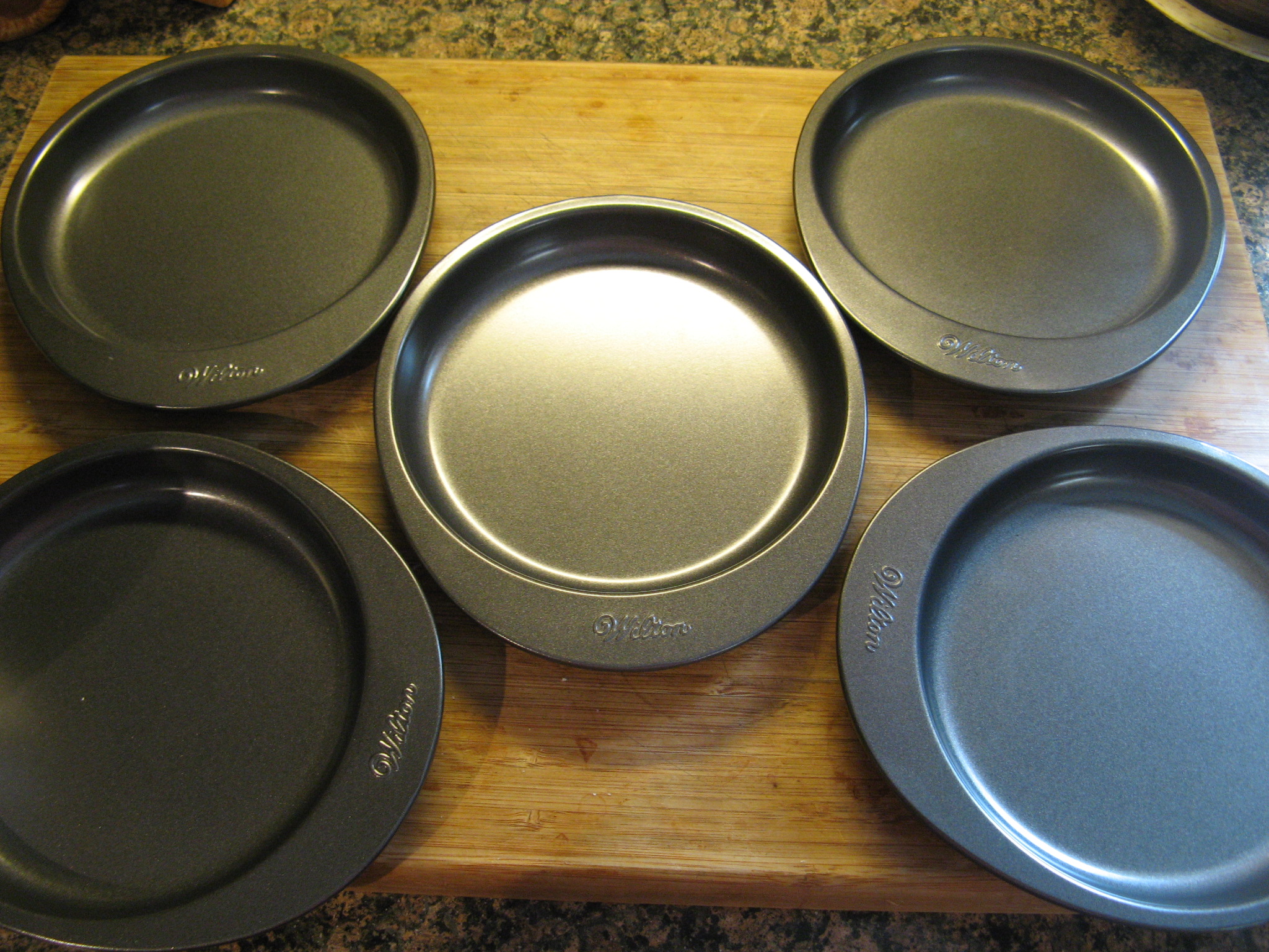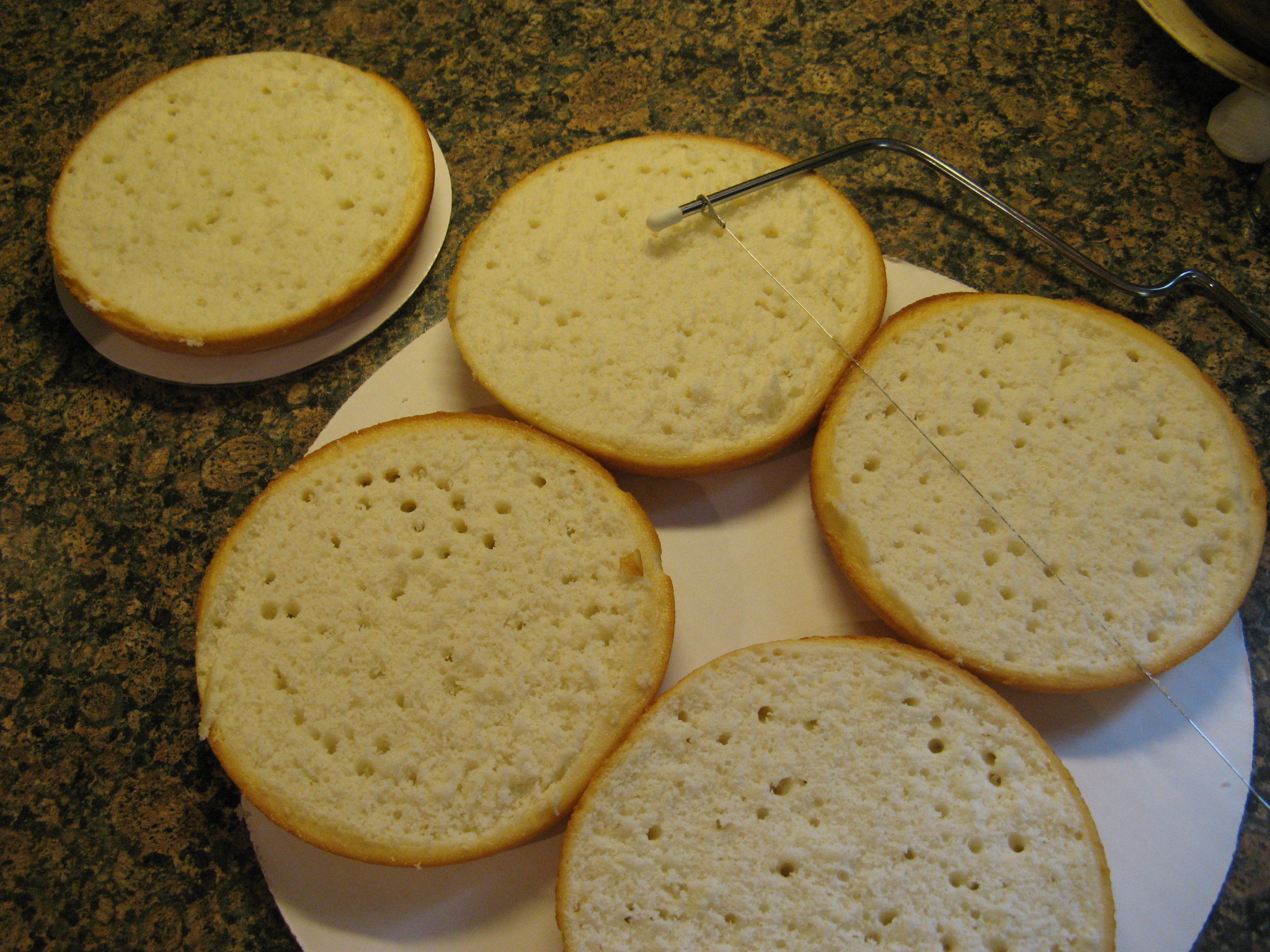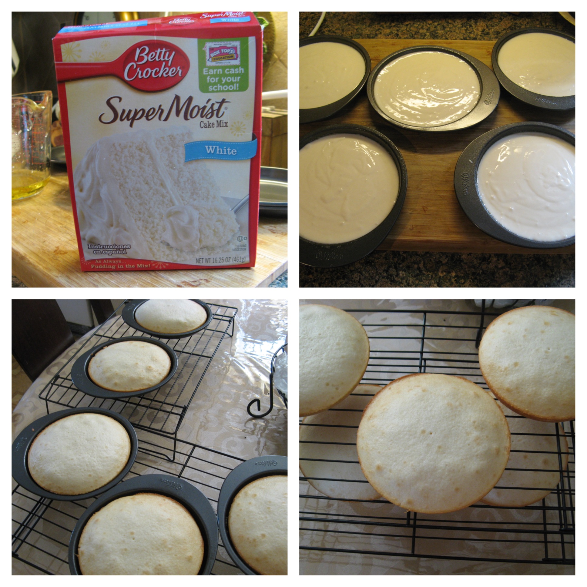 I opted to use a white cake box mix for this cake since I wanted to be sure that I would have enough batter for the five pans and right on the box it said that one box cake would suffice. After mixing the batter according to the directions on the box, I filled the pans evenly with batter (I used an ice cream scoop to be precise,) baked them and then let them cool.