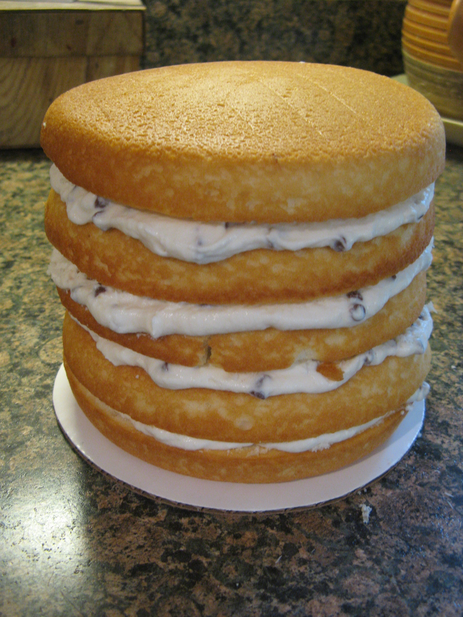 To assemble the cake, I filled each layer with about a cup and a half of cannoli filling.