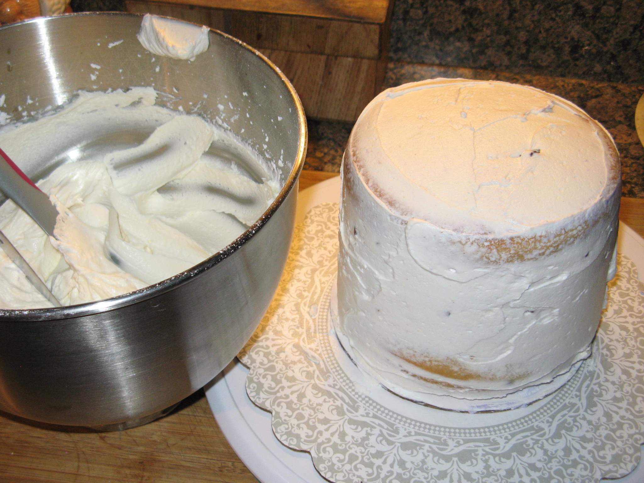 Then it was time to frost it. Initially I wanted to frost it with a whipped cream frosting, but, since I wanted to cover the entire cake with rosettes the whipped cream wasn’t going hold up well on the sides of the cake… On top of the cake it would have looked great though. So I opted to whip up some