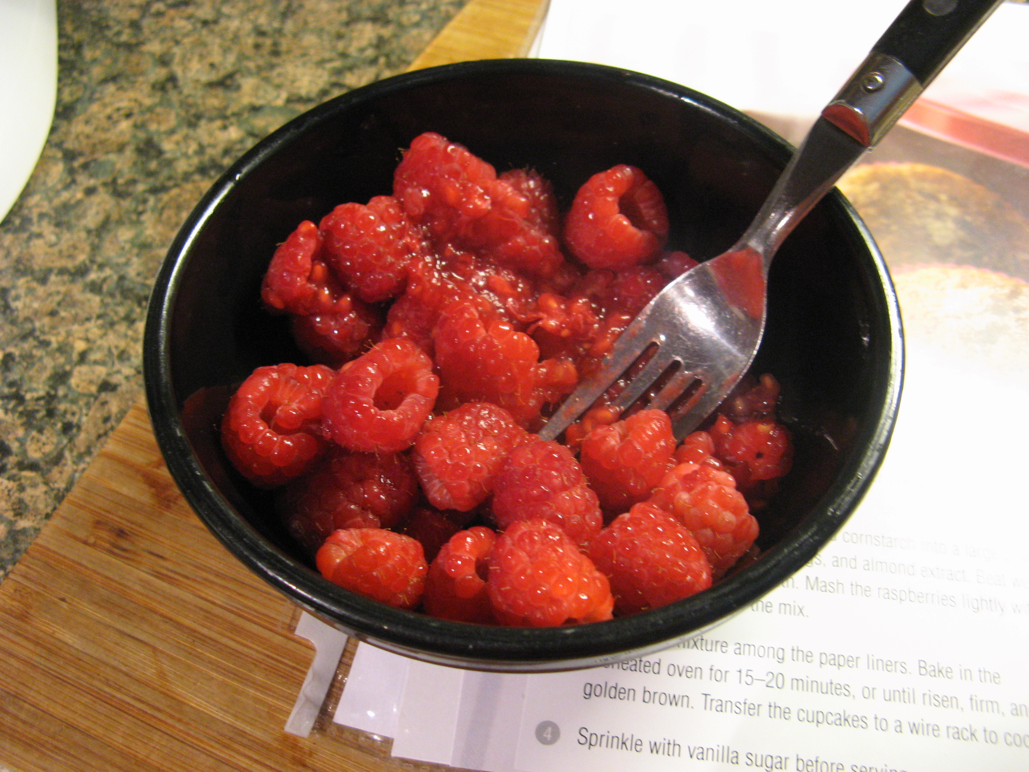 To begin, I lightly mashed a cup of fresh raspberries with a fork.