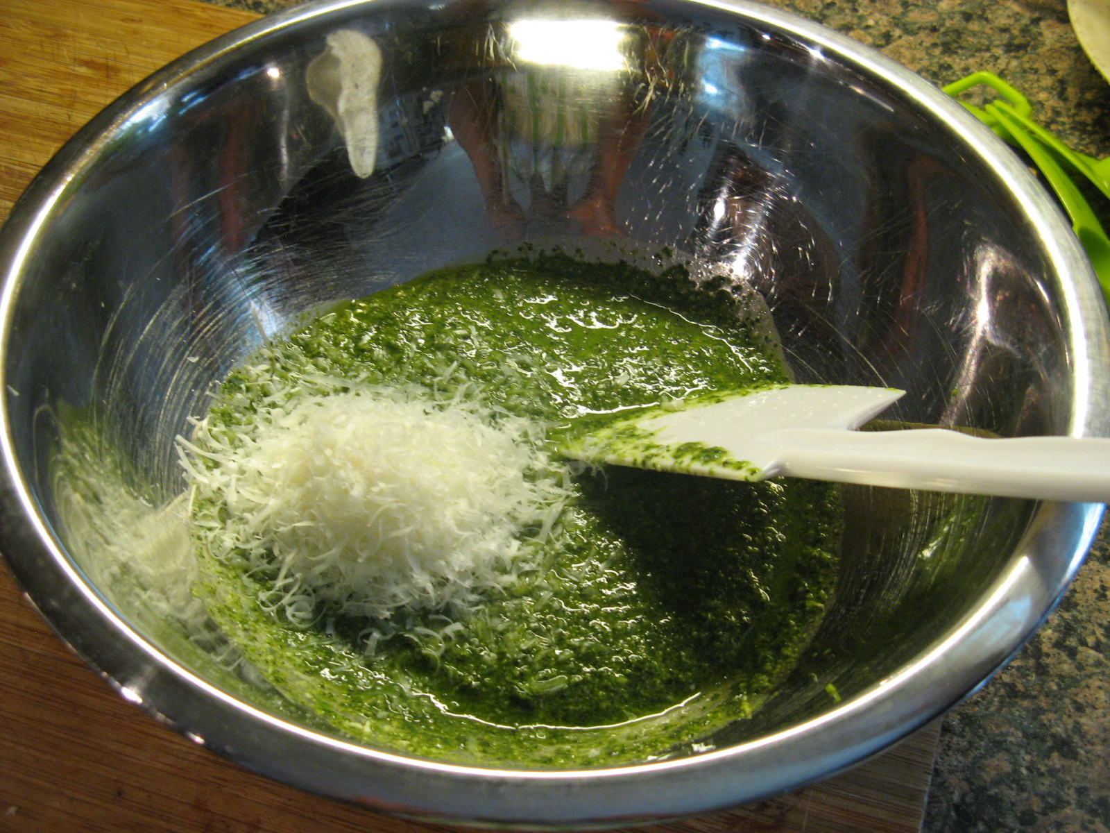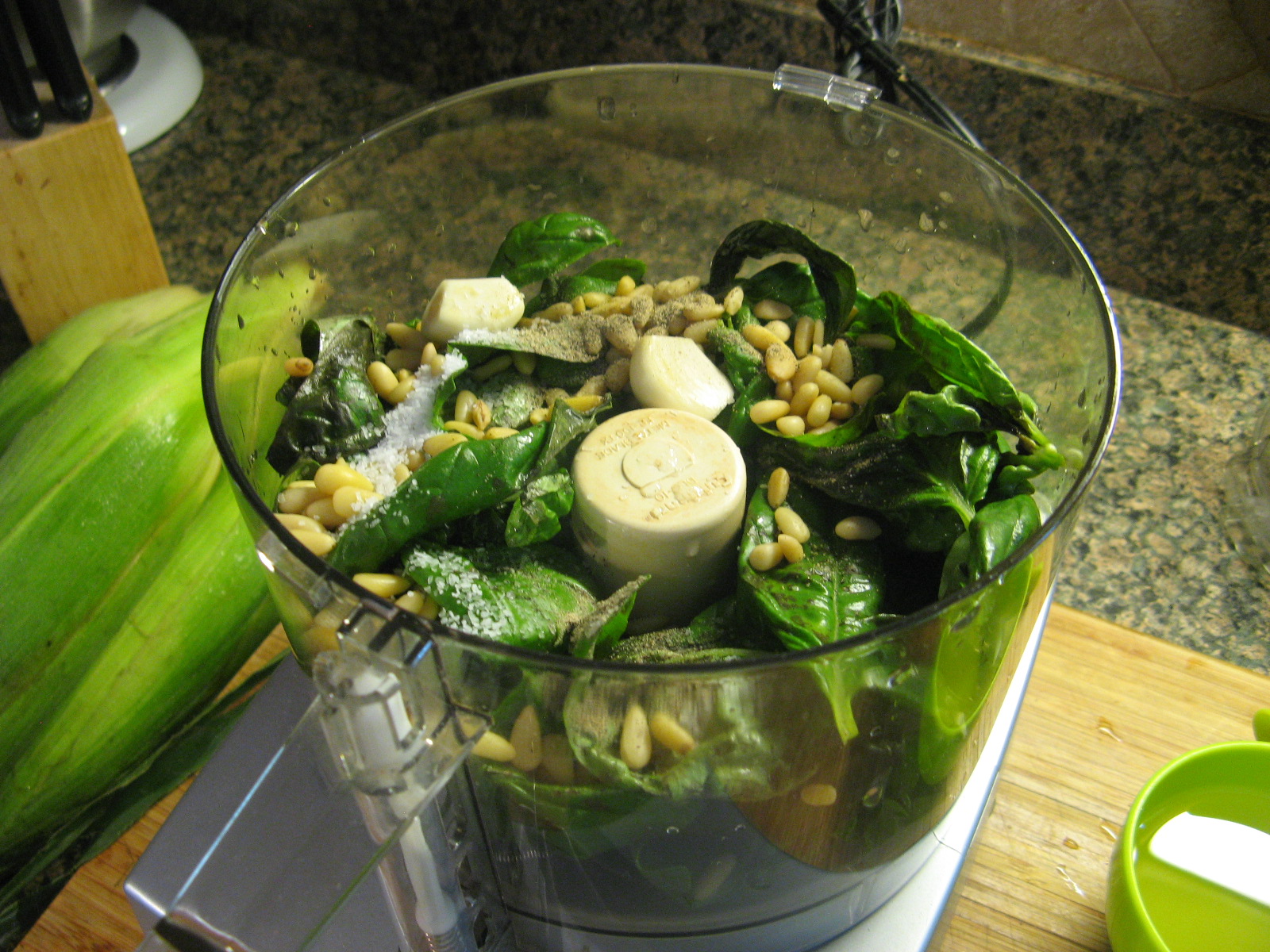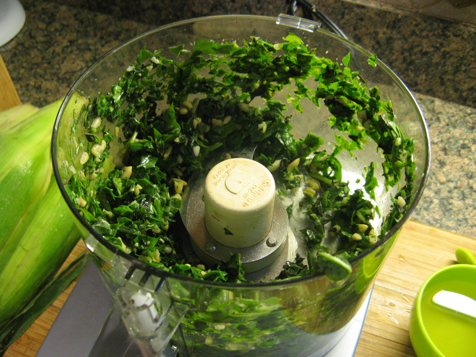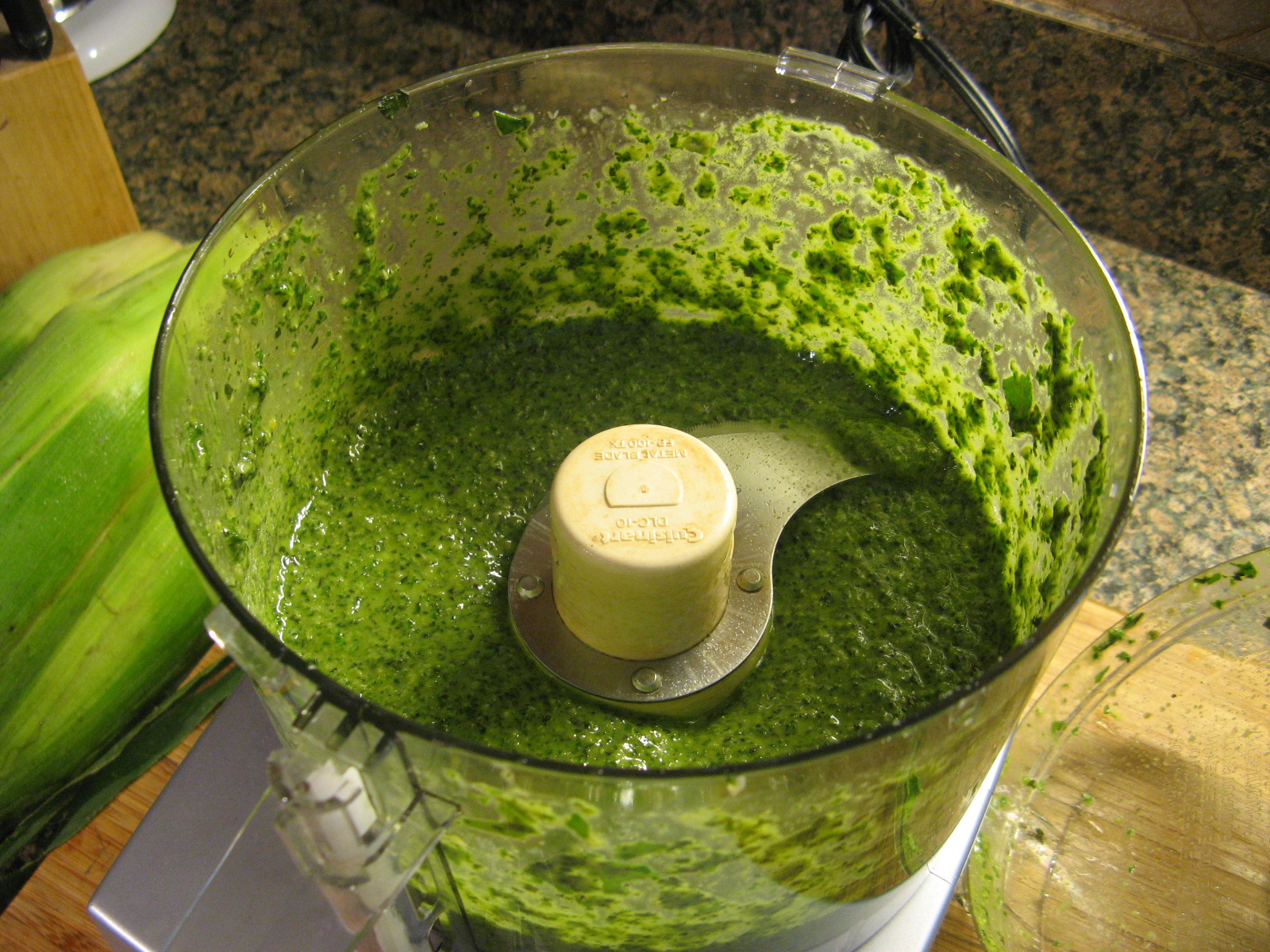 As I mentioned in a previous post I was rained-in last week and went on a bit of a cooking binge making a Chicken Corn Chowder, a Meyer Lemon Yogurt Cake and a Pesto Sauce; the latter of which I finally put to good use and made Pesto Chicken Packets – a recipe I came across in an issue of Rachael Ray Magazine a few years back. Let me take a few steps back though and go over how I made the Pesto Sauce.