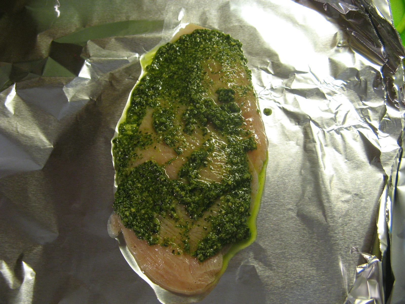 Then it was time to prep the chicken packets for the oven. I drizzled about a teaspoon of olive oil in the center of a 12-inch long sheet of aluminum foil and placed a thin-sliced chicken breast seasoned with salt and pepper on top of it. I then spread about a tablespoon of the pesto over the chicken.