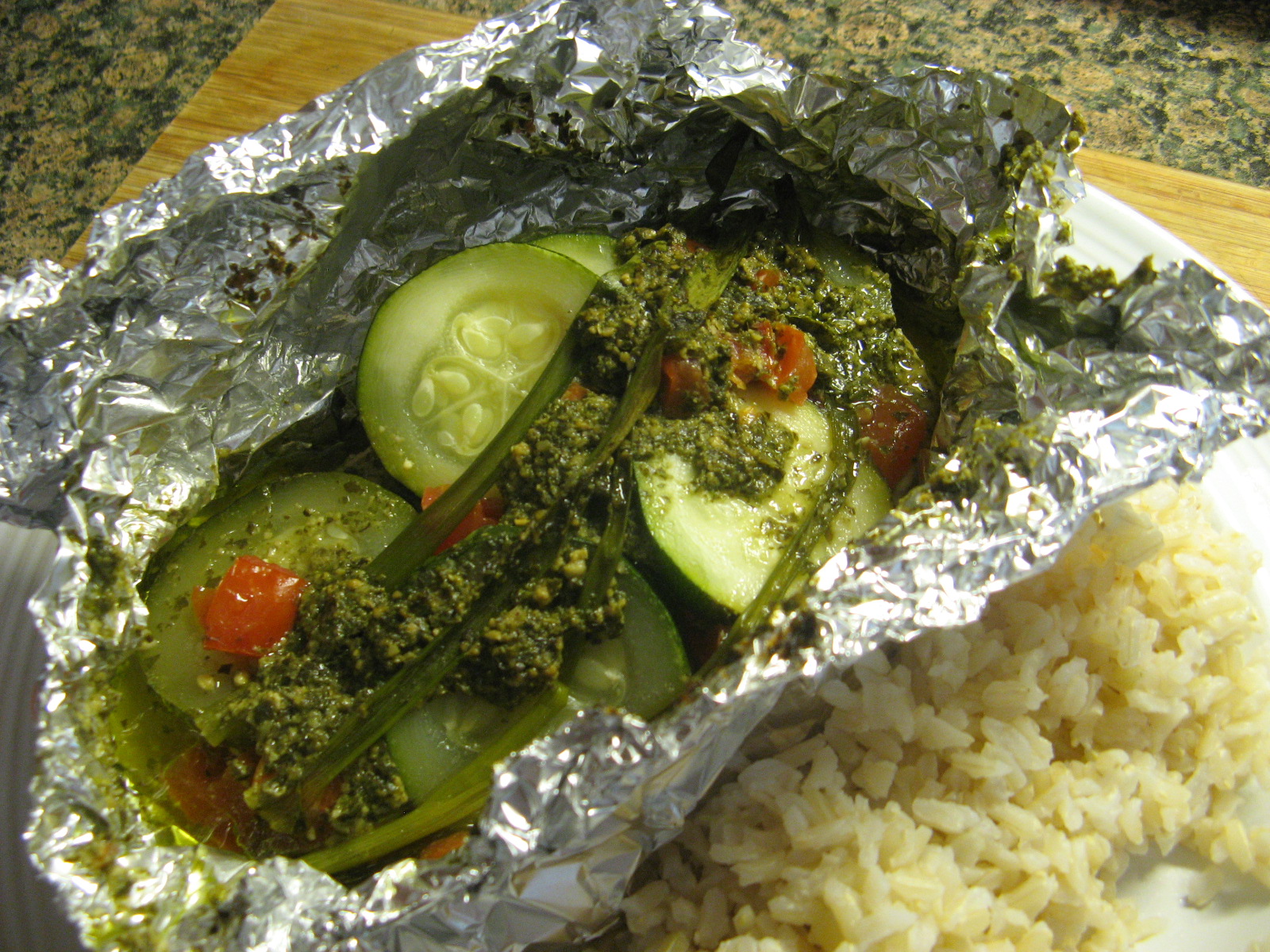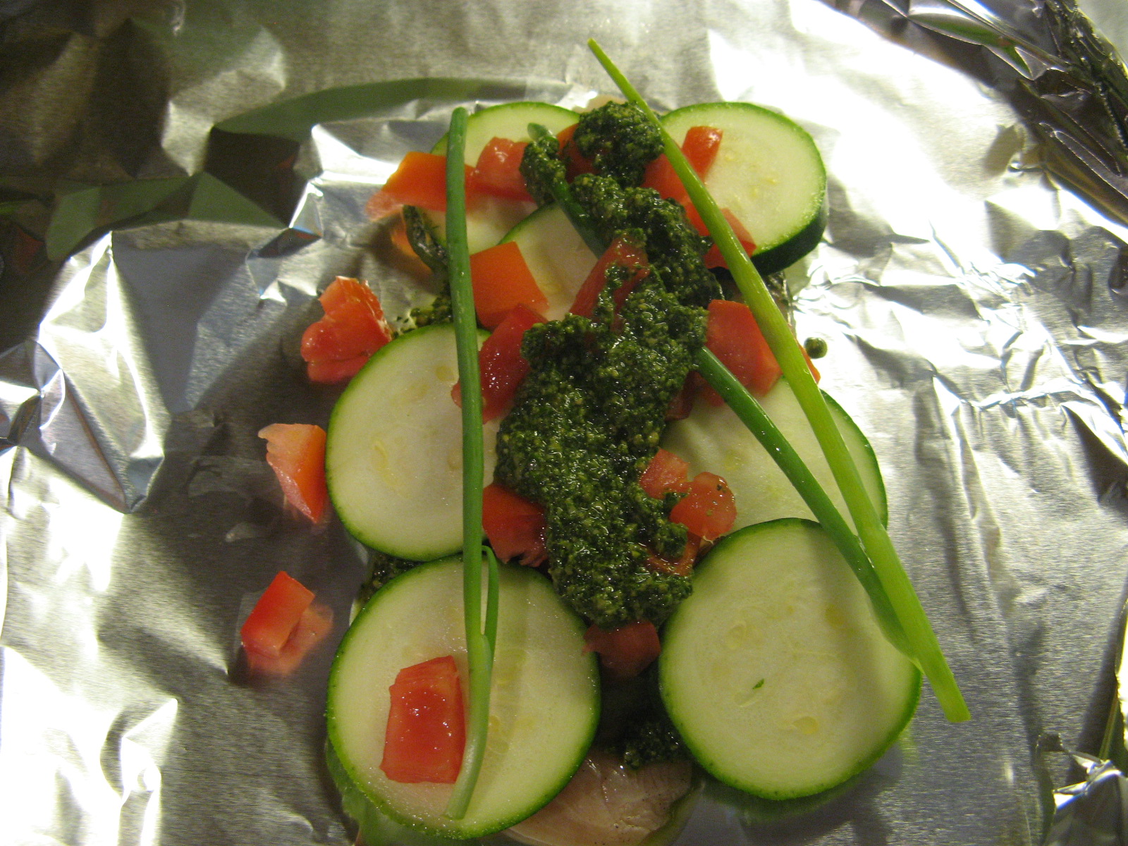 3. Mound a handful of the zucchini and tomatoes over each chicken breast along with two pieces of scallion. Dollop a few tablespoons pesto over each mound. Fold the foil over the chicken and vegetables; pinch the edges to seal.
