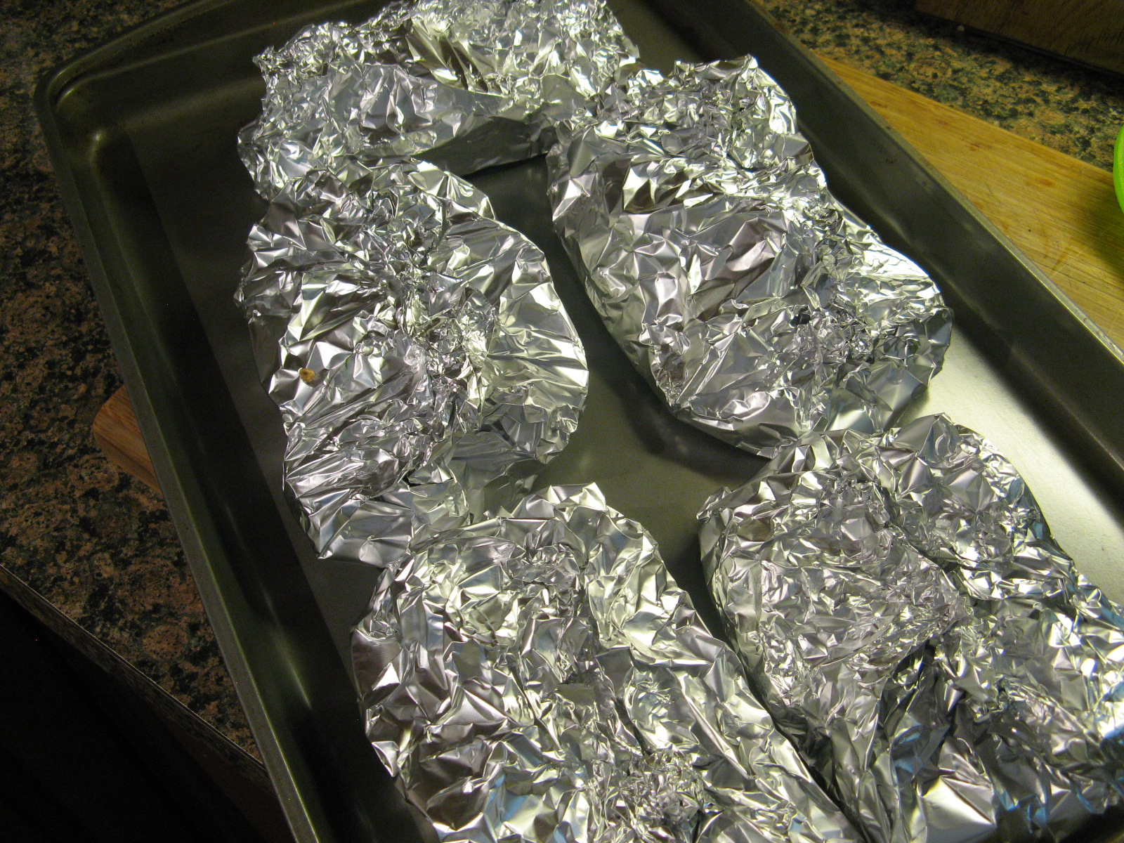 I placed all of the packets on a baking sheet and baked them in a 355 F preheated oven for 40 minutes.