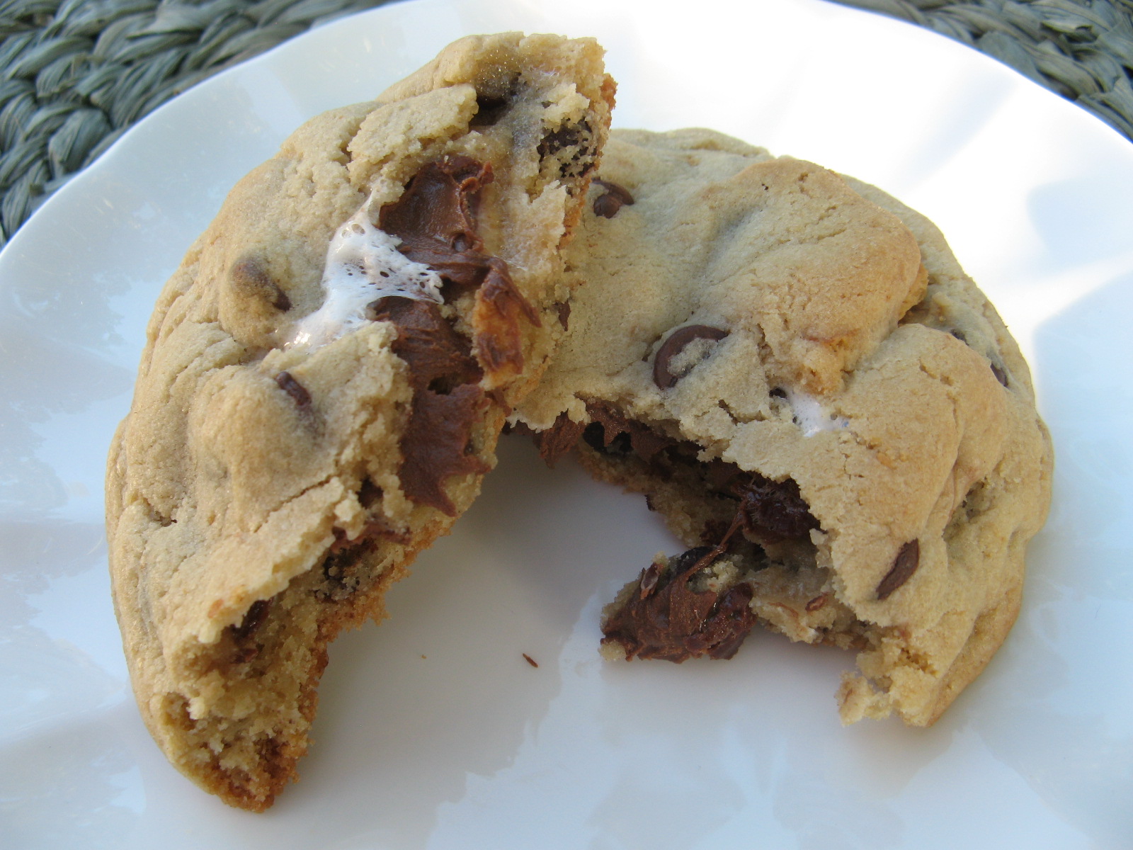 Not that long ago I finally joined Pinterest and while I am no nowhere near being an expert on it, I am getting the gist of it. Maybe with the holiday season just around the corner I’ll utilize it a bit more. Luckily I have friends who are on it who find cool things to share with me and politely hint at me to try, like S’mores Stuffed Chocolate Chip Cookies . I’ve actually never had a s’more; mainly because I am not particularly fond of marshmallows. I recall eating them as a child but chances are I ate one too many of them and got my fill. I figured since these marshmallows would melt into the cookie while baking I wouldn’t be bothered by them. And boy was I right!