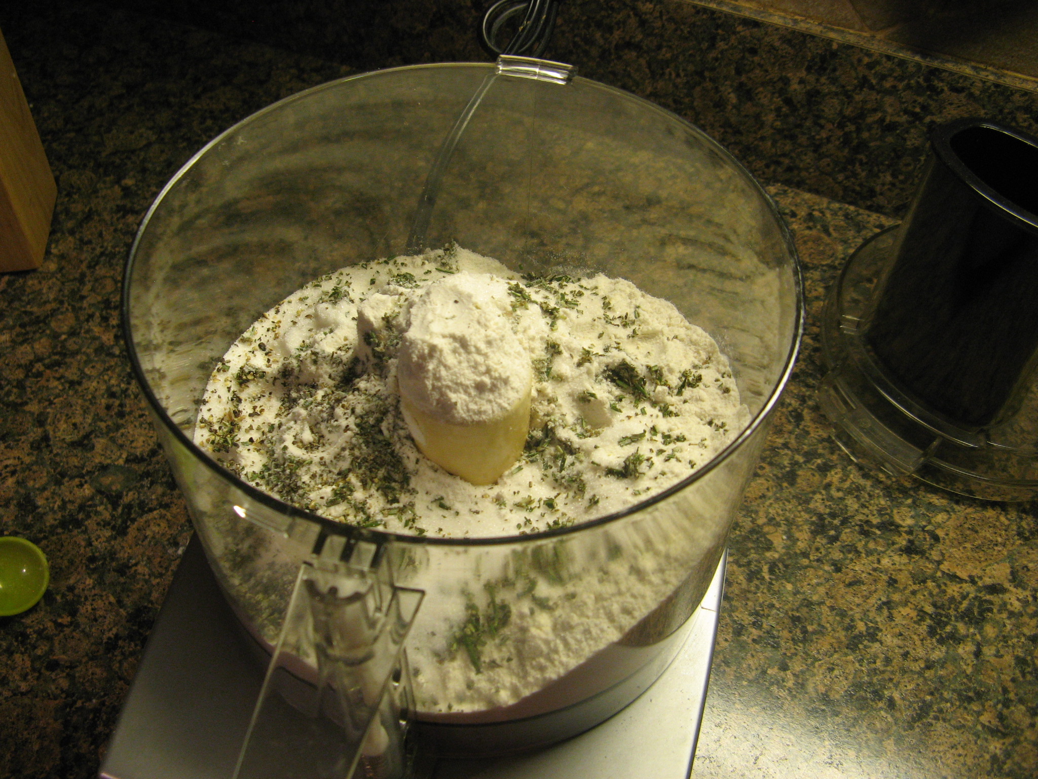 I started the torte by making the crust… I combined flour, sugar, fresh rosemary, salt and pepper in the bowl of my food processor.