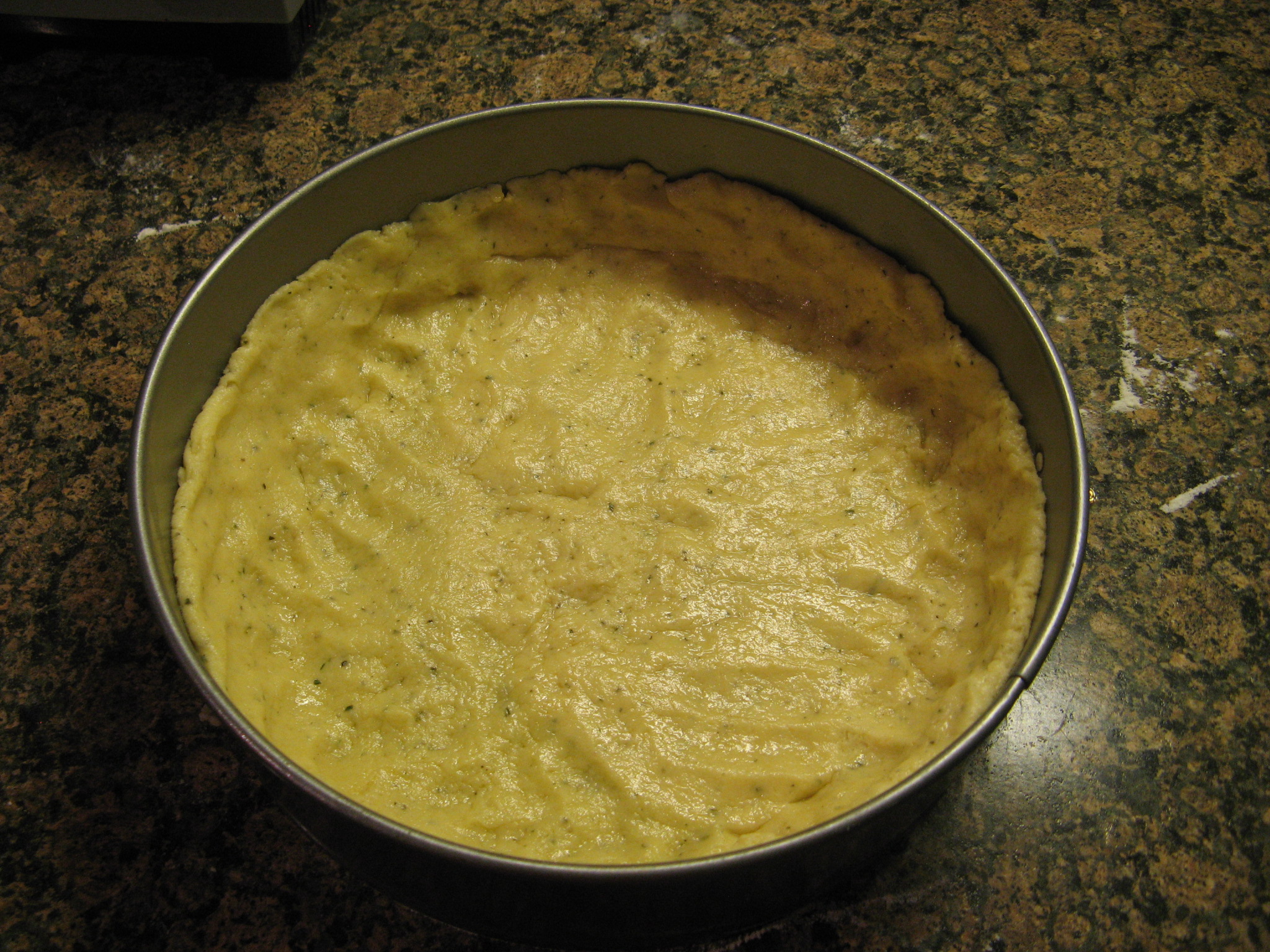 After kneading the dough on a lightly floured surface I pressed it into the bottom and halfway up the sides of a 9-inch springform pan. I then covered it and refrigerated it overnight.